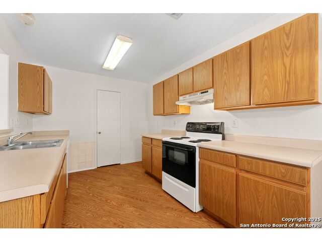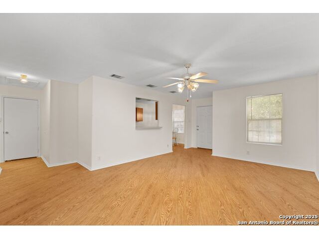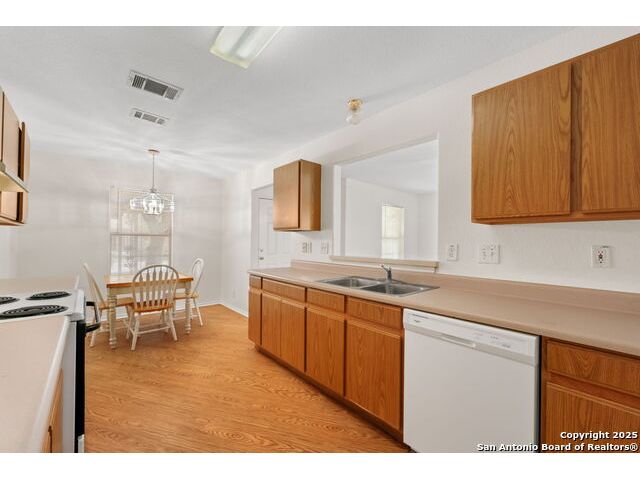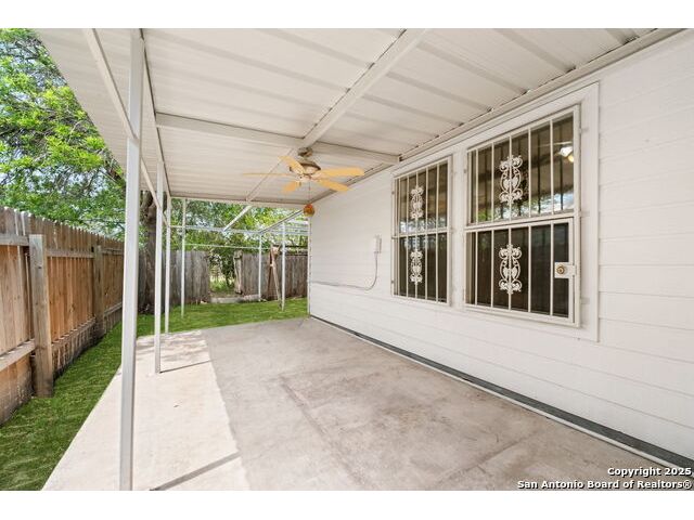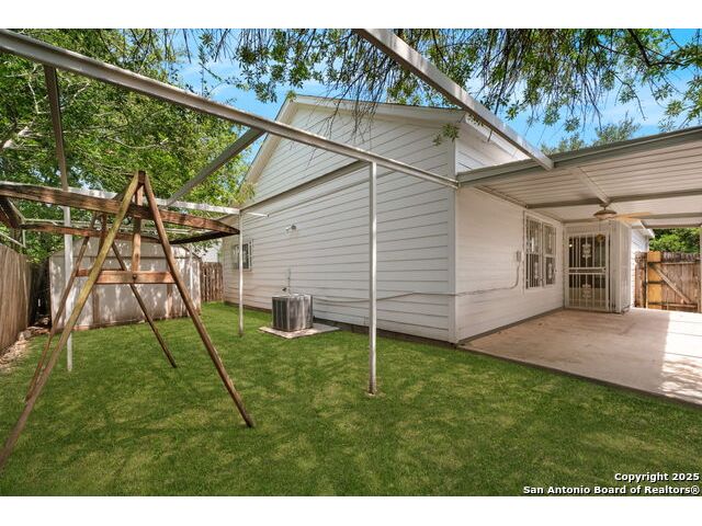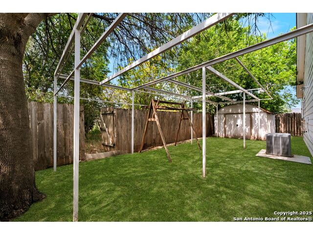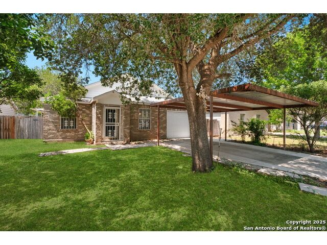 Charming one-story brick home featuring 3 bedrooms, 2 full baths, a 1-car garage plus a 1-car carport. Inside, a spacious entry leads to the spacious living room and flows perfectly into the galley kitchen and dining area-perfect for everyday living and entertaining. The backyard offers mature shade trees, a covered patio, with a privacy fence, but plenty of room to expand the backyard. Metal structure is prepped to add covering and expand patio. Storage shed conveys. With close proximity to Downtown San Antonio and quick access to Loop 410 and I-37, this home is ideal for first-time buyers or a growing family seeking convenience and room to grow.