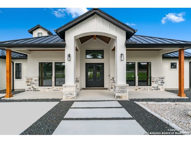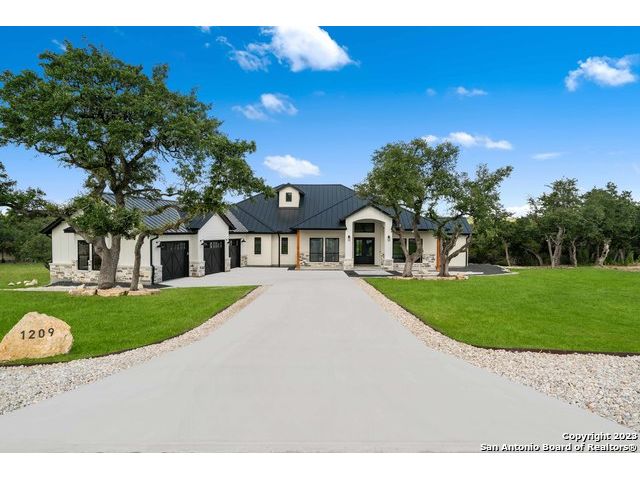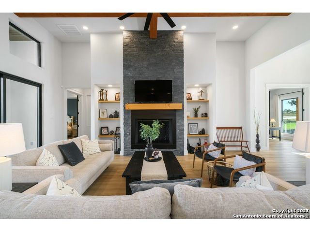 A truly custom build with charm around every corner and picture windows throughout, welcome home to hill country living at its finest. Situated on 5 acres with towering oaks, the owners suite and three additional en-suite bedrooms have all been designed with recessed ceilings, large walk-in closets, and individualized touches for the perfect place to settle in. You'll have plenty of space to spread out with the front sitting area, living room with cedar-wrapped beams, media room, front office as an optional