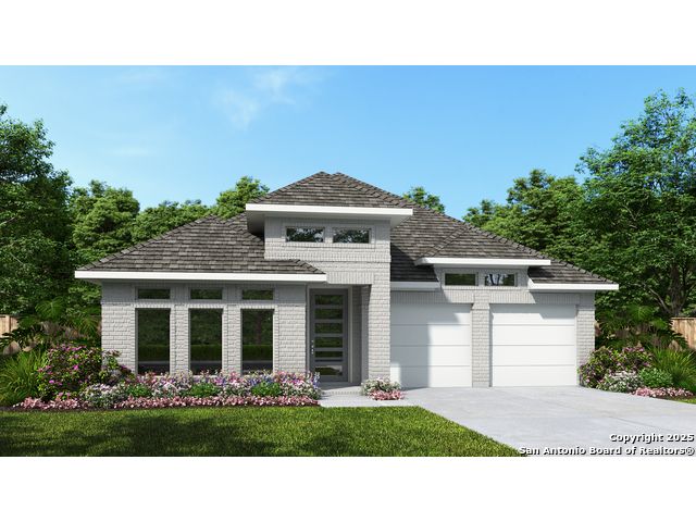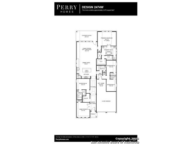 Entry with 13-foot ceilings framed by game room with French doors. Extended entry flows to the kitchen and dining area. Island kitchen with built-in seating space, 5-burner gas cooktop and a corner walk-in pantry. Family room with a wall of windows. Secluded primary suite. Primary bath offers dual vanities, freestanding tub, separate glass enclosed shower and two walk-in closets. Guest suite with a full bathroom and a walk-in closet. Secondary bedrooms and a utility room complete this one-story design. Covered backyard patio. Mud room just off the three-car garage.