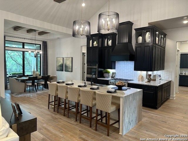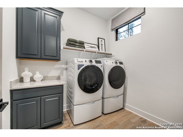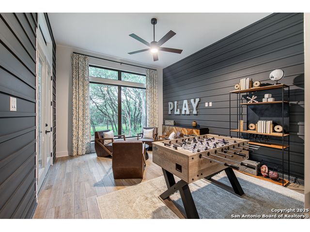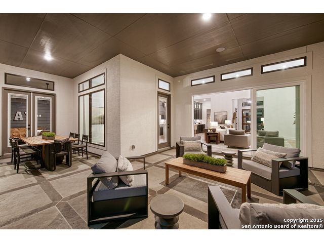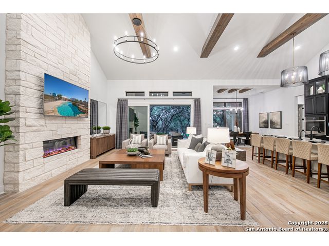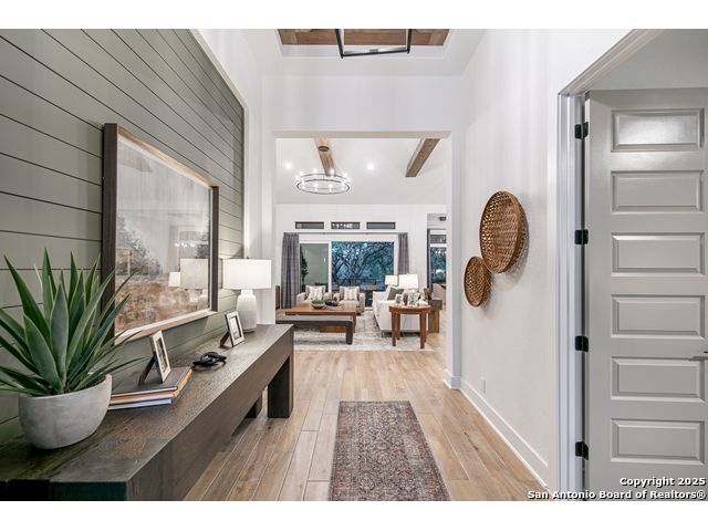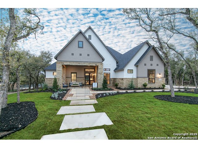 Move in Ready! Beautiful one-story home with 4 Bedrooms, 4.5 Bathrooms, 4 Car side entry garage and circular driveway on a 1/2-acre lot all nestled in a beautiful, wooded neighborhood right outside of Garden Ridge, TX. Walk in through the magnificent 6 x 8-foot Magnolia front door into this 3239 square foot home which boast and open floorplan with a fabulous kitchen with double ovens, oversized kitchen island with quartzite countertops with apron sides, and a stainless-steel farm sink. The kitchen also features beautiful upper cabinets with glass inserts and puck lighting. This home stands out with wooden shutters across the front featuring 4.5" louvers and clear line hidden tilt function. The large family room features suspended cedar beams, oversized sliding glass doors and a 60" Allusion Platinum fireplace. Enjoy your fabulous outdoor living on your oversized patio with a 42" Courtyard outdoor gas fireplace.