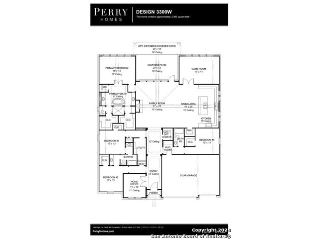 Home office with French doors set at entry with 12-foot ceiling. Extended entry leads to open family room, dining area and kitchen with 16-foot ceilings throughout. Family room features a wood mantel fireplace and wall of windows. Kitchen features walk-in pantry, generous counter space, two wall ovens, 5-burner gas cooktop and oversized island with built-in seating space. Game room with wall of windows just off dining area. Primary suite includes bedroom with wall of windows. Primary bath features 11-foot ceiling, dual vanities, freestanding tub, separate glass-enclosed shower and two walk-in closets. A Hollywood bath adds to this spacious four-bedroom home. Covered backyard patio with 16-foot ceiling. Mud room off three car-garage.