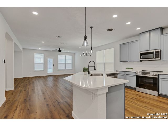 Make this beautifully updated house your future home! This one story home offers an open concept for you to entertain your family and guests. Updates in the home include new paint throughout the home, new vanities in all restrooms, new waterproof luxury vinyl planks throughout entire home, new light fixtures, an a beautiful quartz island/kitchen, new range/oven/dishwasher/microwave. The community offers many amenities including a gated entry, pool, bbq area, and a basketball court. The home is also centrally located to Sea World, Fiesta Texas, Northwest vista college, UTSA, La Cantera, Lackland AFB, 1604 and 151 corridor making it easy to travel within the city.