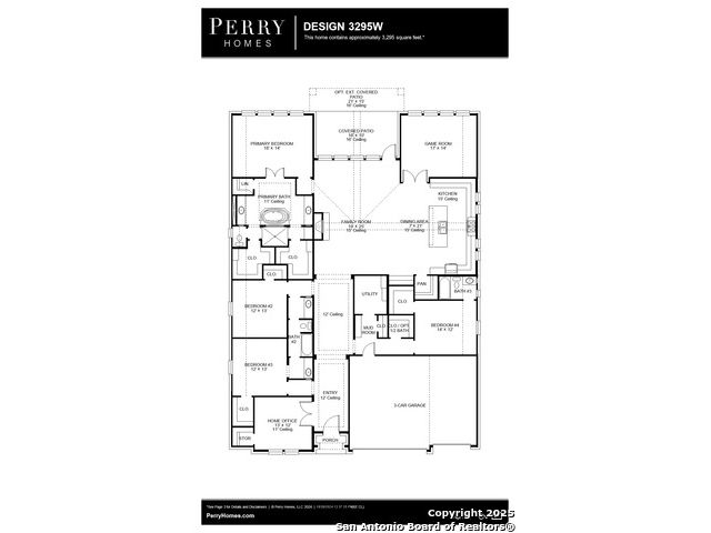 READY FOR MOVE-IN! Home office with French doors set at entry with 12-foot ceiling. Hardwood floors throughout living areas. Extended entry leads to open family room, dining area and kitchen with 17-foot ceilings throughout. Family room features wall of windows and a wood mantel fireplace. Kitchen features generous counter space, double wall oven, walk-in pantry and island with built-in seating space. Primary suite with wall of windows. Double doors lead to primary bath with 11-foot ceiling, dual vanities, freestanding tub, separate glass-enclosed shower and two walk-in closets. Game room with French doors features wall of windows. A guest suite plus abundant closet and storage space add to this open one-story design. Extended covered backyard patio with 16-foot ceiling. Mud room off three-car garage.