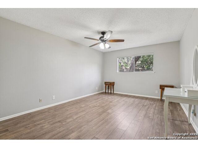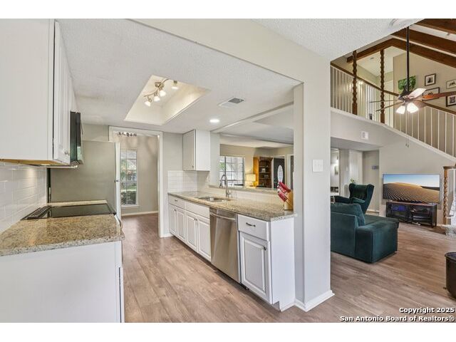 Located in the picturesque San Pedro Hills, this captivating community is distinguished by its roaming deer population and distinctive homes that reflect the unique charm of Texas hill country style homes. This two-story dwelling features an open-concept design with lofty ceilings, a central fireplace that anchors the main living area, and provides ample space for dining and breakfast seating. The kitchen has undergone a comprehensive renovation, boasting new cabinets, countertops, and backsplash. This sun-drenched space has been enhanced with the recent installation of automatic blinds, ensuring optimal privacy and ambiance. The master bedroom is situated on the ground floor, while the three additional bedrooms are located upstairs, fostering a sense of separation and space. The beautifully crafted banister overlooks the open floor plan, creating a visually stunning display and entertainment area. This residence is conveniently situated near the airport, shopping centers, and dining establishments, including 1604/281 and Wurzbach Parkway. Nestled on a corner cul-de-sac with side-entry parking on a quiet, dead-end street, this home offers extensive frontage, separation, and xeriscaped landscaping, minimizing lawn care requirements. This remarkable property is an absolute must see !