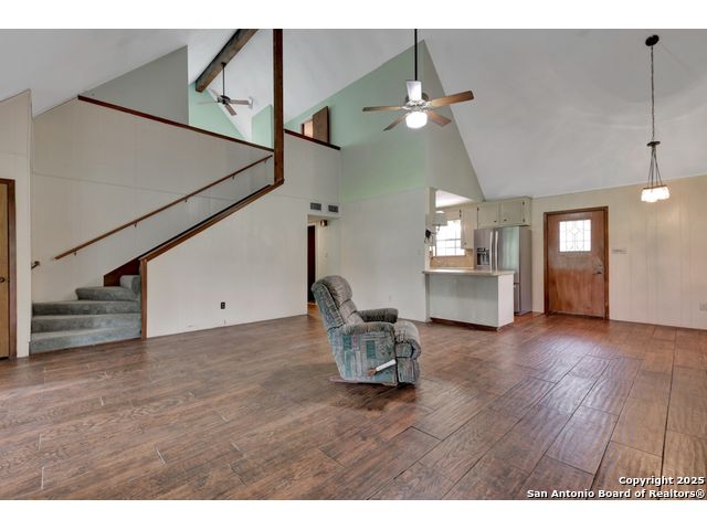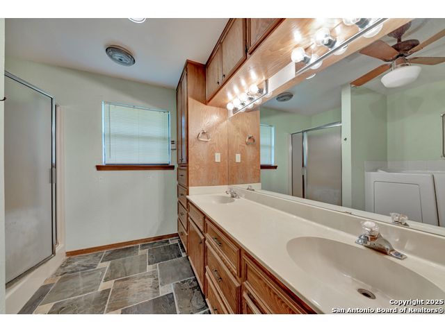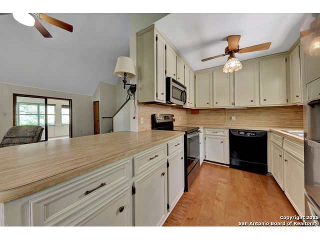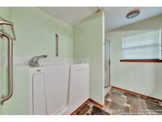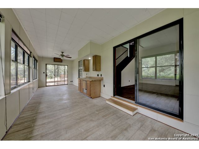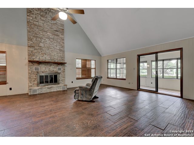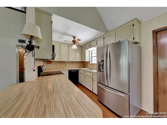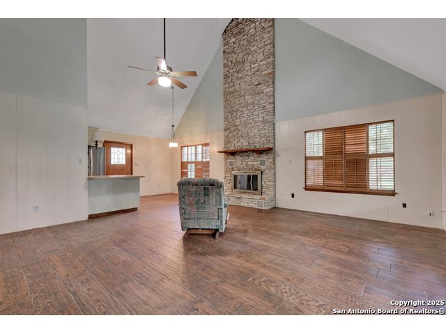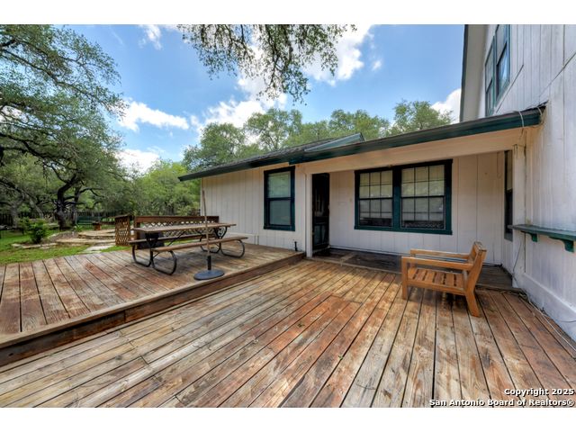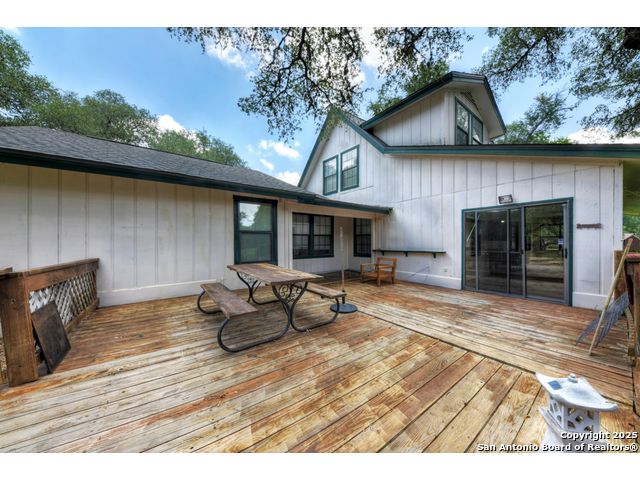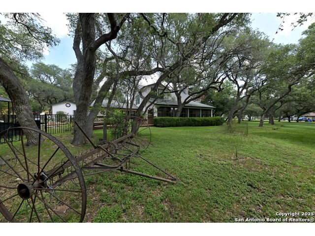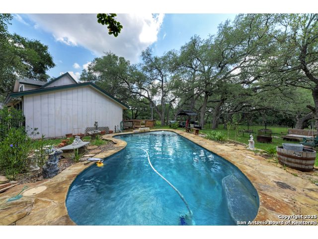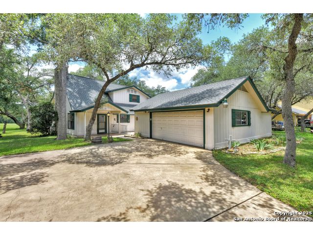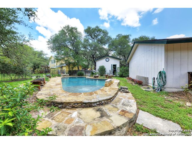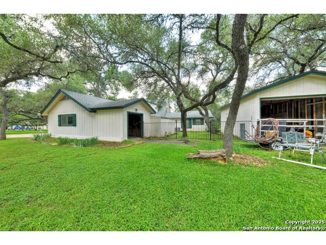 Nestled on a generous double lot totaling 0.48 acres, this unique property offers stunning golf course frontage along the 17th hole of the Double J Ranch Golf Club in scenic Wimberley, Texas. Originally built in 1979 by builder Ray Pingray, the home features an open-concept living space that highlights a striking stone fireplace, a sunroom with kitchenette and an inviting outdoor patio overlooking an in-ground pool added in 2016. The open loft is the 3rd bedroom with bath facilities, closet and windows. The primary suite offers a walk-in closet, a Hydro Dimensions walk-in tub, and a separate shower. The kitchen comes fully equipped, with the refrigerator, stove and dishwasher all conveying. Major systems have been thoughtfully updated, including HVAC (2019), hot water heater (2021), and roof (2025). A detached two-car garage 420 sqft includes attic storage and a workshop area, with a rear golf cart garage and roll-up door for added convenience. The double garage has 744 sqft w/garage door and keyed exterior door w/fenced 30x20 ft side yard houses the pool equipment, including a two-speed pump. This one-of-a-kind home offers character, functionality, and an unbeatable location for golf lovers.