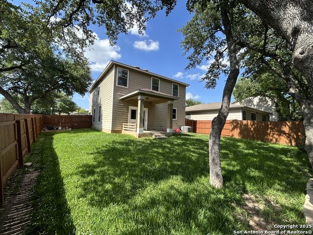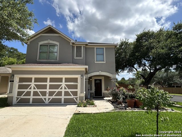 Spacious 4/2.5, 2,095 sqft two-story home on oak tree shaded corner lot; Nice size family room with hang on wall decorative fireplace, open to dining and kitchen; Country Kitchen has breakfast bar, stainless dishwasher, black stove. Very large dining area and kitchen breakfast bar with French doors to rear covered patio; Large laundry room with extra storage area and hidden storage under stairs; Large primary suite, primary bath has soaking tub, separate shower and double vanities with spacious walk-in closet with shelves; three additional bedrooms with full bath upstairs; The upstairs hallway was built very wide, enough to place a study desk or work table or play tables; Security system and water softener system owned; Numerous updates include recent luxury vinyl plank downstairs and upstairs, dual down and up programable thermostats, remote open/close garage door opener with camera, recently painted interior and garage, recent French doors with dog door; Stucco exterior; Corner lot, sidewalks, great trees and shade, landscaped, luscious grass, front covered porch, rear covered patio, privacy fenced yard; Short walk to mail, HOA park and elementary.