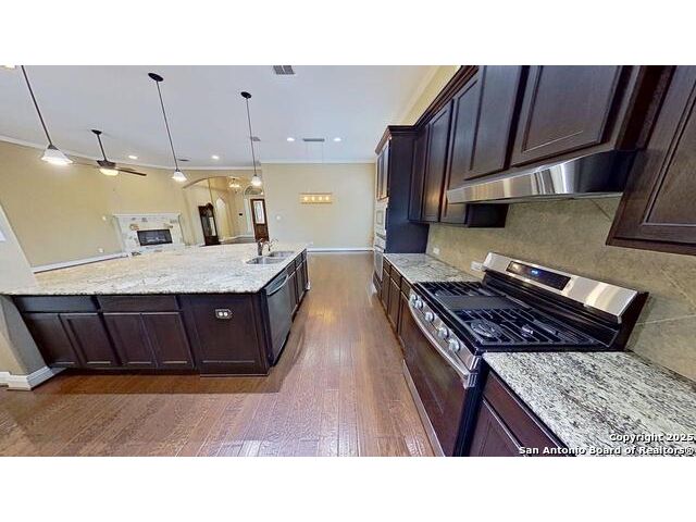 Stunning one-story home located in a quiet, gated community with exceptional designer upgrades throughout. This open-concept floor plan features rich wood-look tile flooring, abundant natural light, and a striking stone fireplace with hearth and mantel. The gourmet kitchen offers a large granite island with bar seating, 42" cabinets, stainless steel appliances, a gas cooktop, walk-in pantry, and a convenient built-in workstation-ideal for remote work or meal planning. A versatile study off the entry can serve as a home office, gym, or guest room. The enclosed patio with natural gas hookup extends the living area, providing the perfect setting for entertaining, relaxation or even a library/reading room. The spacious primary suite includes dual vanities, an oversized walk-in shower, and a jetted garden tub. Additional features include a water softener and filtration system, irrigation system, natural gas heat, and a utility room conveniently located near the kitchen. Thoughtful upgrades and quality finishes throughout make this home a perfect blend of style, comfort, and functionality. Ask about closing cost assistance. Realtor is related to seller.