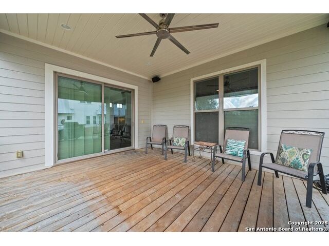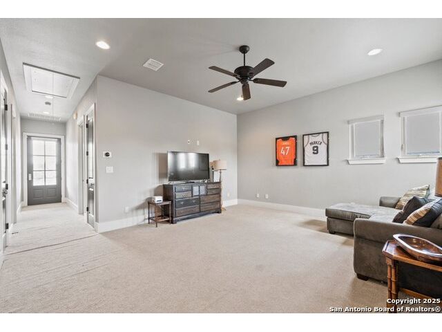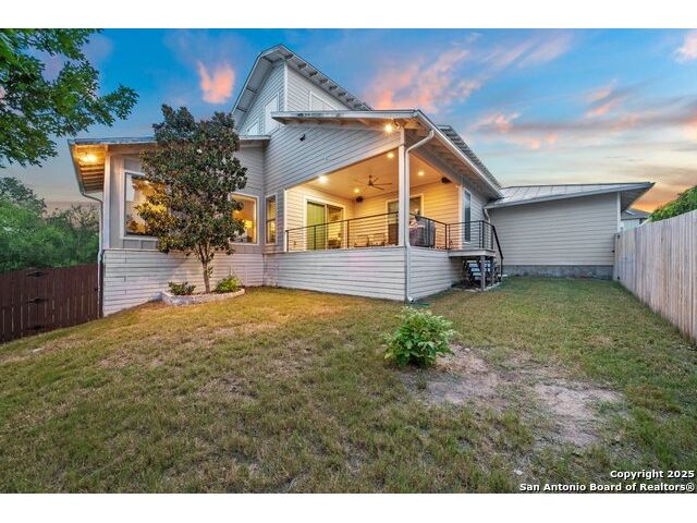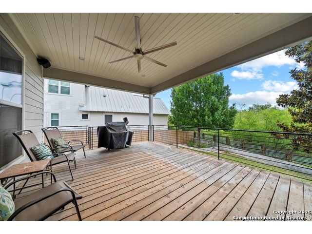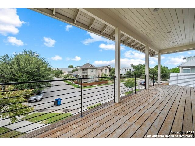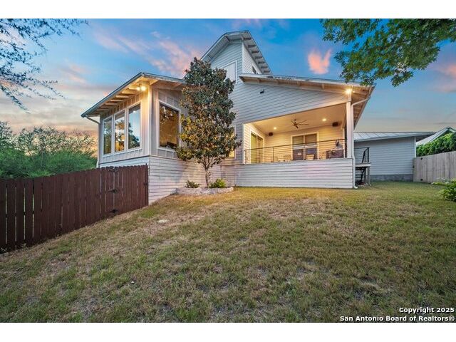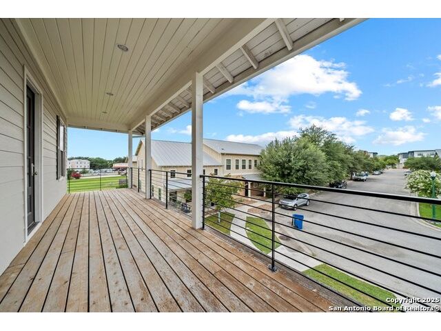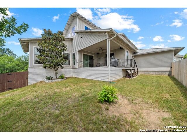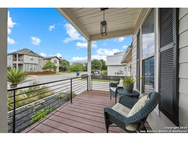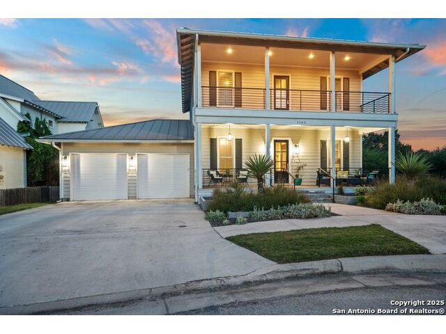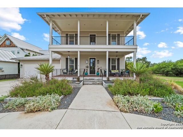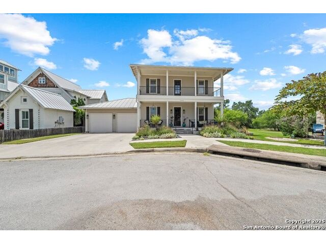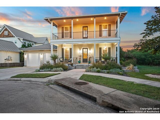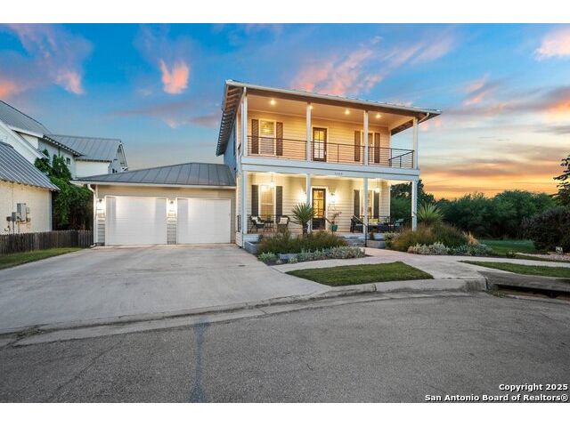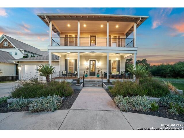 A cure for the common home: modern farmhouse style with Southern Coastal and Lowcountry design. The symmetrical front facade's central entry opens to a welcoming foyer with visually striking diagonal checkerboard tile inlay flooring, where the sense of grandeur begins. Past the library and stairwell, glamour abounds in a bright, open-concept living and kitchen space. Soaring double-height ceilings with exposed wooden beams lined with track lighting give architectural drama and warmth. Multiple clerestory windows create a seamless connection to the outdoors and light. Plantation shutters throughout and Hunter Douglas electric shades offer privacy and light control. Gorgeous owners retreat with ensuite bath boasting double vanity, walk-in shower and expansive walk-in closet separated into two sections. Continuing on the main level, a sliding glass door connects a big covered deck to the main living area. Convenience such as a full bedroom and bathroom down plus the utility room between home and garage ties the essentials together on a single, main level. Moving upstairs, a large landing serves as a 2nd living area. Down the hall there's two full bedrooms, a full bath and a door leading to the 2nd floor balcony over looking the front. And moving to the very top, a beautiful room perfect for whatever use you'd like, with windows capturing commanding and distant views. All from fabulous Town Creek, a thoughtfully planned urban neighborhood just outside downtown. Combining modern living with small-town charm, it blends the convenience of urban life with the comfort of a close-knit neighborhood. A modern alternative to traditional suburbia, rooted in the vibrant culture and fascinating history that make New Braunfels exactly like nowhere else.