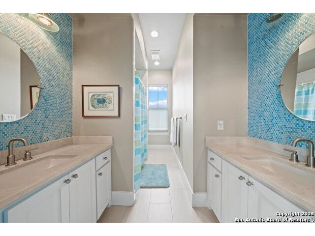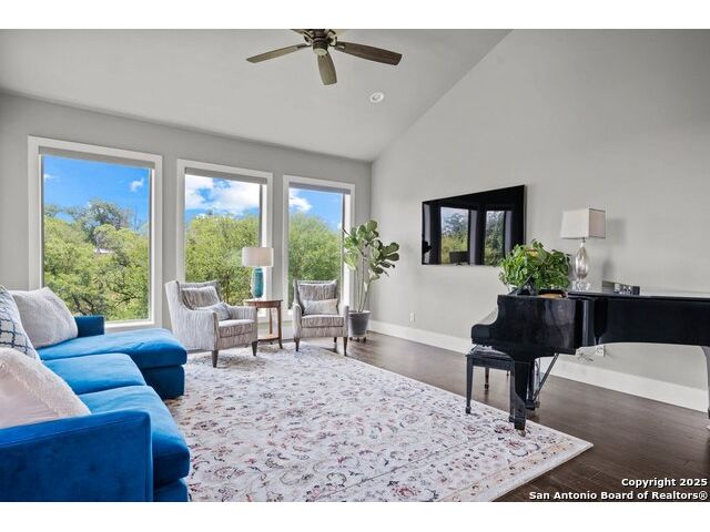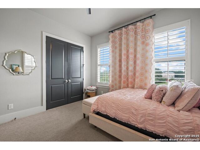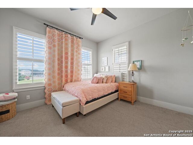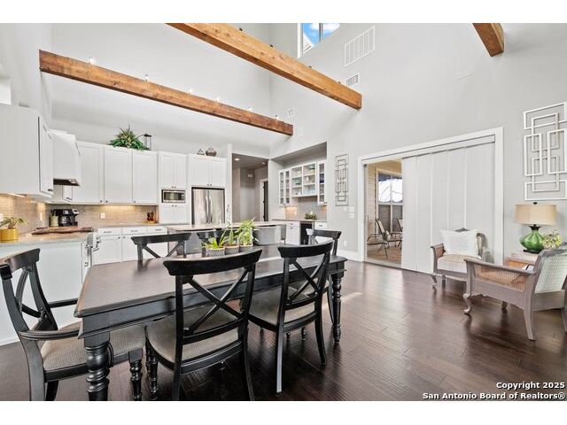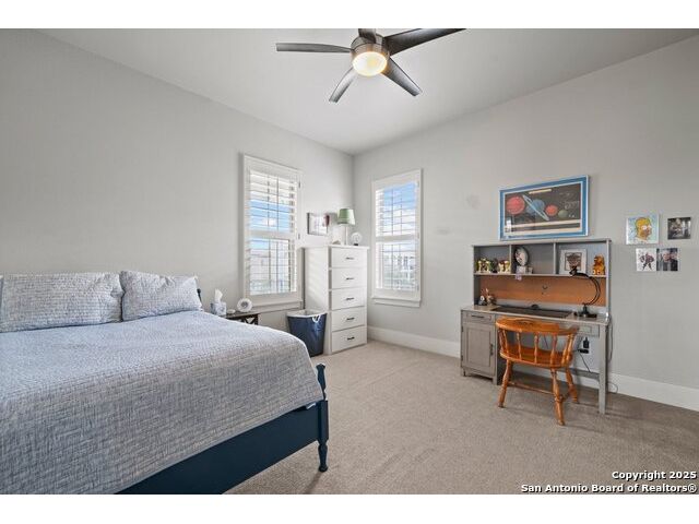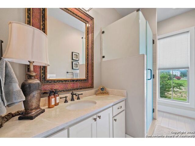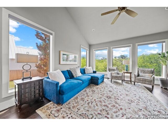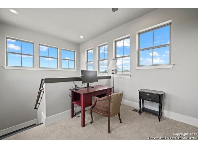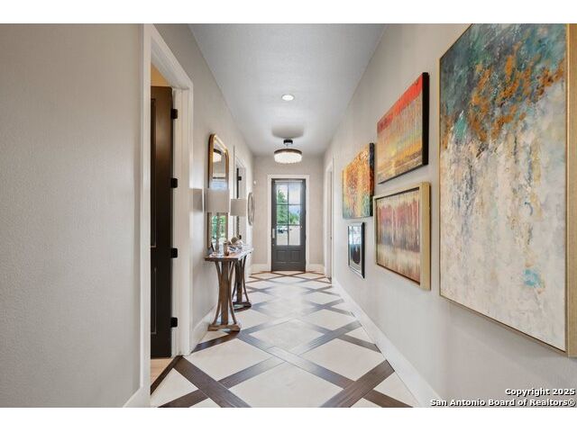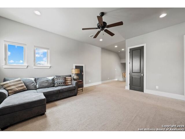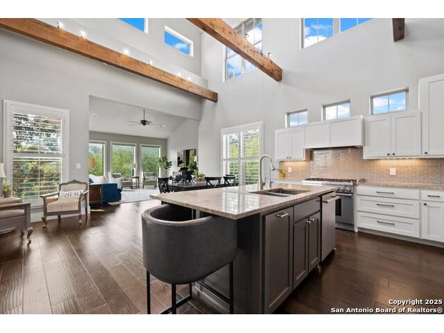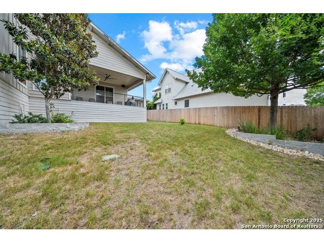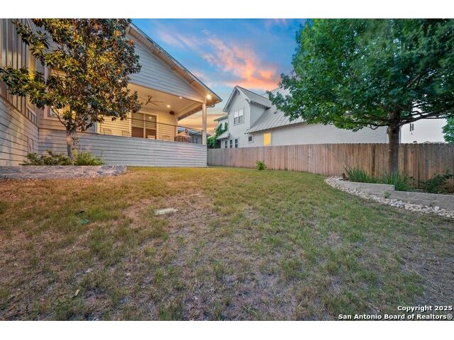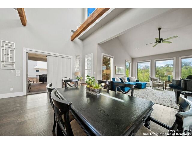 A cure for the common home: modern farmhouse style with Southern Coastal and Lowcountry design. The symmetrical front facade's central entry opens to a welcoming foyer with visually striking diagonal checkerboard tile inlay flooring, where the sense of grandeur begins. Past the library and stairwell, glamour abounds in a bright, open-concept living and kitchen space. Soaring double-height ceilings with exposed wooden beams lined with track lighting give architectural drama and warmth. Multiple clerestory windows create a seamless connection to the outdoors and light. Plantation shutters throughout and Hunter Douglas electric shades offer privacy and light control. Gorgeous owners retreat with ensuite bath boasting double vanity, walk-in shower and expansive walk-in closet separated into two sections. Continuing on the main level, a sliding glass door connects a big covered deck to the main living area. Convenience such as a full bedroom and bathroom down plus the utility room between home and garage ties the essentials together on a single, main level. Moving upstairs, a large landing serves as a 2nd living area. Down the hall there's two full bedrooms, a full bath and a door leading to the 2nd floor balcony over looking the front. And moving to the very top, a beautiful room perfect for whatever use you'd like, with windows capturing commanding and distant views. All from fabulous Town Creek, a thoughtfully planned urban neighborhood just outside downtown. Combining modern living with small-town charm, it blends the convenience of urban life with the comfort of a close-knit neighborhood. A modern alternative to traditional suburbia, rooted in the vibrant culture and fascinating history that make New Braunfels exactly like nowhere else.