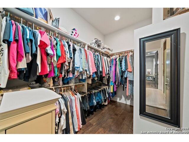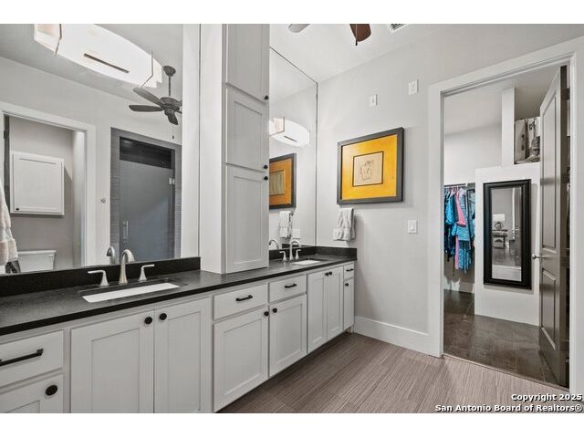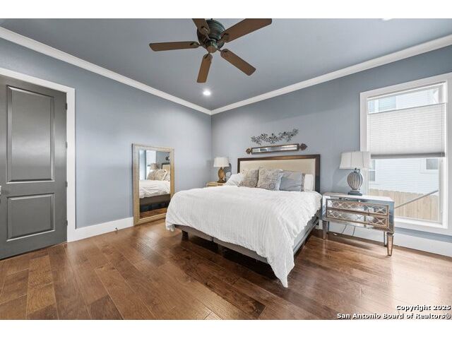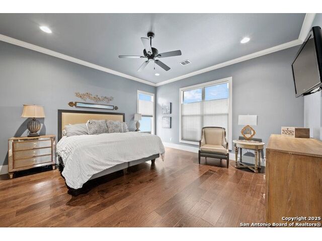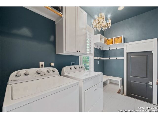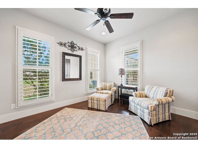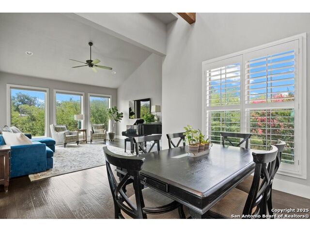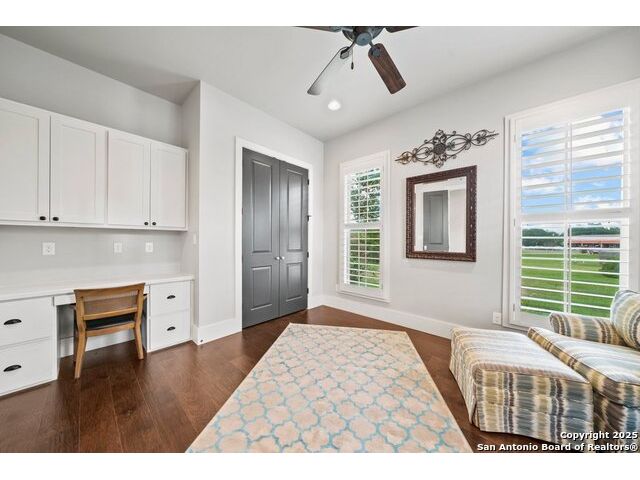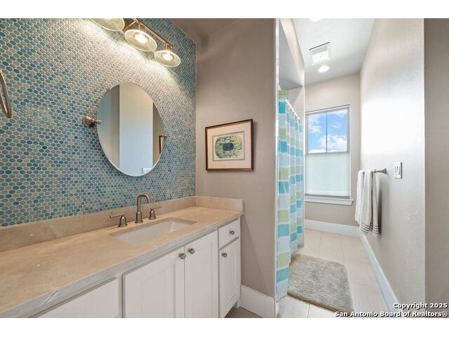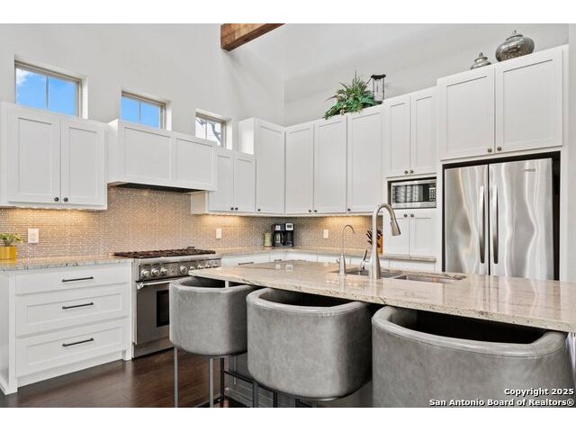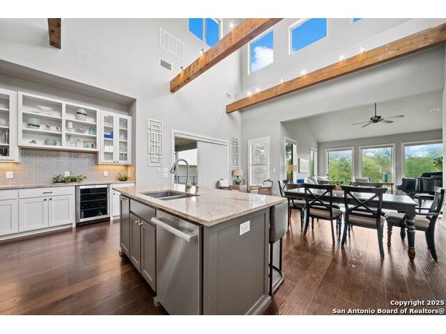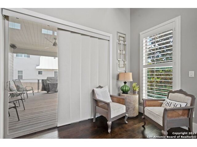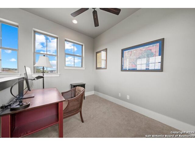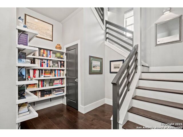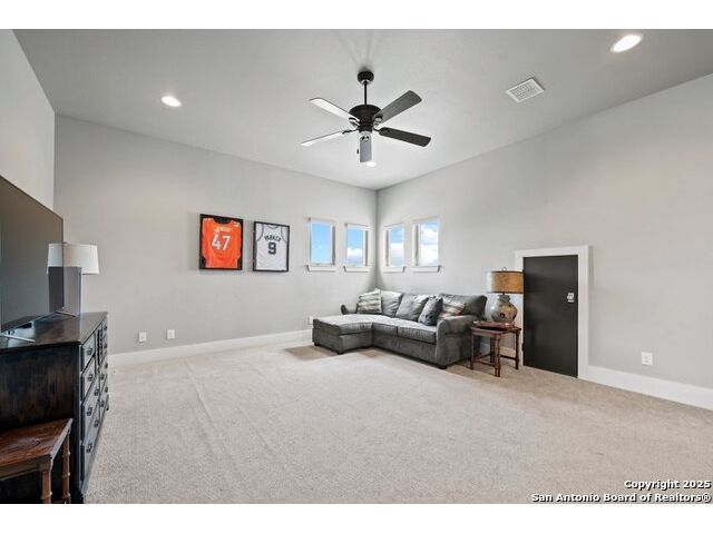 A cure for the common home: modern farmhouse style with Southern Coastal and Lowcountry design. The symmetrical front facade's central entry opens to a welcoming foyer with visually striking diagonal checkerboard tile inlay flooring, where the sense of grandeur begins. Past the library and stairwell, glamour abounds in a bright, open-concept living and kitchen space. Soaring double-height ceilings with exposed wooden beams lined with track lighting give architectural drama and warmth. Multiple clerestory windows create a seamless connection to the outdoors and light. Plantation shutters throughout and Hunter Douglas electric shades offer privacy and light control. Gorgeous owners retreat with ensuite bath boasting double vanity, walk-in shower and expansive walk-in closet separated into two sections. Continuing on the main level, a sliding glass door connects a big covered deck to the main living area. Convenience such as a full bedroom and bathroom down plus the utility room between home and garage ties the essentials together on a single, main level. Moving upstairs, a large landing serves as a 2nd living area. Down the hall there's two full bedrooms, a full bath and a door leading to the 2nd floor balcony over looking the front. And moving to the very top, a beautiful room perfect for whatever use you'd like, with windows capturing commanding and distant views. All from fabulous Town Creek, a thoughtfully planned urban neighborhood just outside downtown. Combining modern living with small-town charm, it blends the convenience of urban life with the comfort of a close-knit neighborhood. A modern alternative to traditional suburbia, rooted in the vibrant culture and fascinating history that make New Braunfels exactly like nowhere else.