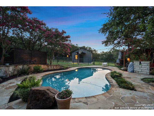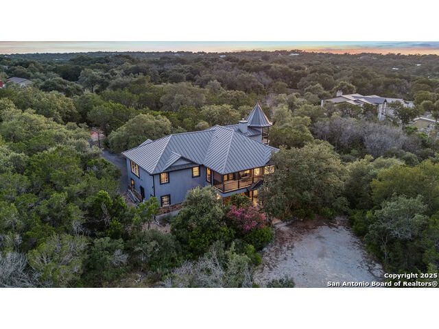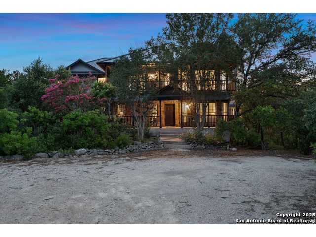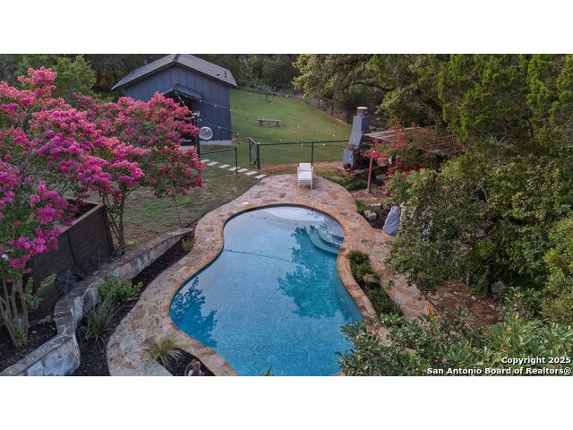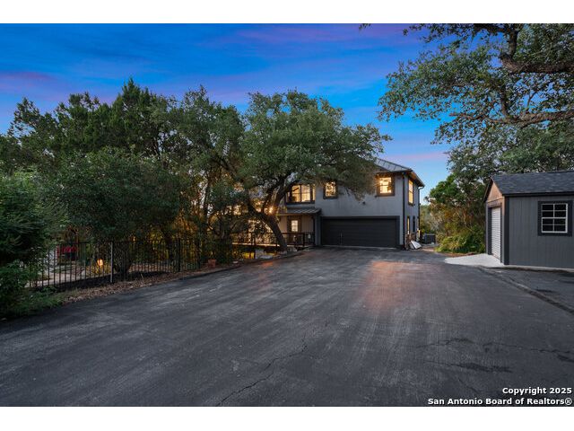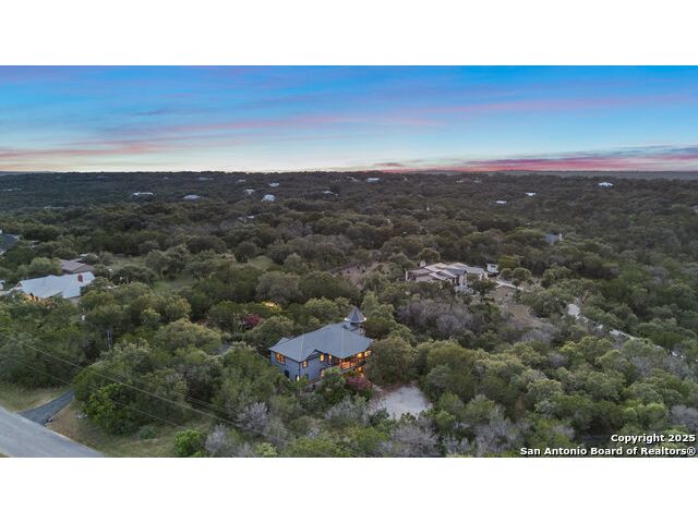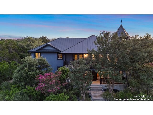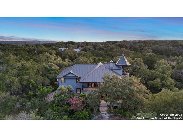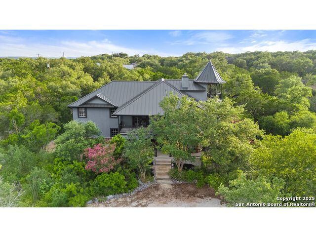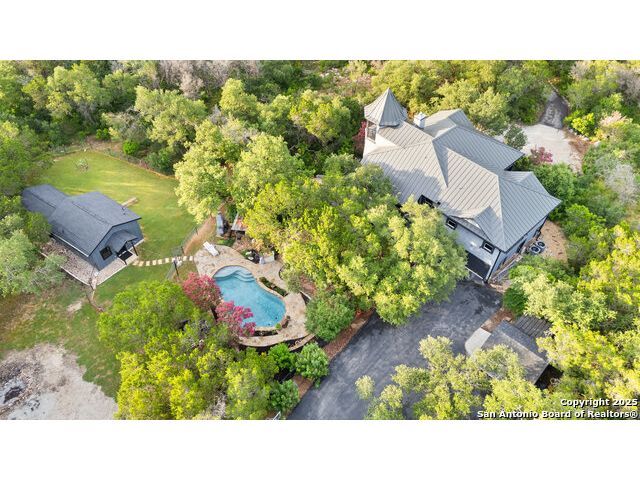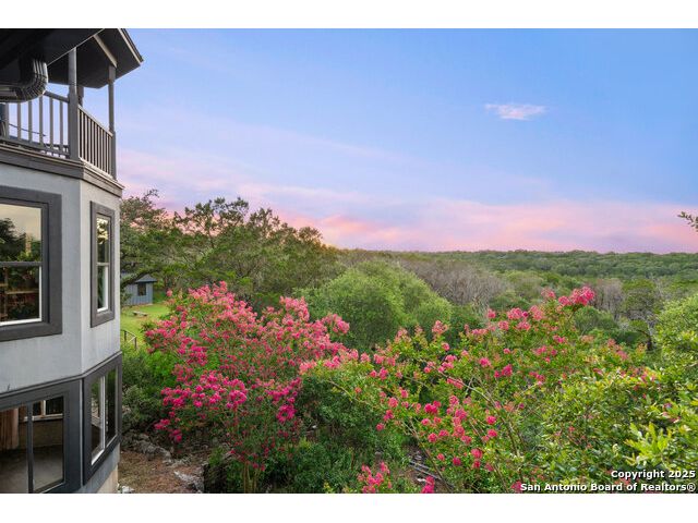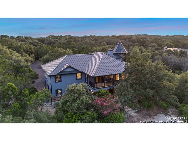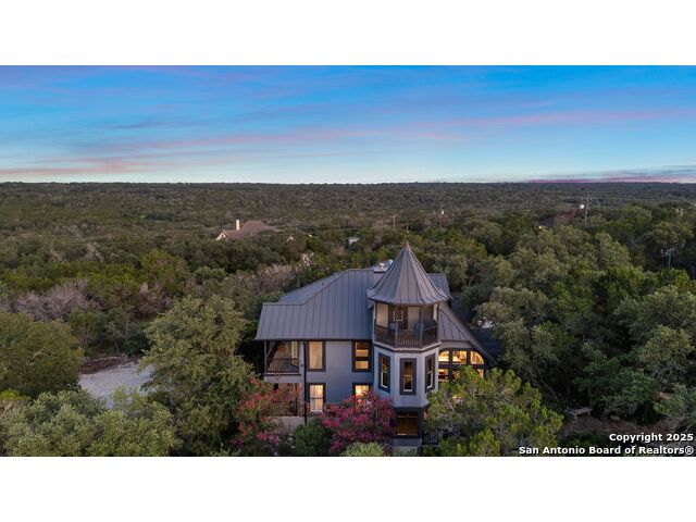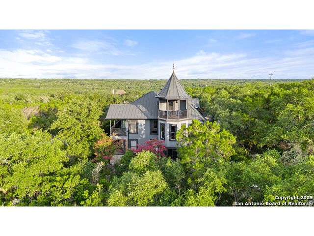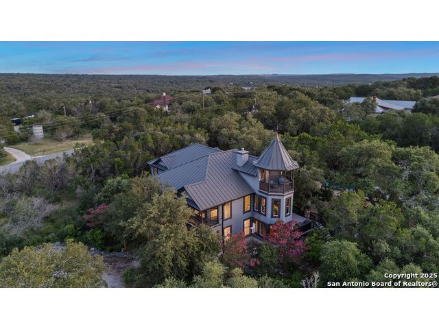Rare opportunity in River Chase! Ideally situated on a corner lot with two convenient driveways, this exceptional property features a newly built 570 sq ft detached guesthouse, a sparkling pool, and an oversized 2-car garage-all framed by sweeping long-range Hill Country views. Inside, over 3,000 sq ft of remodeled living space showcases soaring ceilings, a double-sided gas fireplace, and abundant natural light. The gourmet kitchen is a true showpiece, with an induction cooktop, built-in refrigerator, custom cabinetry, and generous prep space-perfect for entertaining or culinary excellence. The main-floor primary suite offers a serene retreat, while the second-floor game room with wet bar provides stylish space for leisure and gatherings. Outdoor living is equally impressive, including a private 7'x33' deck off the second bedroom, a third-floor observation deck with panoramic vistas, and inviting poolside spaces. Additional features include a 30-amp RV hookup, EV charger, partial fencing, and a new standing-seam metal roof. Homes with this combination of privacy, acreage, modern updates, and a fully independent guesthouse are highly sought after in River Chase.