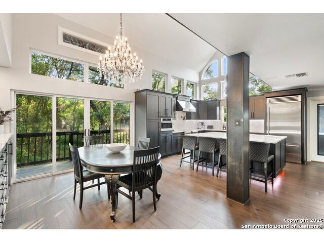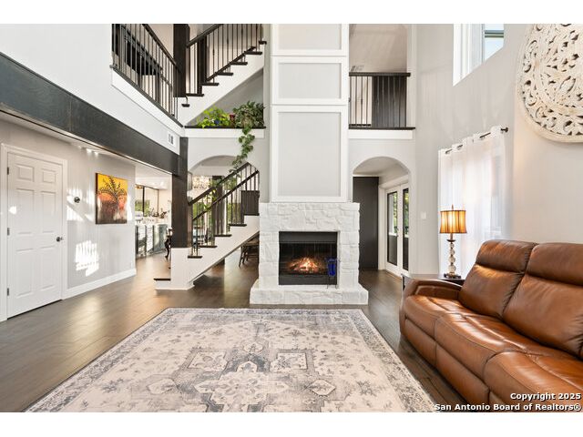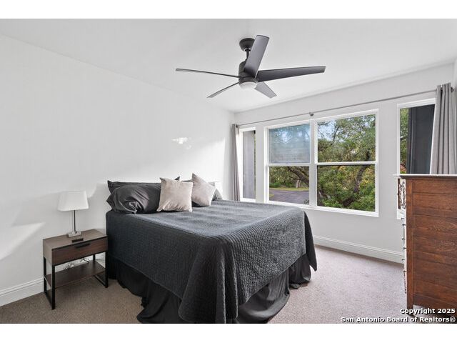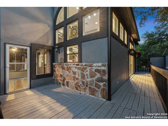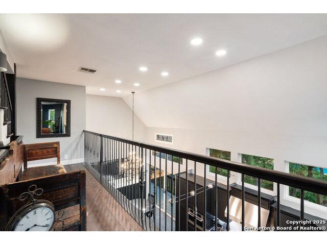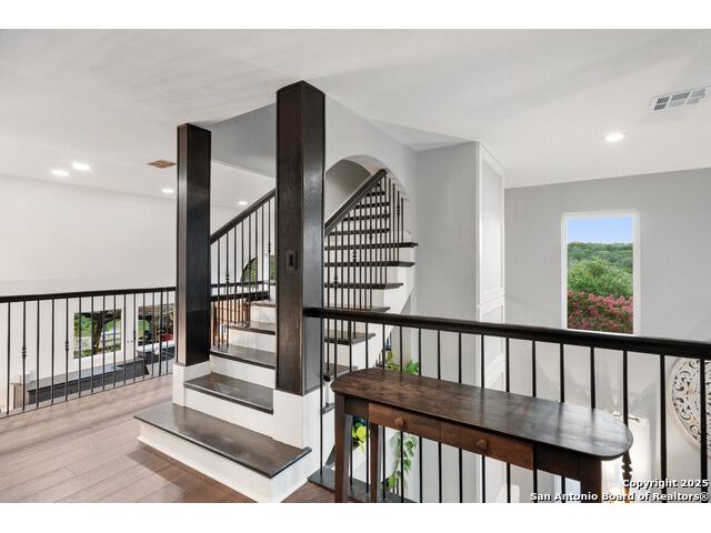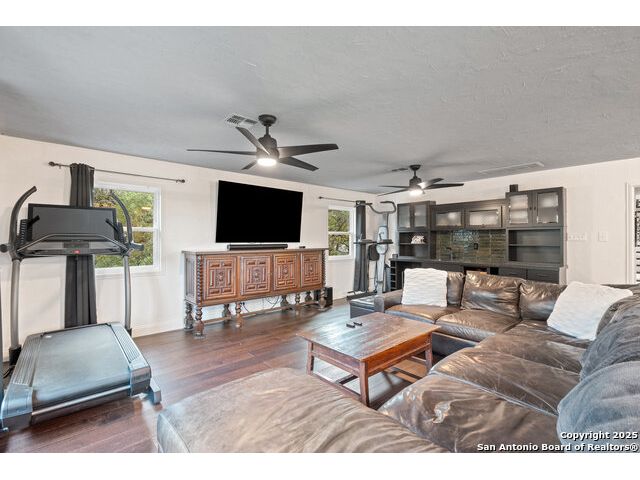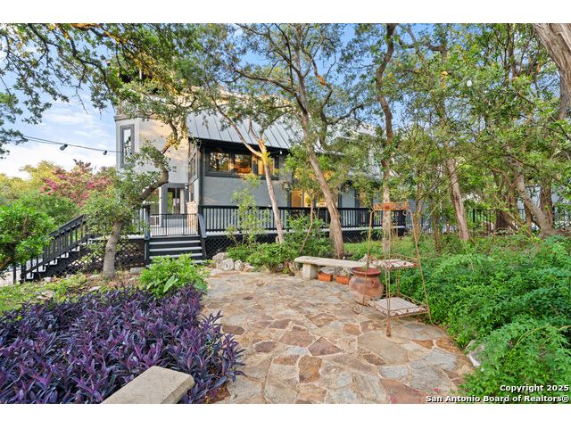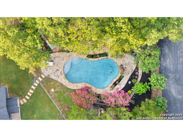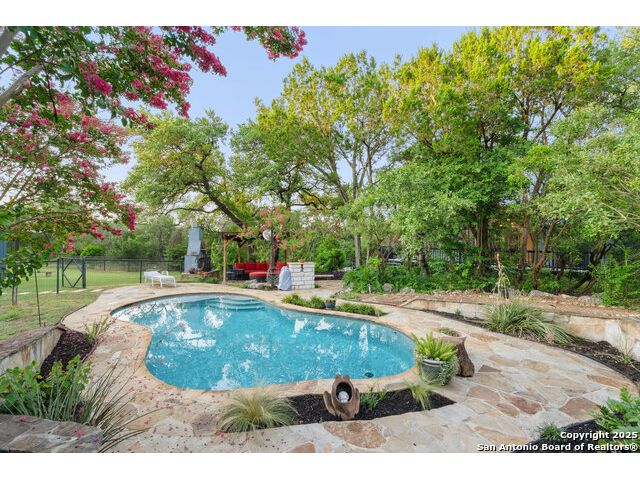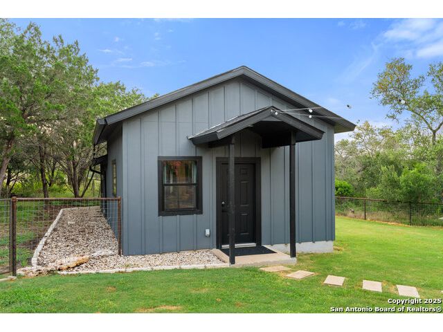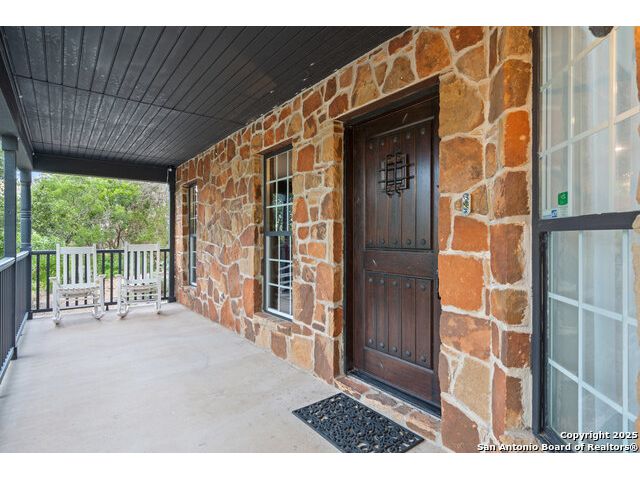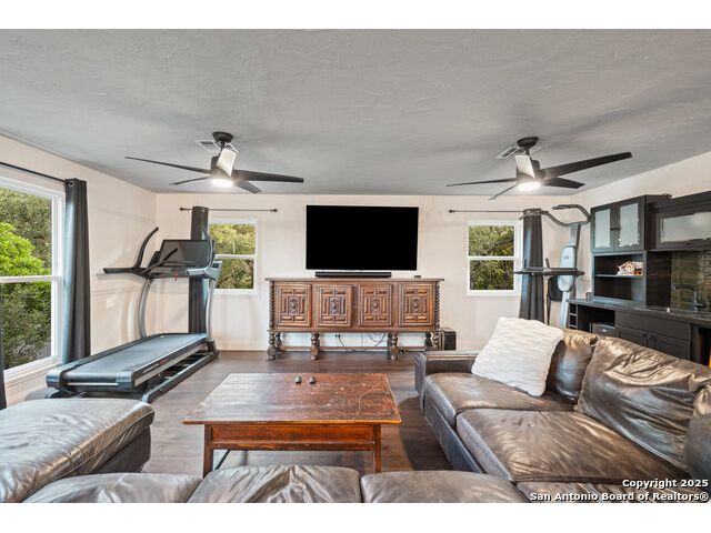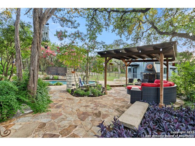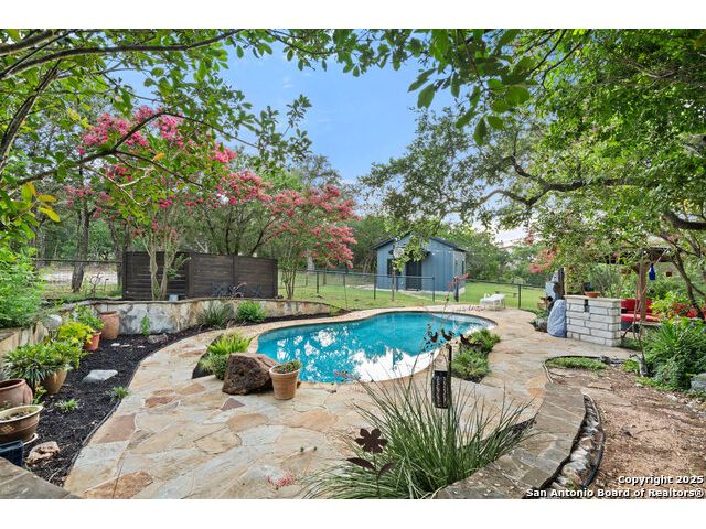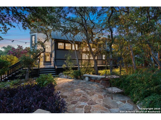 Rare opportunity in River Chase! Ideally situated on a corner lot with two convenient driveways, this exceptional property features a newly built 570 sq ft detached guesthouse, a sparkling pool, and an oversized 2-car garage-all framed by sweeping long-range Hill Country views. Inside, over 3,000 sq ft of remodeled living space showcases soaring ceilings, a double-sided gas fireplace, and abundant natural light. The gourmet kitchen is a true showpiece, with an induction cooktop, built-in refrigerator, custom cabinetry, and generous prep space-perfect for entertaining or culinary excellence. The main-floor primary suite offers a serene retreat, while the second-floor game room with wet bar provides stylish space for leisure and gatherings. Outdoor living is equally impressive, including a private 7'x33' deck off the second bedroom, a third-floor observation deck with panoramic vistas, and inviting poolside spaces. Additional features include a 30-amp RV hookup, EV charger, partial fencing, and a new standing-seam metal roof. Homes with this combination of privacy, acreage, modern updates, and a fully independent guesthouse are highly sought after in River Chase.