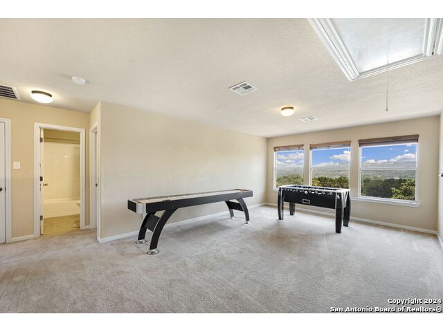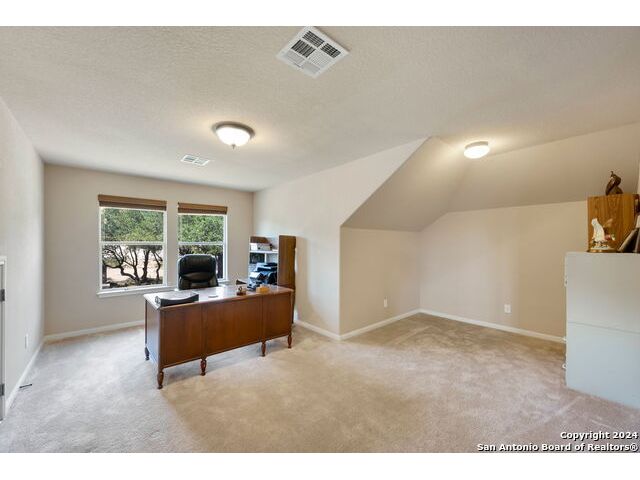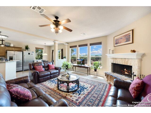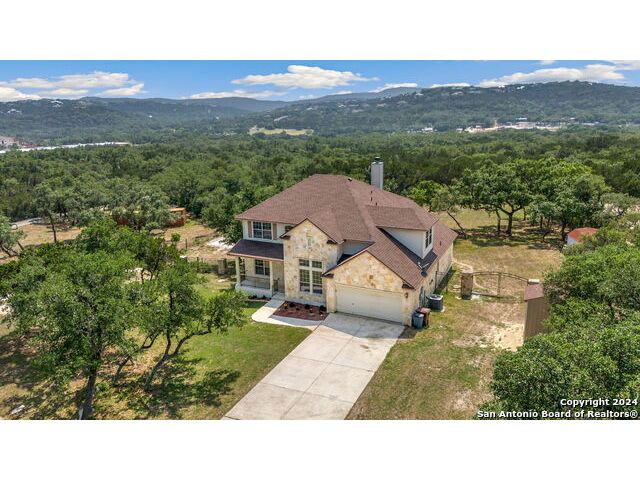 Nestled just outside the bedroom community of Helotes, this stunning home sits on slightly over an acre lot. Privacy abounds and is the perfect setting to add another garage or workshop, pool or more. There is an additional lot for sale next door too if you wanted to expand. City close, but complete country feel. The home has been inspected and repairs made, making it ready for the next owner. The charming stone front elevation and cozy front porch welcome you into an inviting entryway with a two-story ceiling. To the left, discover a formal dining room graced with a beautiful rustic chandelier, while to the right, a formal living room offers a perfect space for relaxing or visiting with guests. The main living room, located at the back of the floorplan, features a striking stone corner fireplace and a wall of windows that bathe the room in natural light, offering picturesque views of the outdoors. The open-concept kitchen boasts updated granite countertops, a diagonal tile backsplash, and stainless-steel appliances, including a smooth cooktop and built-in microwave. Adjacent to the kitchen, the well-lit yet cozy breakfast nook provides direct access to the large balcony, perfect for morning coffee or evening relaxation. Downstairs, the primary bedroom offers a private retreat with an ensuite bathroom, complete with a double vanity, whirlpool tub, and separate shower. A convenient half bath and laundry room are also located on the main floor. Upstairs, a versatile game room loft showcases outstanding hill country views, while the office area can easily serve as a third living room or a fifth bedroom. This home also includes two secondary bathrooms, ensuring ample space for all. Recent updates by the seller include the roof and deck. You will appreciate the storage shed that provides additional space for your belongings. With no HOA fees, this property offers both privacy and freedom. Experience the best of hill country living in this exceptional home while being close to shopping and restaurants!