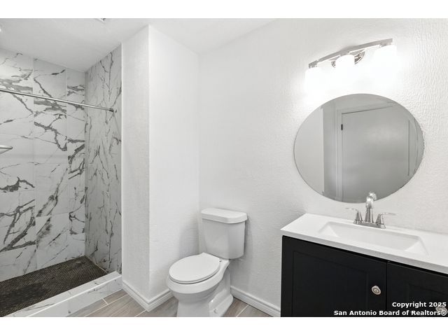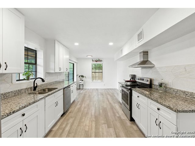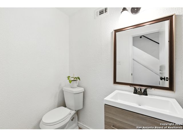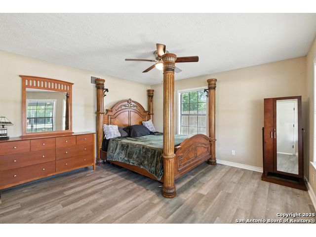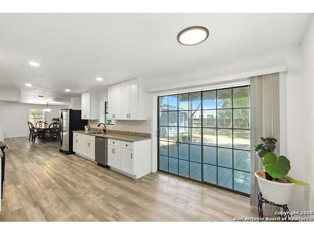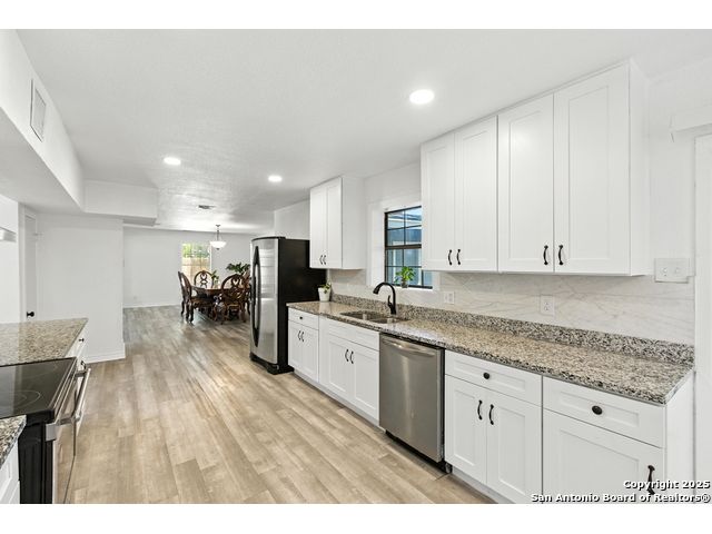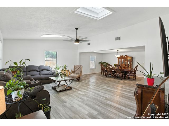Beautifully renovated and move-in ready, this spacious two-story home offers the flexibility and features today's buyers are looking for-plus the freedom of no HOA. The main level includes a bright open-concept living and dining area with skylights and large windows that let in abundant natural light. The updated kitchen boasts granite countertops, crisp white cabinetry, and stainless steel appliances, with an oversized sliding glass door leading to the backyard for effortless indoor-outdoor flow. One bedroom is located downstairs with a full bathroom nearby, making it ideal for guests, a home office, or multigenerational living. Upstairs, the oversized primary suite features a private walk-out balcony and a refreshed en-suite bath. Two additional bedrooms and a third full bath complete the upper level. Additional highlights include a newer roof, HVAC, water heater, and appliances, along with a rare 3-car garage, extended driveway, and nearly quarter-acre lot with mature trees and a fully fenced yard. Conveniently located near I-35, Loop 1604, shopping, and Randolph AFB, this home offers style, space, and convenience-with no HOA restrictions.