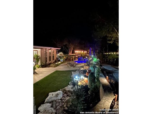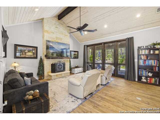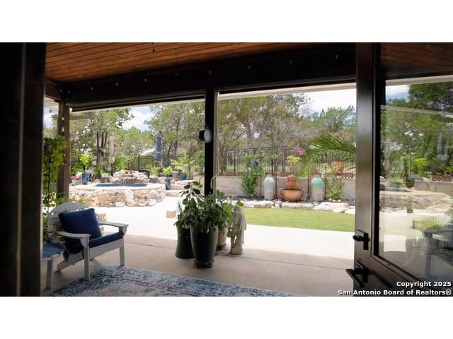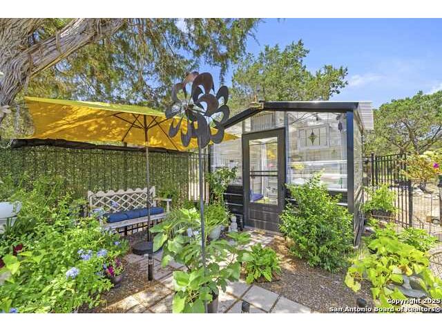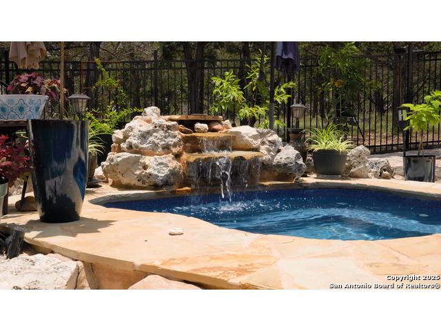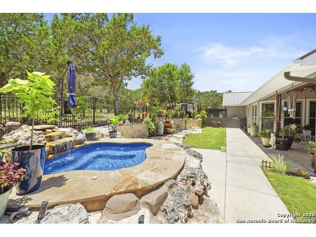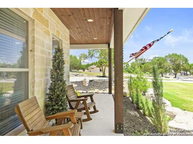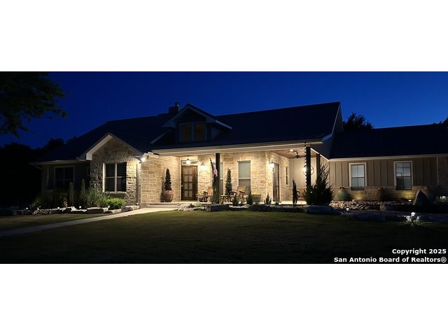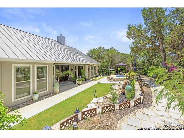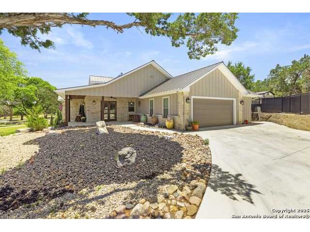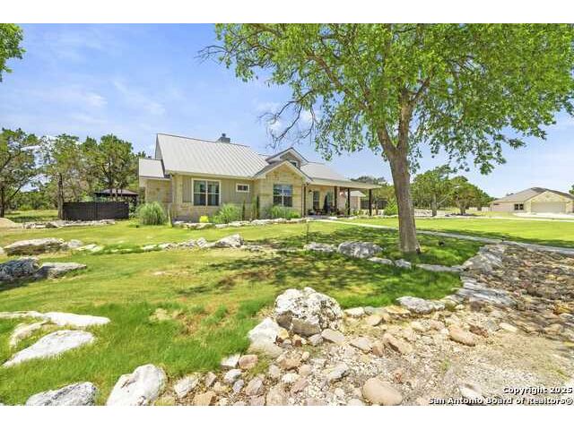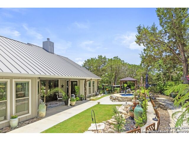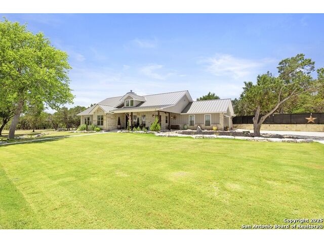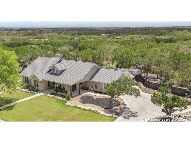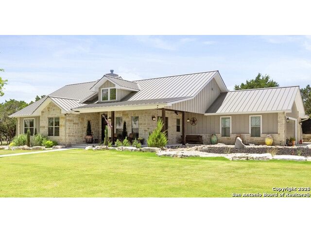Welcome to your own piece of Texas Hill Country heaven, nestled on a beautifully landscaped corner acre in the prestigious Las Colinas development of Kerrville. From the moment you arrive, this custom-crafted home greets you with Hill Country elegance, smart design, and an effortless indoor-outdoor lifestyle. As you step inside, you're welcomed by soaring 15-foot cathedral ceilings accented with a striking exposed wood beam. The living area glows with warmth from the wood-burning fireplace, framed by custom alder doors that open wide to your private outdoor sanctuary. Beneath your feet, wide plank tile floors run throughout the home, combining style and durability with ease of maintenance. The chef's kitchen is a dream-complete with a farmhouse sink, pot filler, engineered quartz countertops, custom cabinetry, and a designer walk-in pantry featuring a wine fridge and built-in microwave. Whether you're hosting holiday dinners or enjoying a quiet evening at home, this space is designed for both beauty and functionality. The 3-bedroom, 2.5-bath layout includes a spacious primary suite and generous storage throughout. With ceilings ranging from 10 to 18 feet, every room feels airy and grand. Designer-selected colors and beautiful Roman shades add a refined, custom feel. Energy efficiency and comfort are top of mind here: spray foam insulation, a water softener, R/O system, and fiber-optic network connectivity are all in place. The fully insulated 2-car garage includes a built-in workshop, perfect for projects or hobbies. Step outside, and you'll discover the showstopper: a heated spool (spa + pool) with a custom cover, perfectly placed in the terraced backyard surrounded by Lueders stone, Hardie board & batten siding, and a standing seam metal roof-all chosen for timeless beauty and durability. Entertain under the pergola with an outdoor ceiling fan, stroll the stone pathway to your greenhouse, or enjoy your raised garden beds, ready for seasonal planting. Extensive landscaping, full irrigation, and strategic tree placement provide beauty, shade, and privacy year-round. This is more than a house-it's a thoughtfully crafted retreat that celebrates Hill Country living at its finest. Don't miss the chance to experience the perfect blend of upscale Hill Country charm, smart design, and outdoor living - all tucked within one of Kerrville's most sought-after communities.