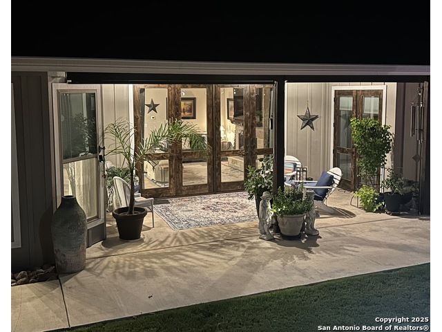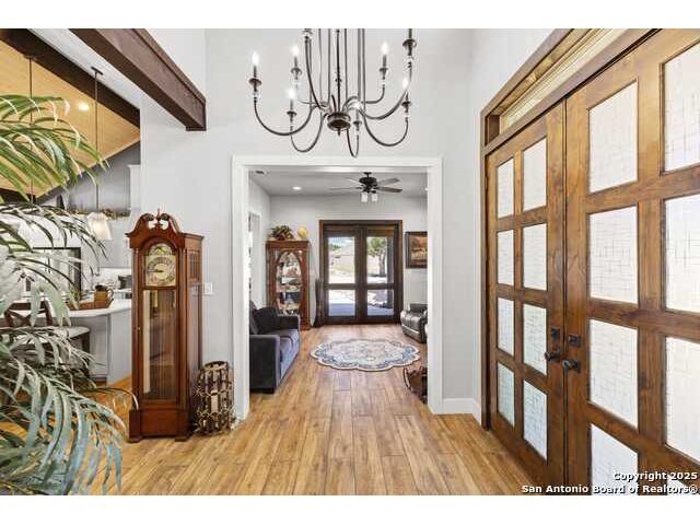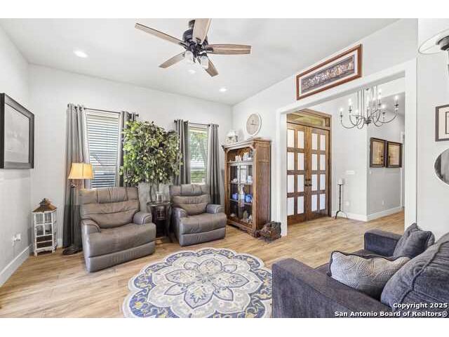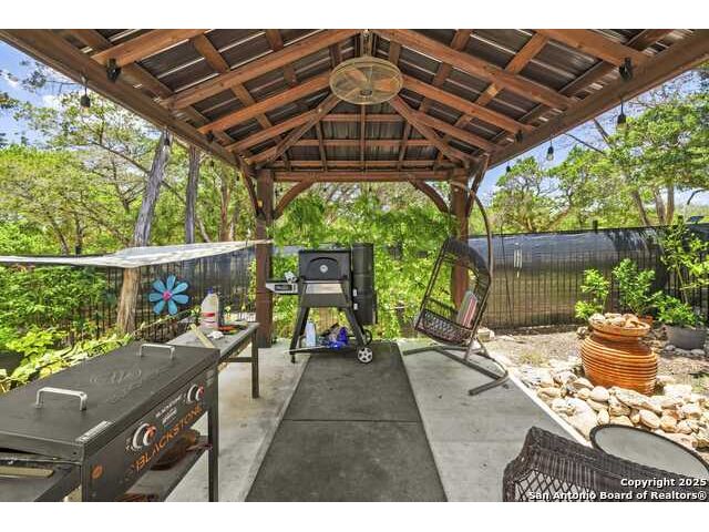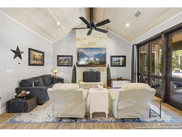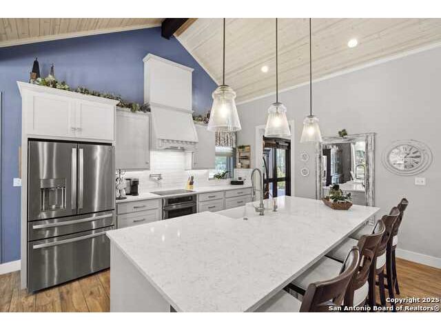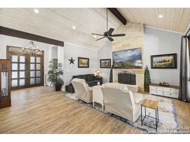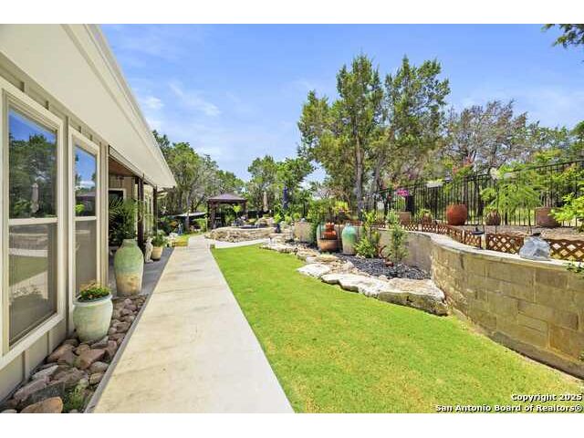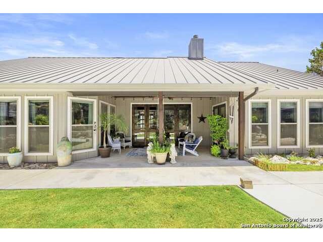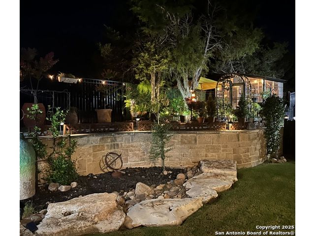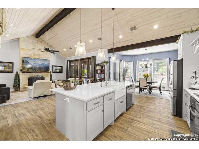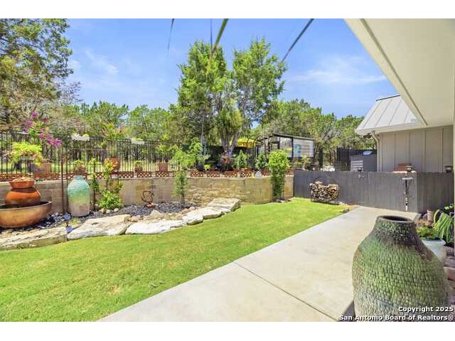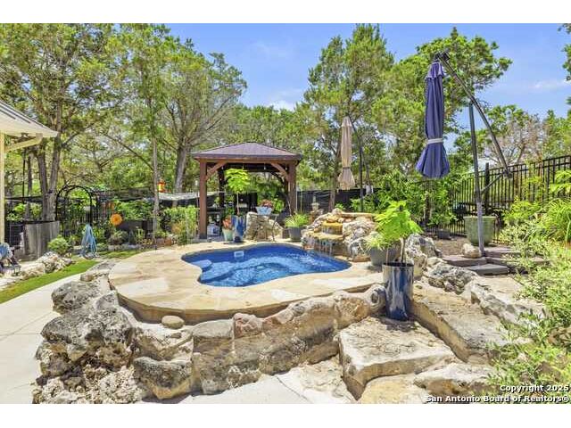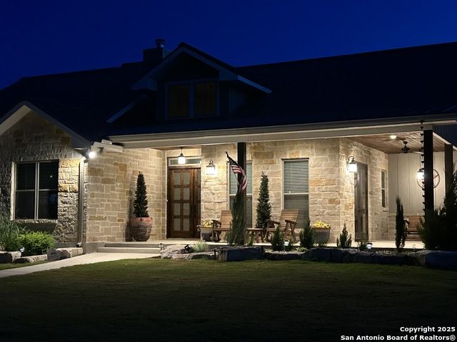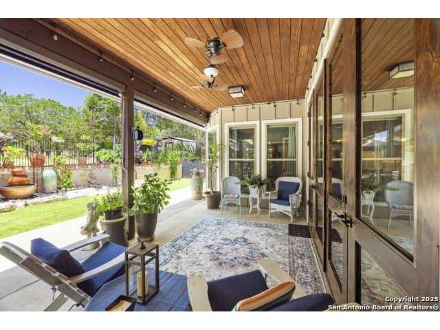 Welcome to your own piece of Texas Hill Country heaven, nestled on a beautifully landscaped corner acre in the prestigious Las Colinas development of Kerrville. From the moment you arrive, this custom-crafted home greets you with Hill Country elegance, smart design, and an effortless indoor-outdoor lifestyle. As you step inside, you're welcomed by soaring 15-foot cathedral ceilings accented with a striking exposed wood beam. The living area glows with warmth from the wood-burning fireplace, framed by custom alder doors that open wide to your private outdoor sanctuary. Beneath your feet, wide plank tile floors run throughout the home, combining style and durability with ease of maintenance. The chef's kitchen is a dream-complete with a farmhouse sink, pot filler, engineered quartz countertops, custom cabinetry, and a designer walk-in pantry featuring a wine fridge and built-in microwave. Whether you're hosting holiday dinners or enjoying a quiet evening at home, this space is designed for both beauty and functionality. The 3-bedroom, 2.5-bath layout includes a spacious primary suite and generous storage throughout. With ceilings ranging from 10 to 18 feet, every room feels airy and grand. Designer-selected colors and beautiful Roman shades add a refined, custom feel. Energy efficiency and comfort are top of mind here: spray foam insulation, a water softener, R/O system, and fiber-optic network connectivity are all in place. The fully insulated 2-car garage includes a built-in workshop, perfect for projects or hobbies. Step outside, and you'll discover the showstopper: a heated spool (spa + pool) with a custom cover, perfectly placed in the terraced backyard surrounded by Lueders stone, Hardie board & batten siding, and a standing seam metal roof-all chosen for timeless beauty and durability. Entertain under the pergola with an outdoor ceiling fan, stroll the stone pathway to your greenhouse, or enjoy your raised garden beds, ready for seasonal planting. Extensive landscaping, full irrigation, and strategic tree placement provide beauty, shade, and privacy year-round. This is more than a house-it's a thoughtfully crafted retreat that celebrates Hill Country living at its finest. Don't miss the chance to experience the perfect blend of upscale Hill Country charm, smart design, and outdoor living - all tucked within one of Kerrville's most sought-after communities.