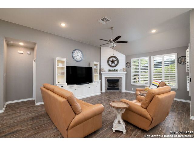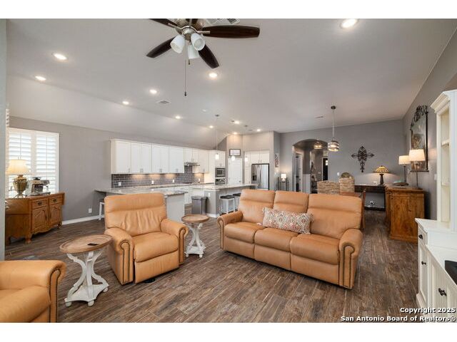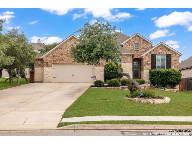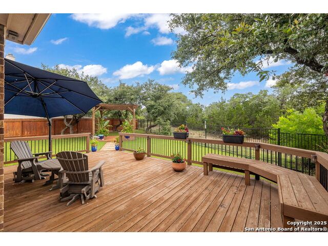 OPEN HOUSE - THIS SATURDAY, JULY 19TH FROM 12PM TO 2PM. Welcome to this stunning single-story home nestled on a greenbelt in the highly sought-after Ventana community. Boasting 4 spacious bedrooms, 3.5 baths, a dedicated media room, private study, and an oversized tandem 3.5-car garage, this home offers both functionality and elegance. Step outside to enjoy the beautifully added wood deck and gazebo-freshly stained and perfect for taking in the serene Hill Country views. Ideally located near major cities such as San Antonio, New Braunfels, Boerne, and Spring Branch, this home provides the perfect balance of peaceful living and urban convenience.