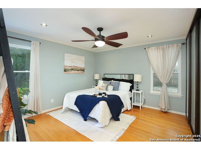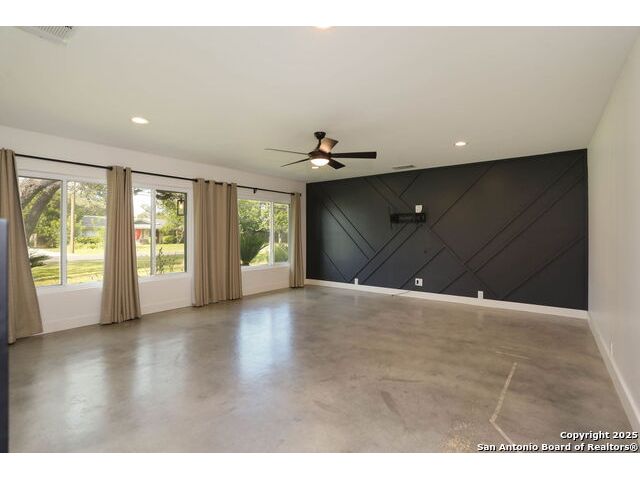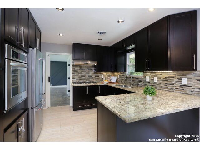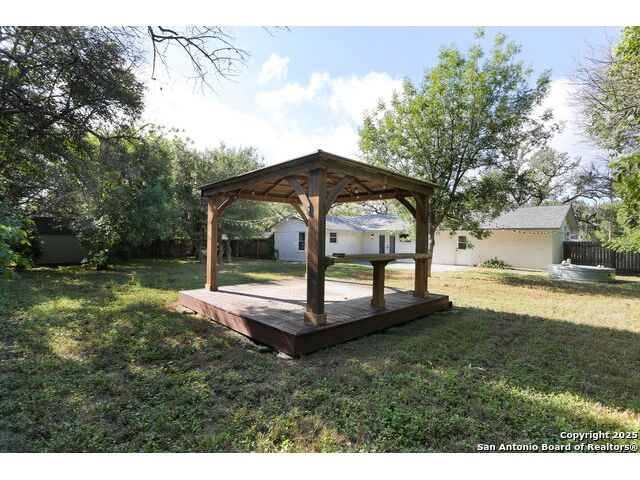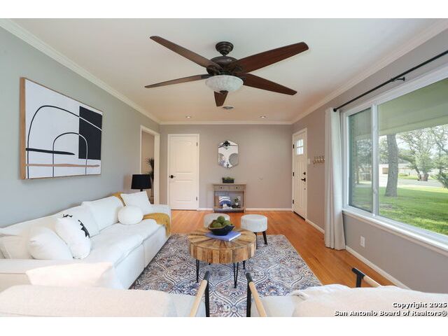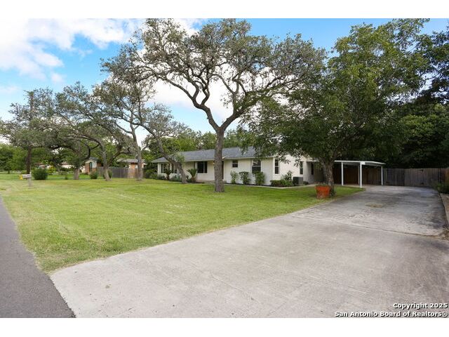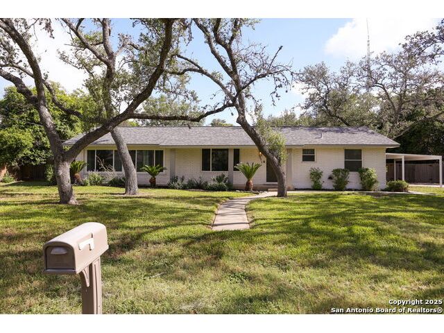Welcome to this beautifully updated Mid-Century Modern ranch-style home, perfectly blending timeless Hollywood Park charm with modern elegance. Situated on a spacious 0.33-acre lot with mature shade trees and a fully fenced backyard, this property offers both privacy and serenity in one of North Central San Antonio's most sought-after communities. Inside, you'll find gleaming original hardwood floors, fresh neutral paint, and elegant crown molding throughout. The fully remodeled kitchen is a true highlight, featuring custom cabinetry, stainless steel appliances, gas cooking, granite countertops, and a designer tile backsplash - seamlessly opening to the generous dining area, perfect for entertaining. The home offers updated bathrooms with custom niches, as well as original hardwood flooring in all bedrooms. A large family/game room creates the ideal space for movie nights and gatherings. Step outside to an expansive pergola-covered patio, enjoy a hammock under the shade of mature oaks, or cool off in the stock tank pool. The freshly painted two-car carport enhances the home's curb appeal. Residents of Hollywood Park enjoy access to a resort-style amenity center featuring three swimming pools, a splash pad, Sonterra Golf Course access, tennis courts, a sand volleyball court, a covered pavilion with grilling stations, and the Voigt Center for community events. Hollywood Park is renowned for its strong sense of community, hosting over 20 events annually, including adult socials, a chili cook-off, Santa delivering gifts on a fire truck, anEaster celebration, a 4th of July parade, a swim team, and more. Located within the highly acclaimed North East ISD, with easy access to Highway 281 and Loop 1604, this move-in-ready gem offers exceptional convenience. Don't miss your chance to own a piece of this magical neighborhood - schedule a private showing today!