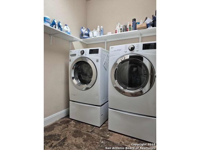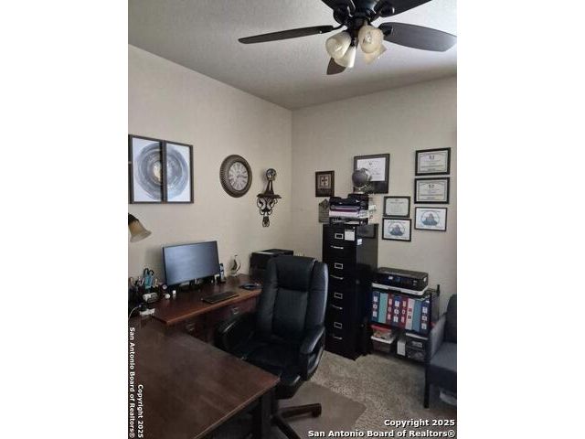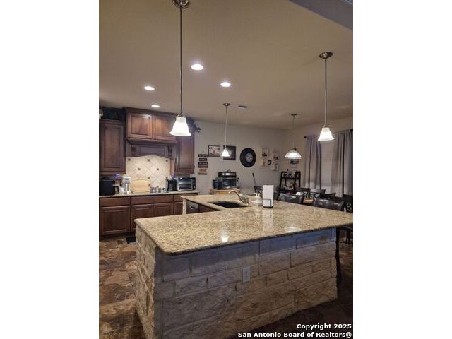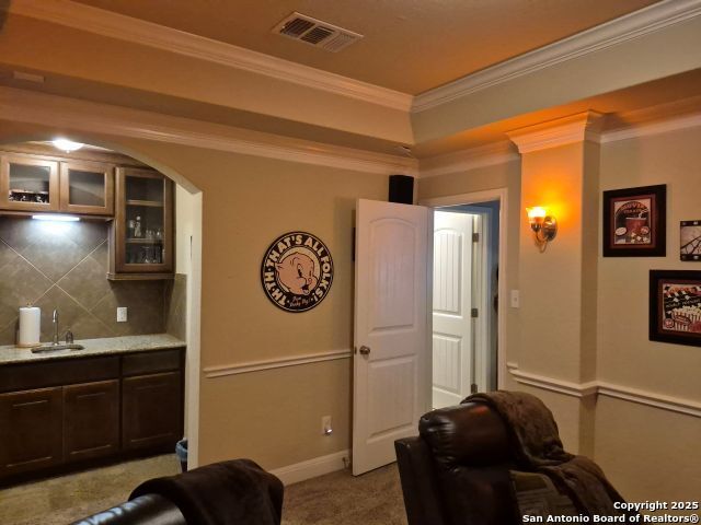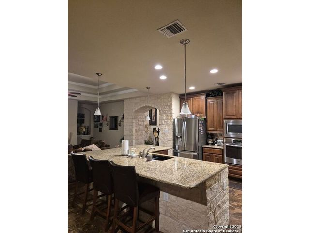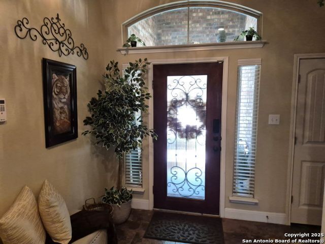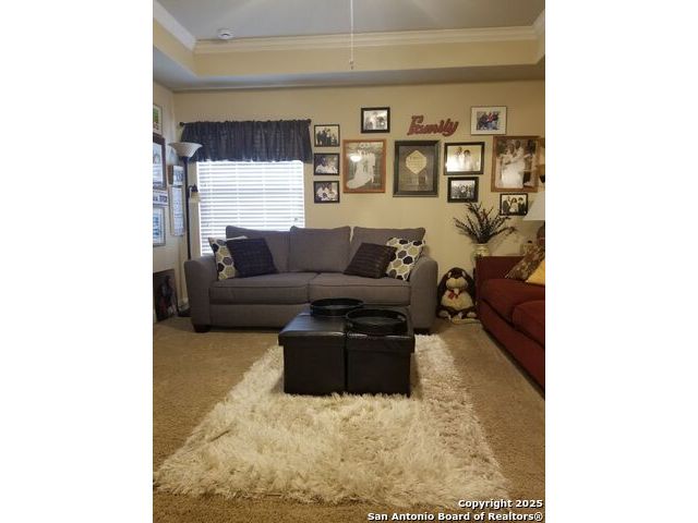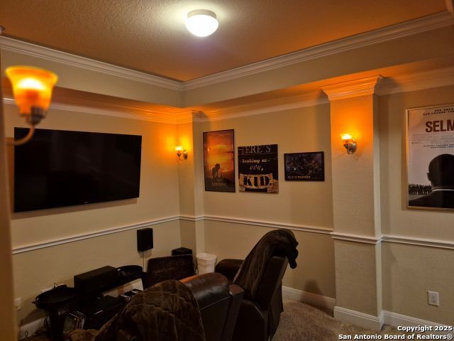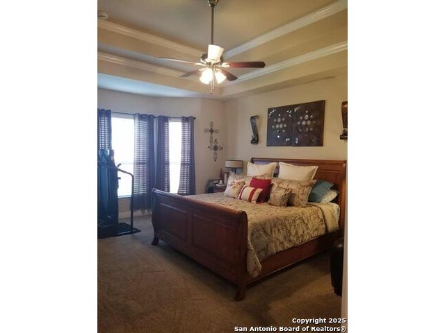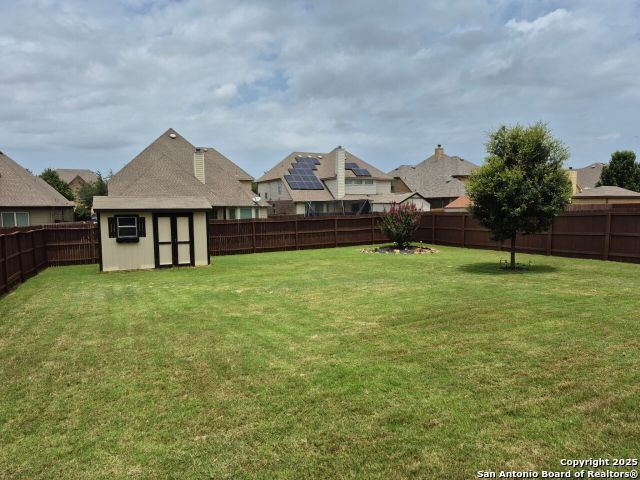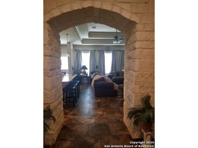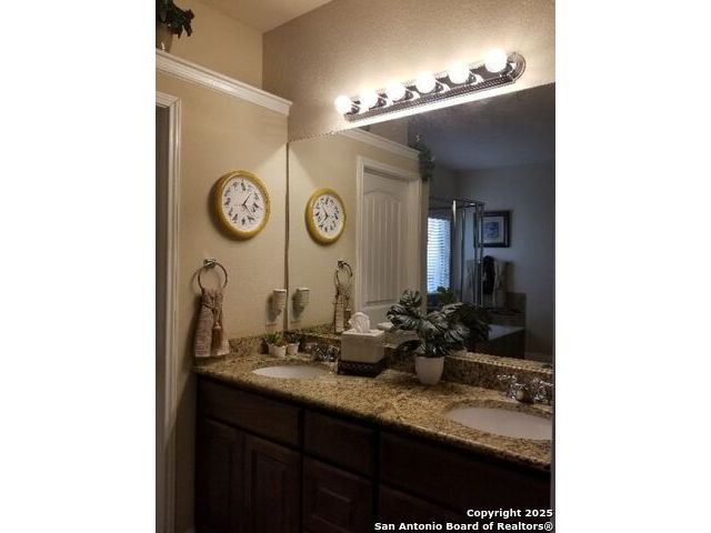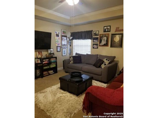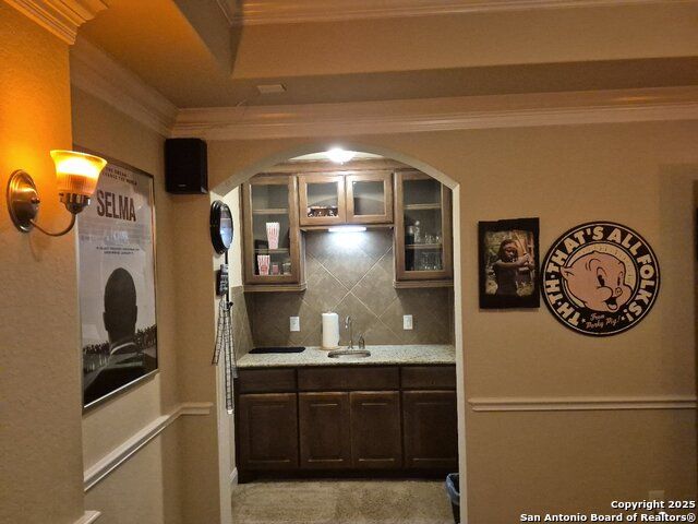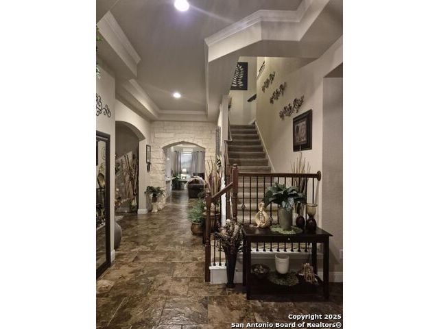 A MUST SEE!!! Located in TURNING STONE COMMUNITY in Cibolo. A beautiful 1.5 story, 3 bedroom, 3 bath, plus an office/study and upstairs media room with wet bar plus flex room and full bath. Open floor plan with 2 dining areas. Crown molding throughout gives this beauty warmth and character. A rock archway leads to the living room and kitchen area with L-shaped island of rock base and granite countertops. The primary bedroom has bay windows, walk in closet, glass enclosed shower and jetted bath. Large covered patio and pool size back yard are perfect for family fun and entertaining. Recent installation of a HVAC system (3 years old) and water heater (1.5 years old).