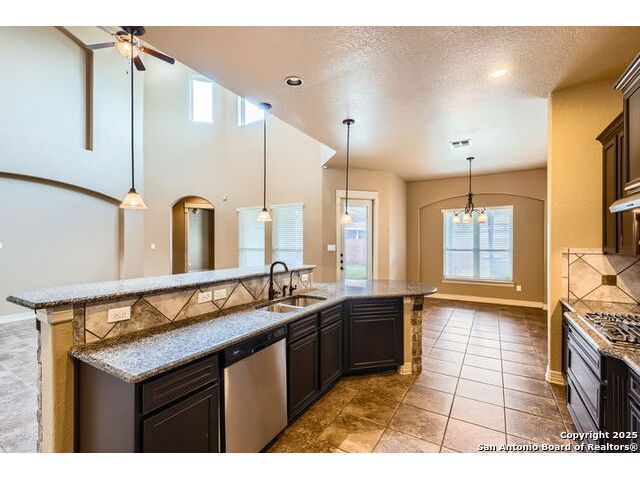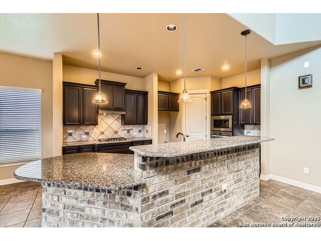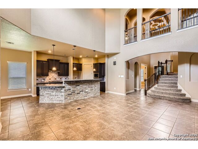 This magnificent home is located in one of San Antonio's finest neighborhoods with resort like amenities in highly sought after Kallison Ranch. This home is sure to leave a lasting impression with its soaring ceilings, grand staircase, and features hardwood floors, and an expansive open space both inside and outside for entertaining. Downstairs you will find your regal primary bedroom with Texas sized bathroom and dual closets, and a secondary bedroom featuring an en suite, which can function as another primary bedroom or office. The spacious kitchen boasts ample granite countertops with plenty of seating, and seamlessly connects to the vast family room, allowing you to stay engaged while cooking on your six-burner gas stove. Furthermore, the generously-sized backyard includes a covered patio, a built-in bar, and a movable outdoor kitchen/grill ready for year round fun and indoor/outdoor game watching parties! Make this luxurious home yours today!