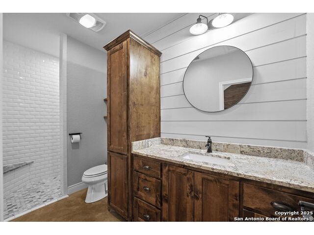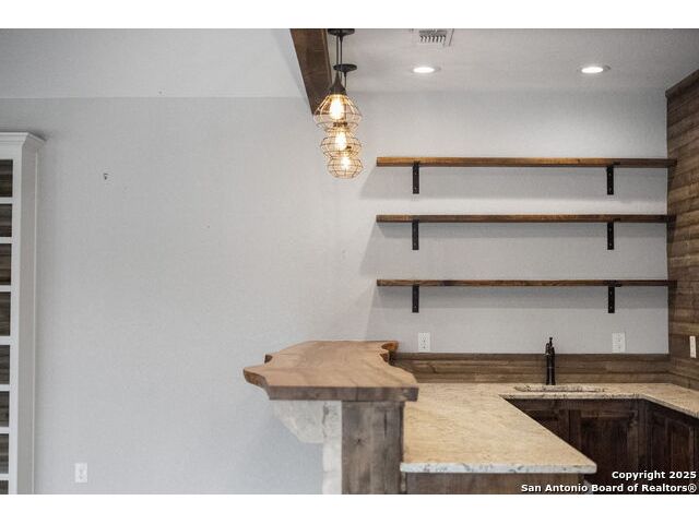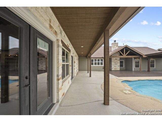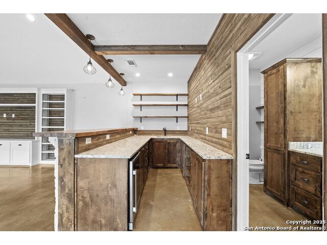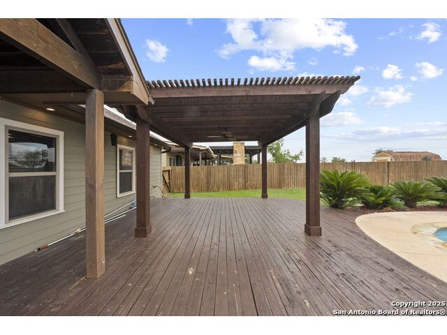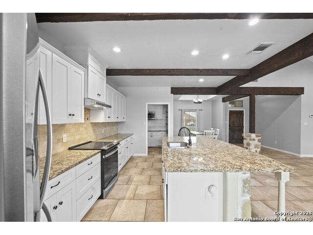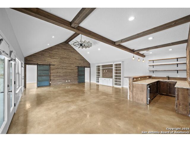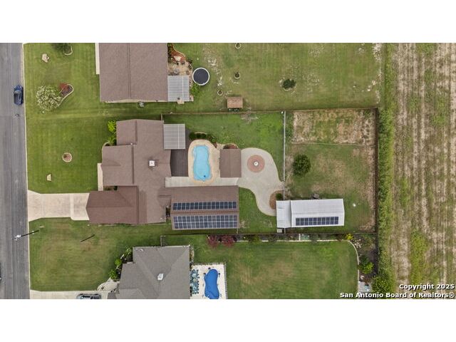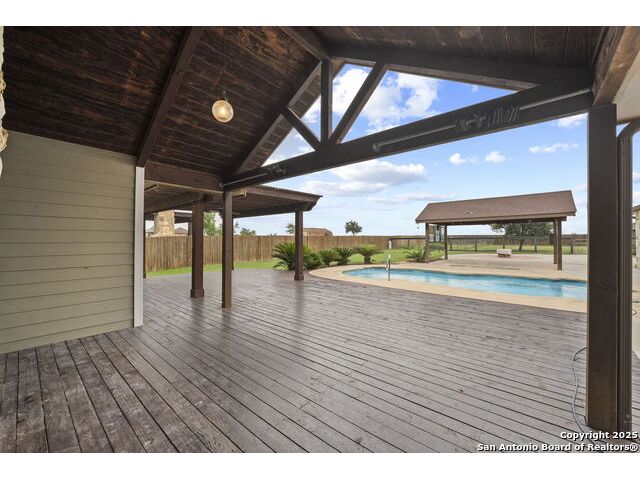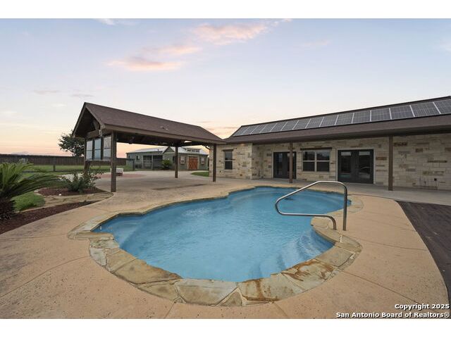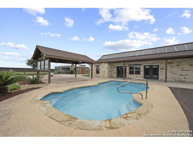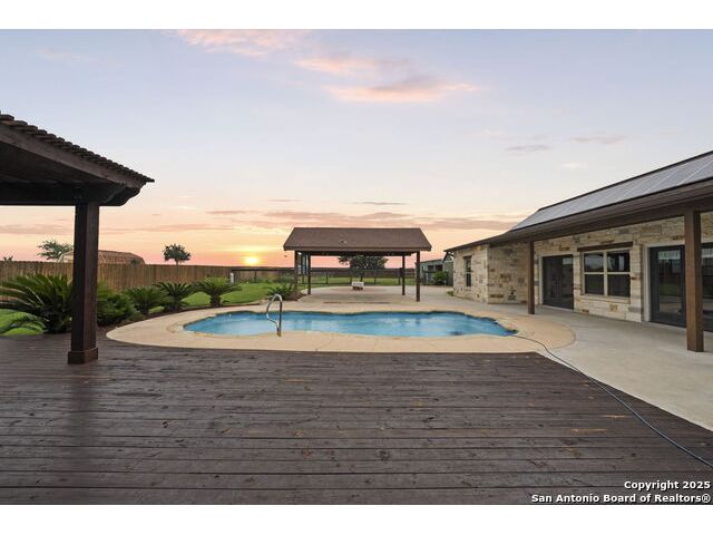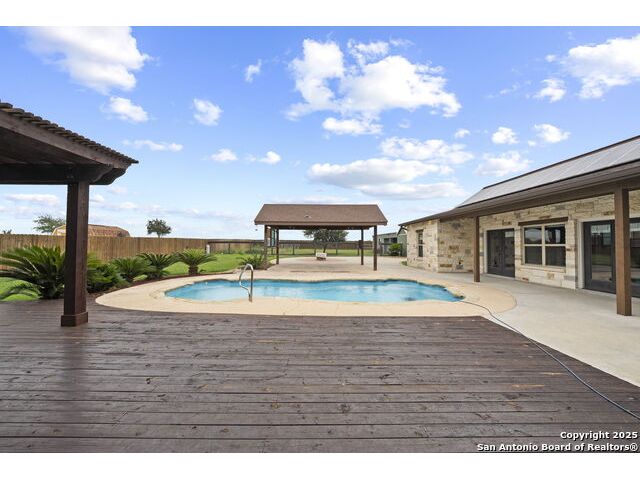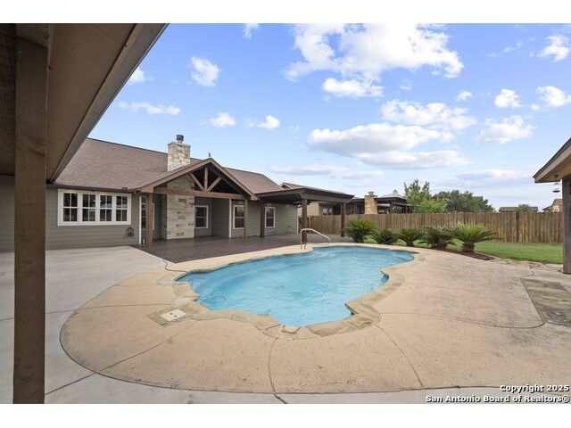 Beautiful 5-bedroom, 3-bathroom ranch-style home is set on over half an acre of beautifully landscaped grounds, offering a peaceful and private retreat. The property features a sparkling saltwater pool, a cozy fire pit, a charming gazebo, and a spacious workshop. Upon entering, you'll be welcomed by an open and inviting floor plan that radiates warmth and comfort. The expansive living area showcases a striking stone fireplace, wooden beams across the ceiling, and an abundance of natural light, thanks to large windows that provide breathtaking views of the surrounding landscape. The chef-inspired kitchen is equipped with granite countertops, stainless steel appliances, generous cabinetry, two sinks, a decorative tiled backsplash, and a convenient butler's pantry-perfect for any culinary enthusiast. The primary bedroom suite offers a peaceful sanctuary with ample space to relax. Its luxurious en-suite bathroom features a soaking tub, a separate shower, and dual vanities, creating a spa-like experience. The four additional spacious bedrooms are ideal for family or guests, each offering unique charm and ample closet space. The home also includes an impressive game room with vaulted beam ceilings, a striking wood accent wall, concrete flooring, built-in shelving, and a custom bar area-perfect for hosting gatherings. Step outside into your own private paradise. The expansive backyard offers numerous opportunities for leisure and entertainment, from enjoying the saltwater pool on hot summer days to lounging in the gazebo. A versatile workshop adds extra appeal, ideal for hobbies or additional storage, and complements the home beautifully. The property offers abundant space for gardening, outdoor activities, or potential expansion, and the solar panels will help reduce energy costs. (Panels are paid off) With so much to offer, this home is a must-see!