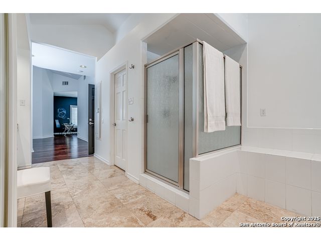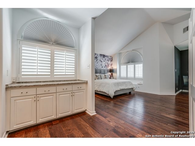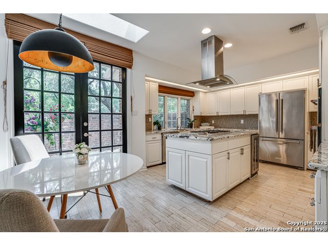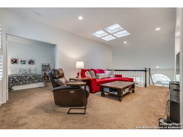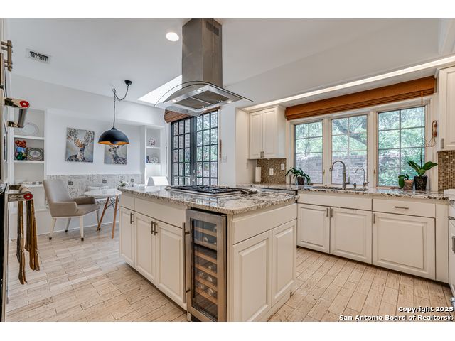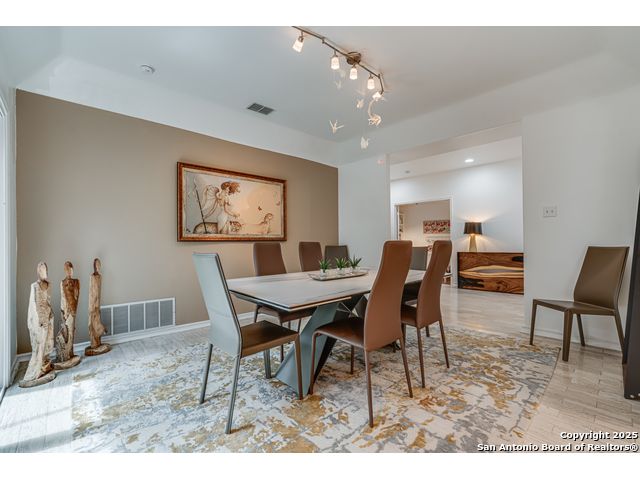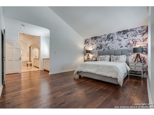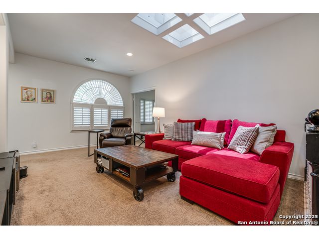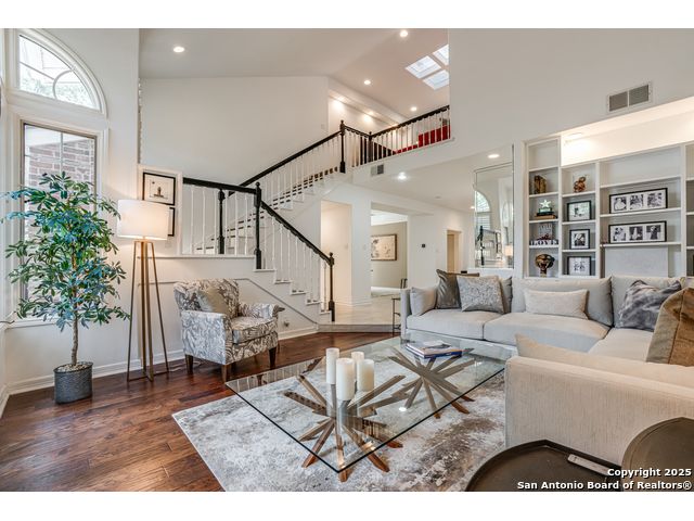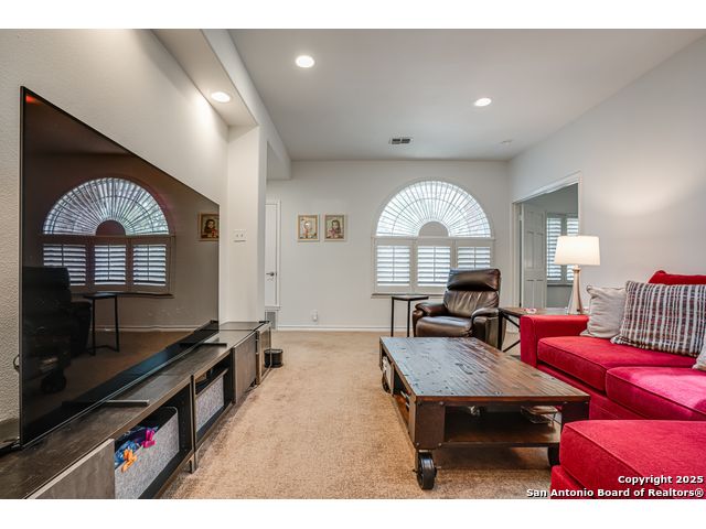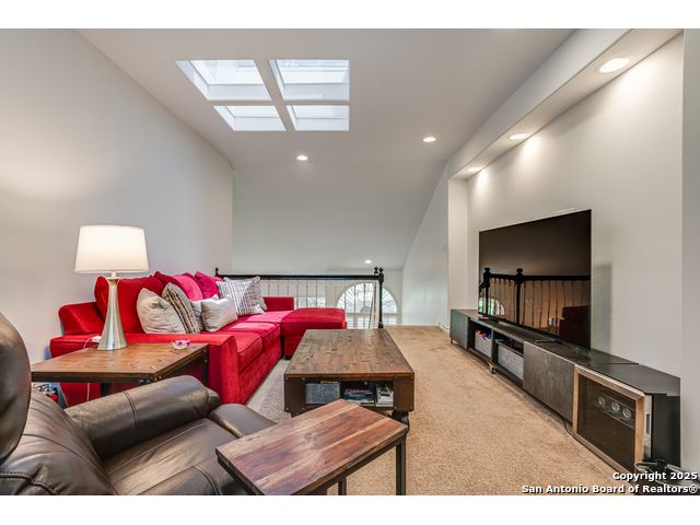 This exquisite two-story townhome offers a rare combination of sophistication, comfort, and convenience in the prestigious, guard-gated community of Elm Creek. Featuring 3 spacious bedrooms, each with its en-suite bathroom, this home provides exceptional privacy and flexibility, including a first-floor secondary suite ideal for guests or multigenerational living. The inviting living area is filled with natural light and showcases soaring ceilings, a cozy fireplace, and large windows with skylights. The chef's kitchen boasts generous cabinetry, a central island, and direct access to a private patio perfect for morning coffee or evening relaxation. Upstairs, the expansive owner's retreat offers high ceilings and a versatile extra space ideal for a home office, fitness area, or reading nook. A second upstairs bedroom and a loft area provide the perfect setup for a TV or game room. There is an extra space on the first floor, previously used as a pet suite and caretaker quarters, complete with a full bath. Step outside to enjoy a peaceful backyard that backs onto green space, just a one-minute walk from the community pool. To make your move even easier, the home includes a refrigerator, wine cooler, washer, and dryer. HVAC outside units were replaced in 2021, and smart thermostats were added. Enjoy 24-hour guarded access and a prime location near premier dining, shopping, and major highways. This is low-maintenance luxury living at its finest.