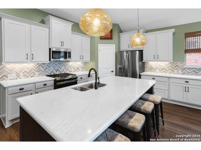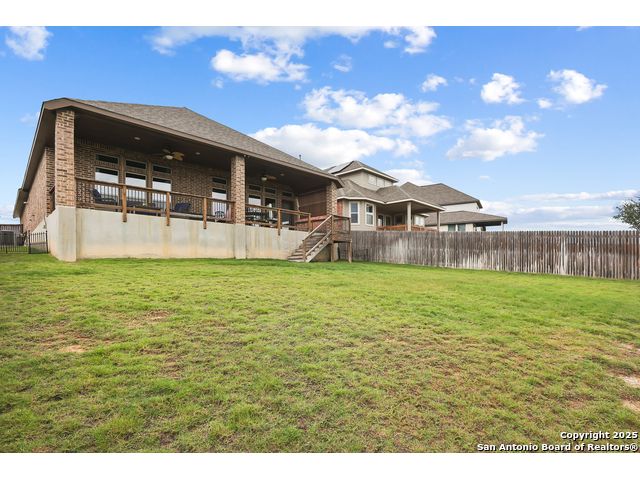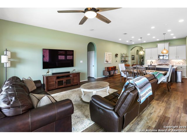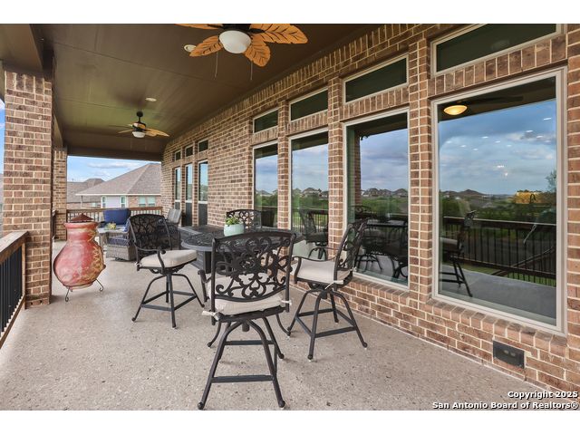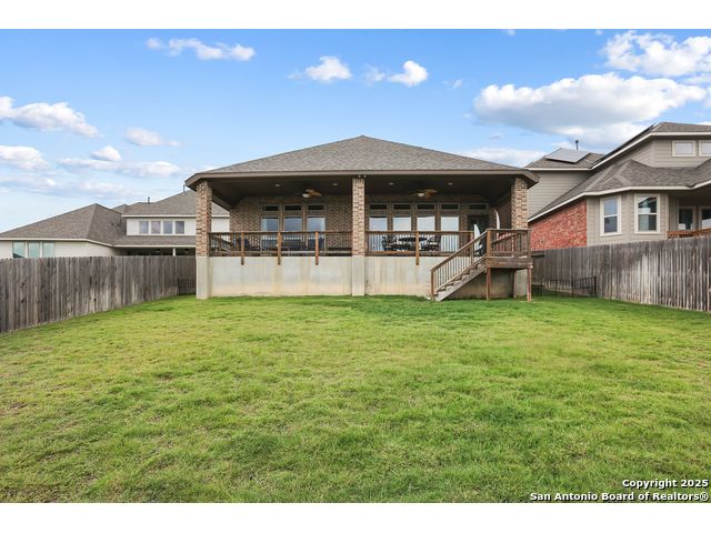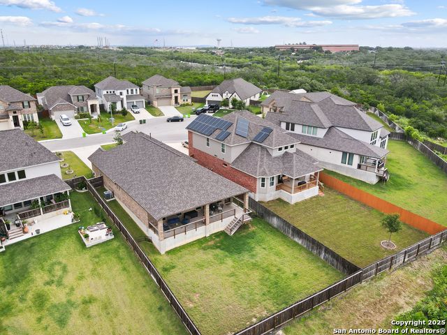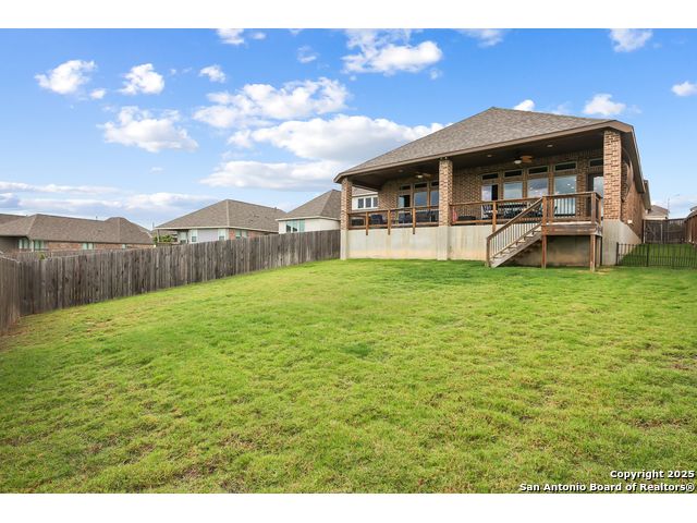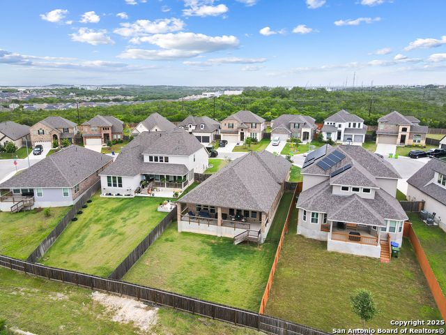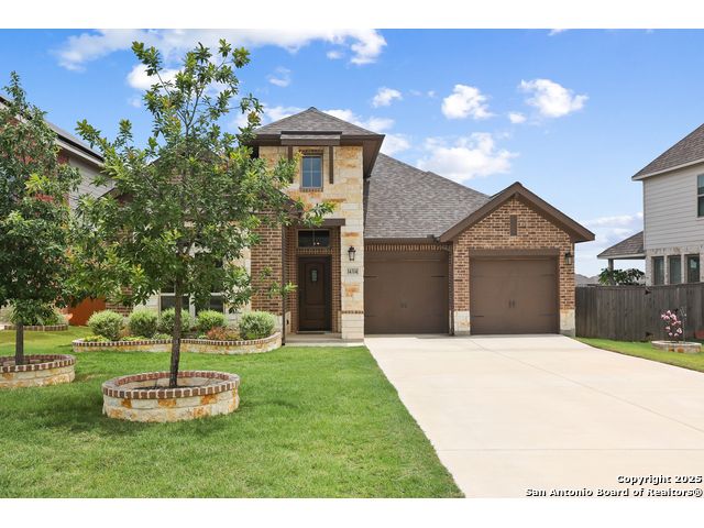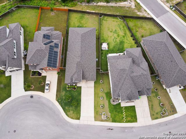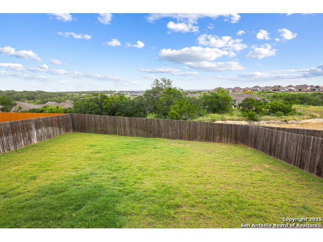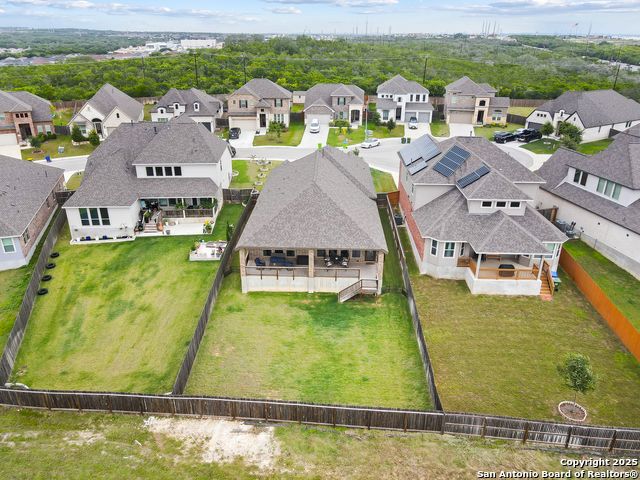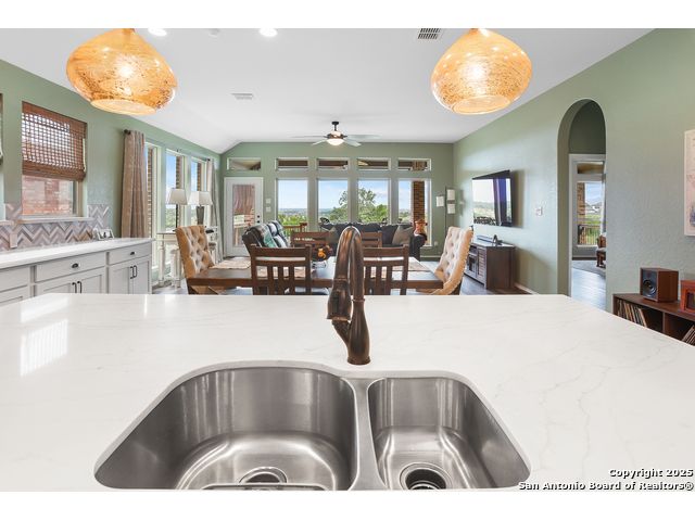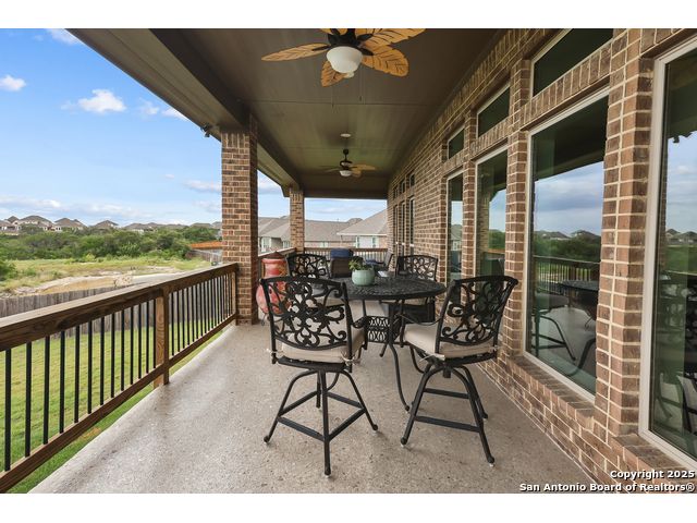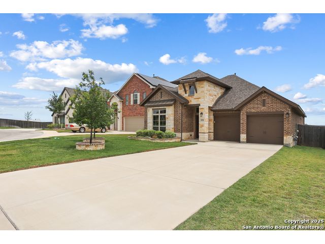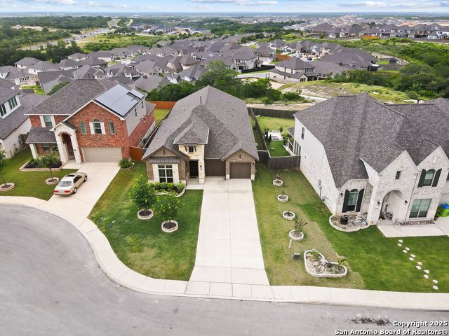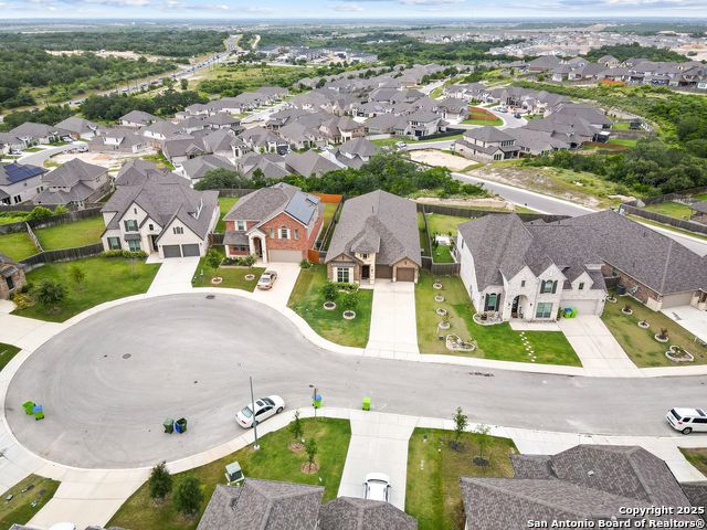 Stunning views! Welcome to this immaculate, beautifully upgraded, single-story Perry-built home, nestled on a spacious 50-ft. cul-de-sac lot in a sought-after community with fantastic amenities. Boasting 3 bedrooms plus study or 4th bedroom, 2 baths, and a 3-car tandem garage with durable epoxy flooring, this home offers both style and functionality. Step inside to an open living concept with soaring high ceilings, abundant natural light through beautiful windows, and elegant finishes throughout. Ceiling fans in all bedrooms and living areas ensure year-round comfort. The chef's kitchen is a true showpiece, equipped with stainless steel appliances, extended 42" cabinets, under-cabinet lighting, stone countertops, pendant lights, and a striking chevron backsplash. Designer touches like Venetian bronze faucets and luxury vinyl plank flooring add a touch of sophistication. Retreat to the spacious primary suite featuring dual walk-in closets, double vanities, beautiful tile floors, and a luxurious walk-in shower. Enjoy morning coffee and terrific views outside on the extended covered patio with epoxy flooring and iron balusters. Additional features include a tankless water heater, water softener, and an extra-long driveway perfect for guest parking or multiple vehicles. Located in a beautiful, amenity-rich community with pool, playground, scenic jogging trails, and pickleball courts, and with easy access to major employers like the Microsoft Data Center, Boeing, Sea World, and Lackland AFB, this home offers the perfect blend of comfort, convenience, and modern elegance. Make an appointment to view today and don't miss your opportunity to own this exceptional, move-in-ready home!