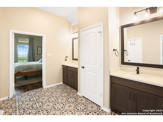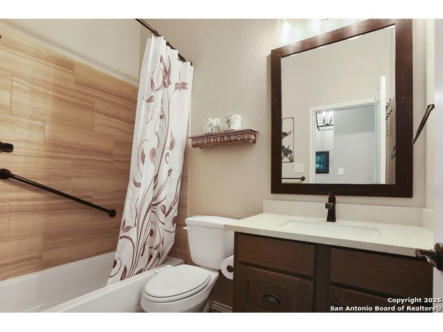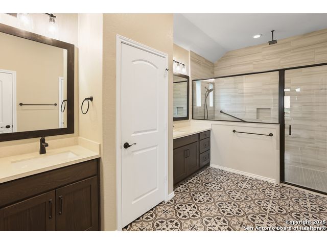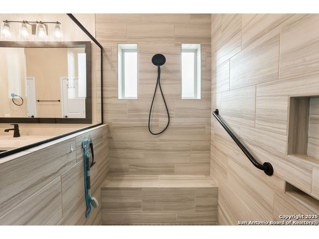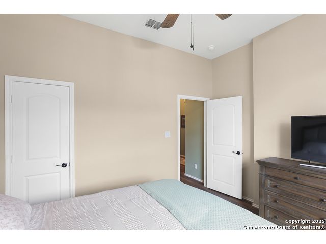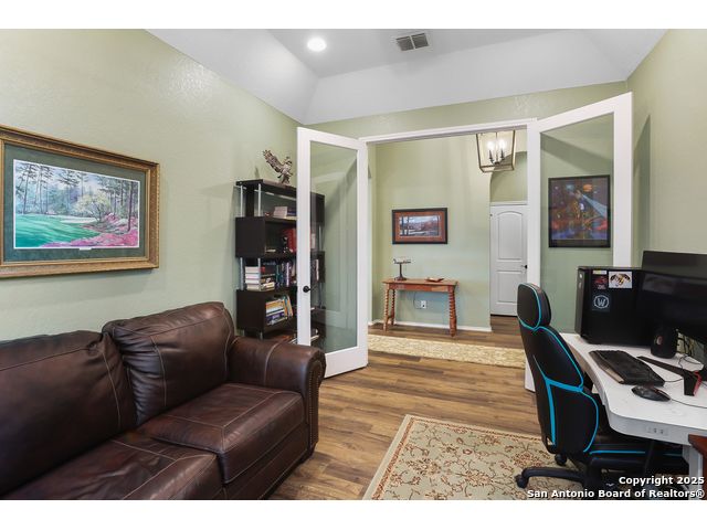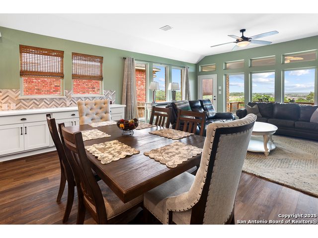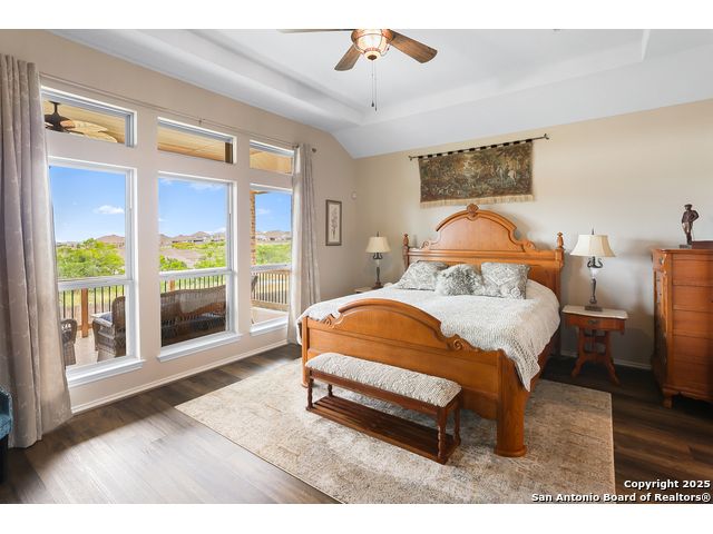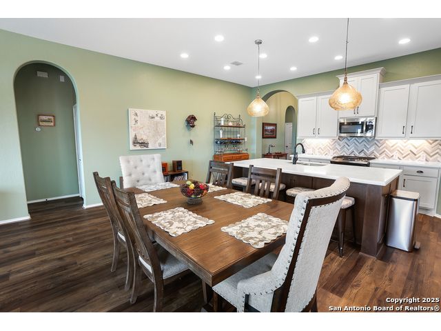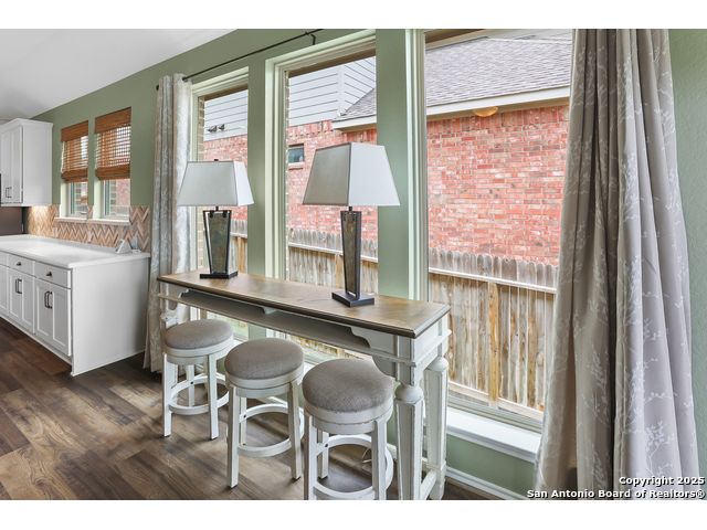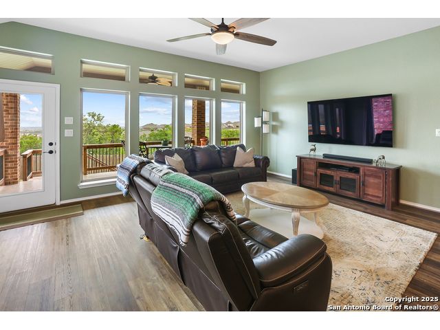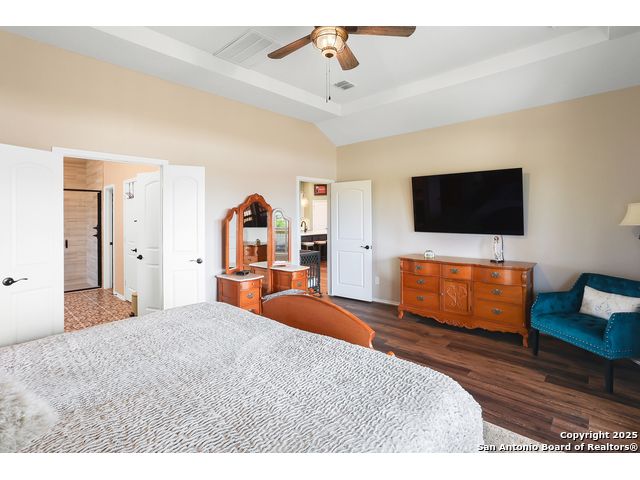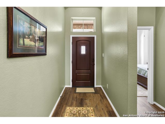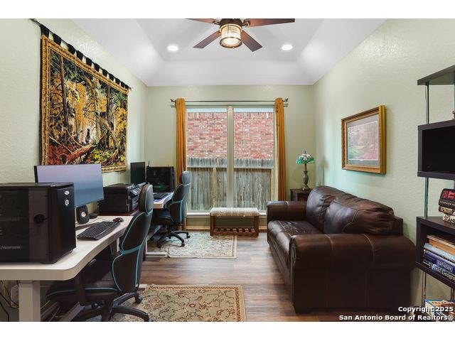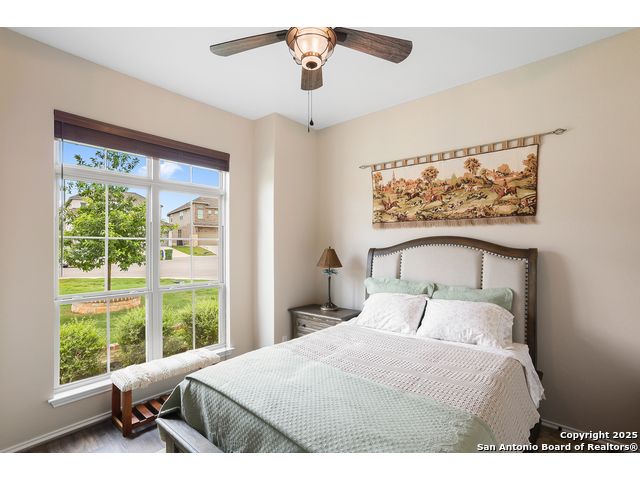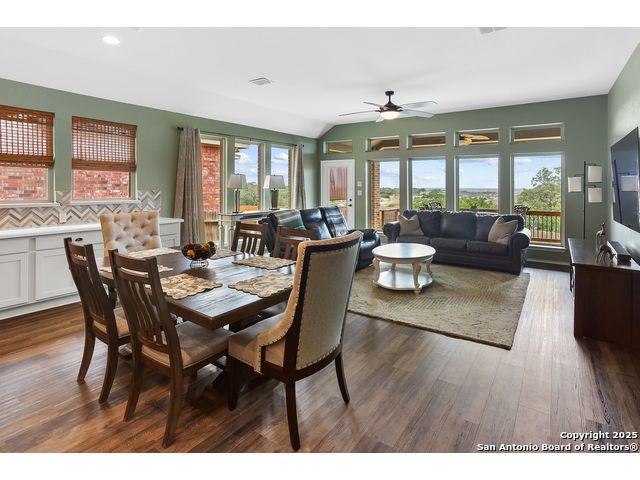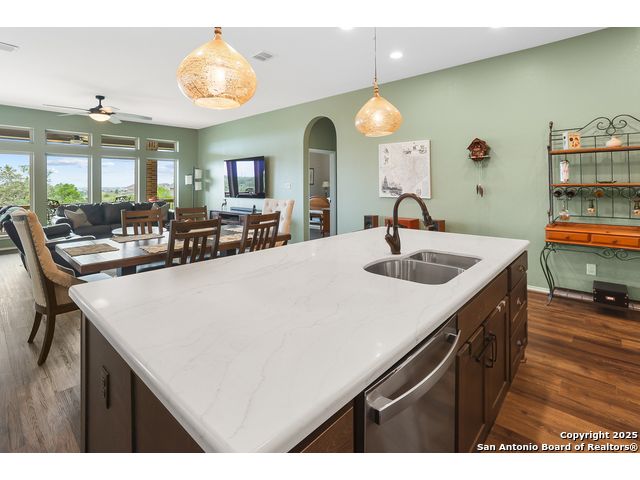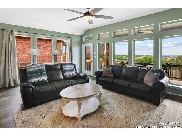 Stunning views! Welcome to this immaculate, beautifully upgraded, single-story Perry-built home, nestled on a spacious 50-ft. cul-de-sac lot in a sought-after community with fantastic amenities. Boasting 3 bedrooms plus study or 4th bedroom, 2 baths, and a 3-car tandem garage with durable epoxy flooring, this home offers both style and functionality. Step inside to an open living concept with soaring high ceilings, abundant natural light through beautiful windows, and elegant finishes throughout. Ceiling fans in all bedrooms and living areas ensure year-round comfort. The chef's kitchen is a true showpiece, equipped with stainless steel appliances, extended 42" cabinets, under-cabinet lighting, stone countertops, pendant lights, and a striking chevron backsplash. Designer touches like Venetian bronze faucets and luxury vinyl plank flooring add a touch of sophistication. Retreat to the spacious primary suite featuring dual walk-in closets, double vanities, beautiful tile floors, and a luxurious walk-in shower. Enjoy morning coffee and terrific views outside on the extended covered patio with epoxy flooring and iron balusters. Additional features include a tankless water heater, water softener, and an extra-long driveway perfect for guest parking or multiple vehicles. Located in a beautiful, amenity-rich community with pool, playground, scenic jogging trails, and pickleball courts, and with easy access to major employers like the Microsoft Data Center, Boeing, Sea World, and Lackland AFB, this home offers the perfect blend of comfort, convenience, and modern elegance. Make an appointment to view today and don't miss your opportunity to own this exceptional, move-in-ready home!