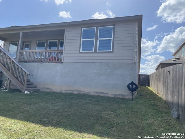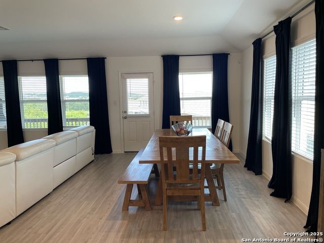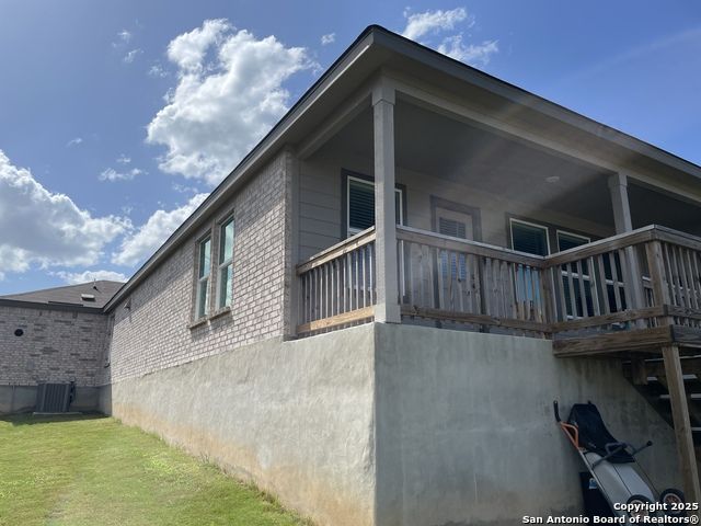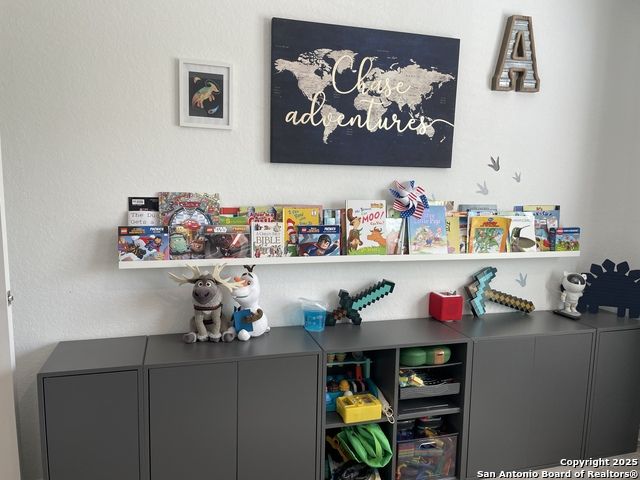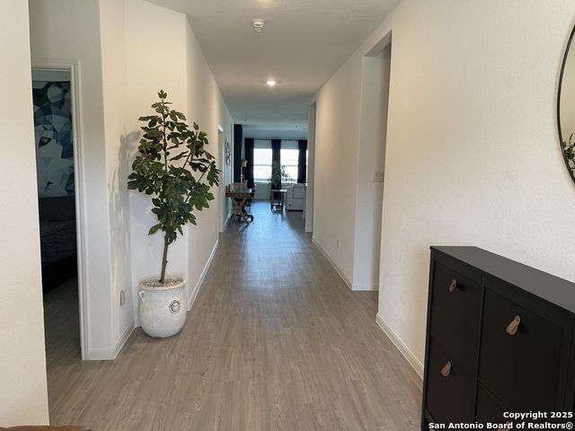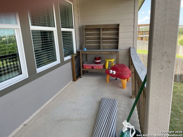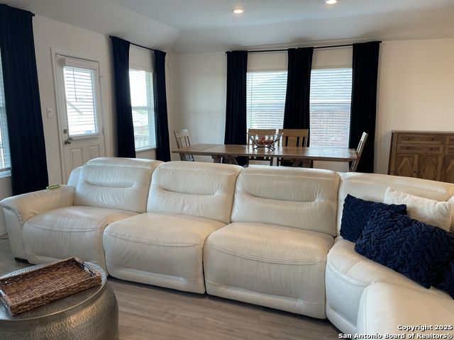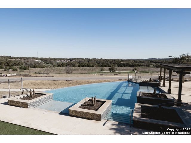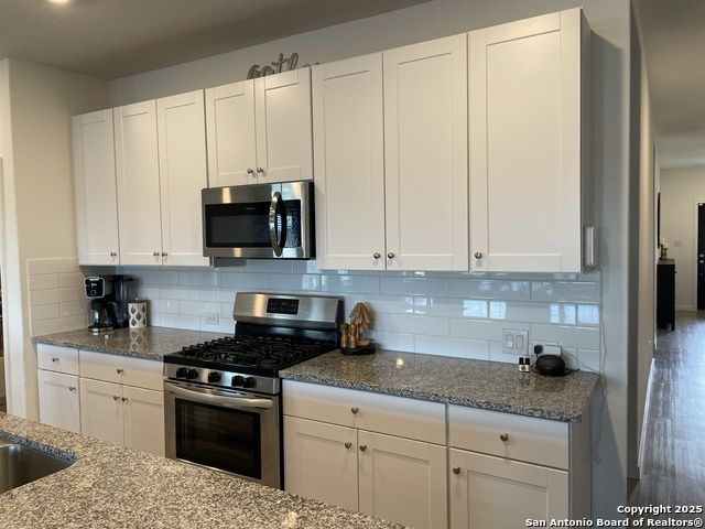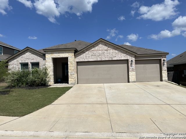 Welcome home! This warm 4 bedroom 3full bathroom, single story home is cozy and perfect for a growing family or anyone looking for space and comfort. An huge elongated entryway offers access to auxiliary bedrooms and bathrooms, there are elegant and unique lighting fixtures throughout the home, upgraded all faucets and the windows throughout welcome tons of natural light. There is a Microwave oven and Gas range in the kitchen along with a massive island and additional granite counter space, perfect for the chef in the family. The spacious living/dining room combo is accentuated by a lovely encased electric "mock" fireplace. There is a Bonus room perfect for a home office or craft room, etc. There is an airy primary suite with custom closet inserts. The back porch overlooks a nice size backyard with hill country views. This home also has a 3-car garage. The neighborhood has walking and biking trails, two swimming pools, a splash pad, basketball court, a playground, exercise facilities and clubhouse. At contracted buyer's request, sellers will paint over custom ceiling and wall in auxiliary bedrooms. Schedule a showing today!