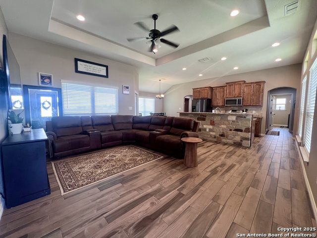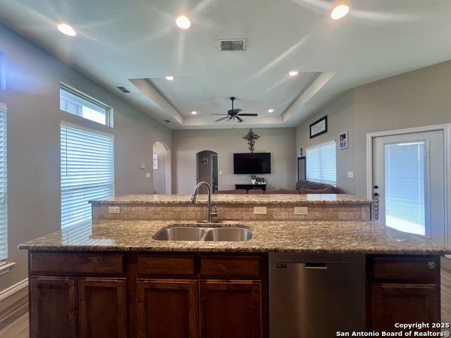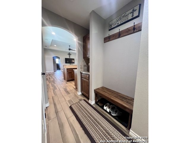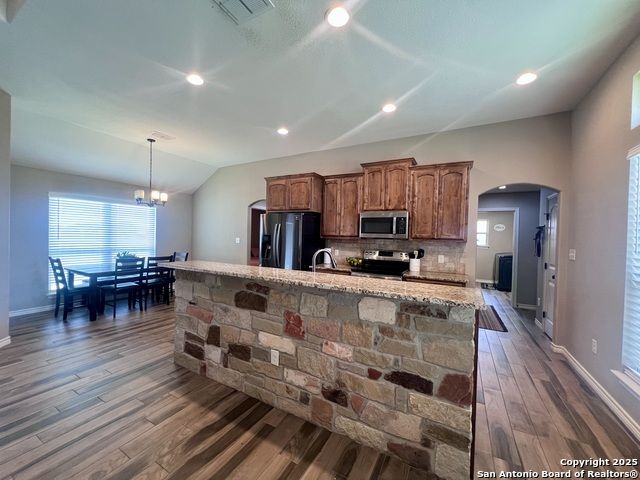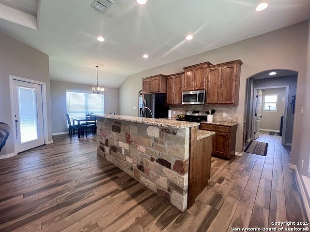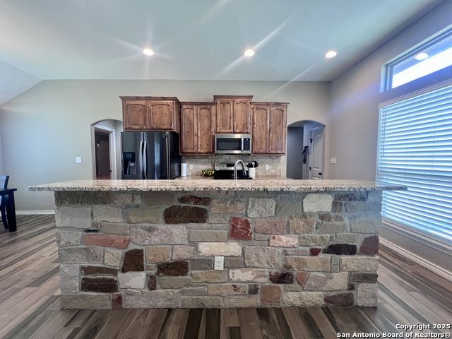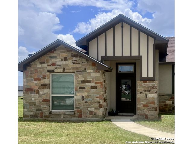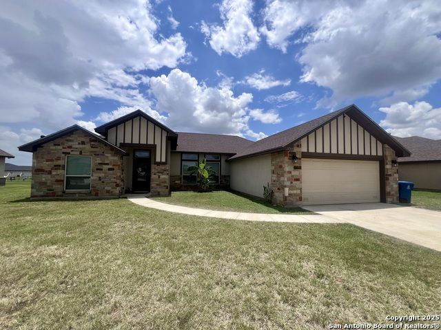 Here comfort meets contemporary elegance in a harmonious blend! This stunning residence boasts a striking rock and stucco exterior, exuding curb appeal that will only become more impressive with your own personal touch. Make your neighbors green with envy with your green thumb! As you step through the inviting front door, you're greeted by a natural light drenched open concept living area. The seamless flow between the living room, dining area and kitchen ensures that no one feels left out, whether you're whipping up culinary masterpieces or sharing laughter over a delicious meal. This delightful home features 3 bedrooms, each thoughtfully designed to maximize privacy and tranquility. The split floor plan provides a serene master suite that promises restful nights, privacy and direct access to the laundry room. The granite countertops and wood look tile floors add warmth and character while providing practical durability. Every corner of this house is meticulously crafted, radiating a sense of style and comfort that invites you to kick off your shoes in the mudroom, grab a cup of joe from the coffee bar and sidle up to the breakfast bar or relax with your feet up in the living room. Located in a desirable neighborhood and constructed by a trusted local builder.