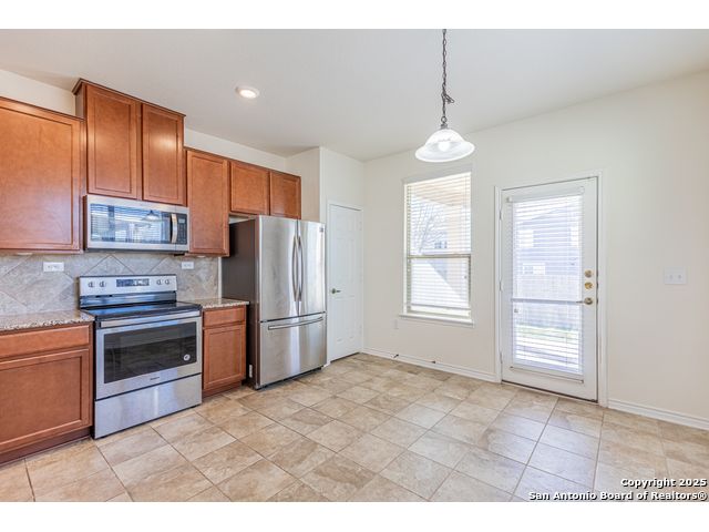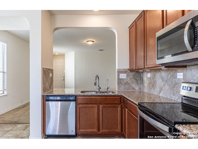 Beautiful home in excellent condition! Stone & brick exterior. Split bedroom layout offers privacy. High ceilings and open floorplan. Stainless steel appliances and granite countertops. Great backyard with privacy fence and large covered patio. Wonderful neighborhood with amenities such as park and playground!