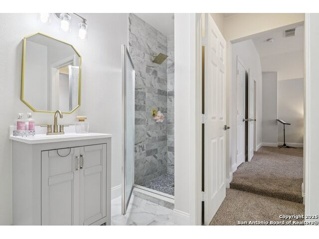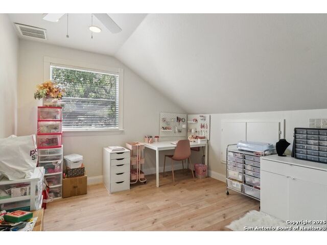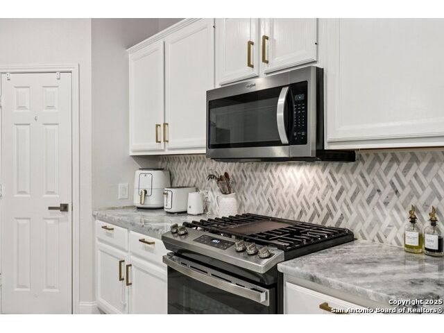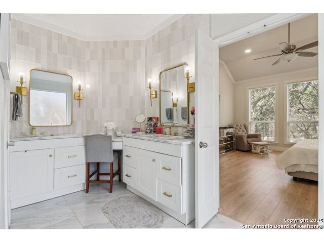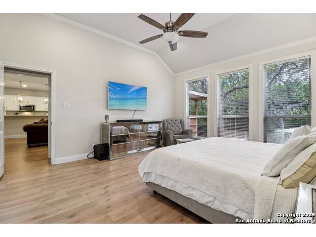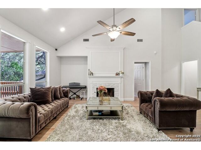 Discover the epitome of elegance in this stunning home, featuring a primary bedroom downstairs that overlooks a Greenbelt area and is privately located off a Cul-De-Sac street, nestled in one of San Antonio's most sought-after neighborhoods, North Central - The Vineyard. Enjoy the convenience of being just a short stroll away from vibrant shopping areas and a variety of fantastic dining options. Step inside to experience the expansive living areas adorned with floor-to-ceiling windows that flood the space with natural light, creating an inviting and airy atmosphere. The thoughtfully designed open floor plan features soaring vaulted ceilings and a cozy fireplace, adding to the charm of the family room. Retreat to the spacious primary suite, where you can savor serene views of your private backyard oasis. The versatile upstairs game room and office area offer the perfect solution for live-in help or family visits, featuring a full bath and a separate bedroom for added privacy. On the opposite side of the split staircase, you'll find two additional generously sized bedrooms that share a well-appointed bath. Culinary enthusiasts will delight in the kitchen, designed for both cooking and entertaining with its abundant counter space. Step outside to the impressive covered deck, the ideal setting for enjoying the outdoors throughout the seasons. This home is not just a place to live; it's the perfect backdrop for unforgettable social gatherings!