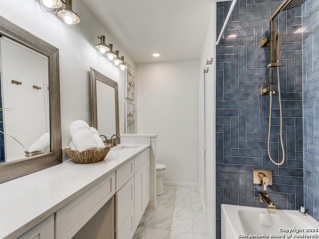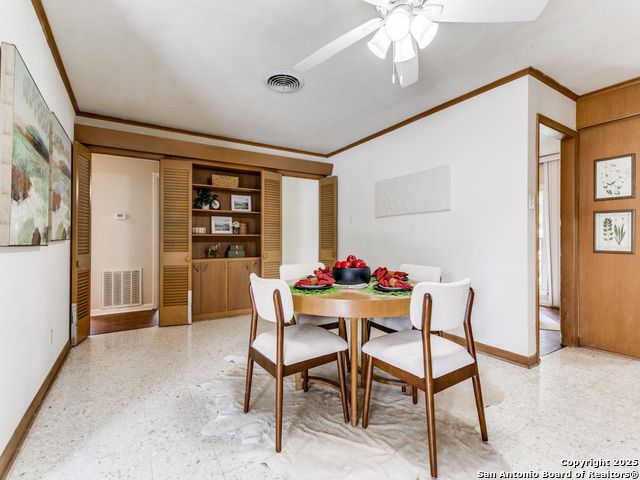 Welcome to 7014 Scotsdale in the desirable Meadow Wood Estates, a well-established neighborhood in San Antonio zoned to the acclaimed Alamo Heights Independent School District. This beautifully maintained single-story brick home offers 4 bedrooms, 2 bathrooms, and over 2,260 square feet of versatile living space, seamlessly blending mid-century charm with contemporary updates for effortless modern living. Enter into a light-filled living area featuring neutral palettes that creates an open and welcoming ambiance ideal for relaxation or gatherings. Adjacent is a dedicated home office space with an abundance of natural lighting, hardwood flooring, providing a serene environment for productivity. The kitchen serves as the home's centerpiece, boasting warm wooden cabinetry, a functional U-shaped layout with crisp white countertops, stainless steel appliances, and a convenient breakfast bar-perfect for daily meals and entertaining. The open dining area connects fluidly to the kitchen, illuminated by a ceiling fan and offering easy access to adjacent spaces for gracious hosting. A cozy family room highlights a striking brick fireplace with mantel and sconce lighting, accented by sliding glass doors that invite seamless indoor-outdoor flow to the backyard. Updated bathrooms impress with modern touches, including a sleek white vanity, dual mirrors, stylish lighting, and a spa-inspired shower featuring blue herringbone tile, gold fixtures, and marble-look flooring. The primary bedroom exudes tranquility, complete with a ceiling fan for comfort, soft neutral tones, and window treatments that enhance privacy while allowing natural light to filter in. Outside, the home's inviting curb appeal is enhanced by a manicured lawn, mature shade trees, a curved walkway, and an attached two-car garage. The backyard provides a spacious concrete patio for outdoor enjoyment, complemented by lush greenery and ample room for leisure. This Meadow Wood Estates treasure combines timeless design, practical flow, and an enviable location!