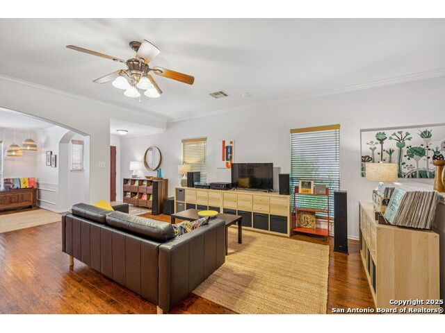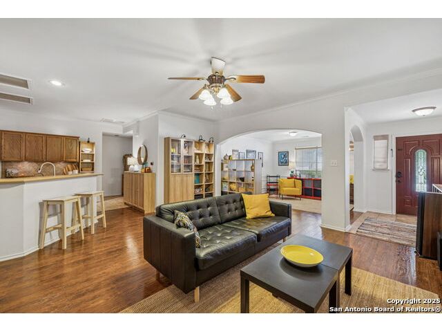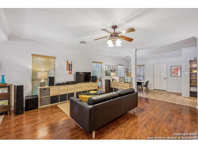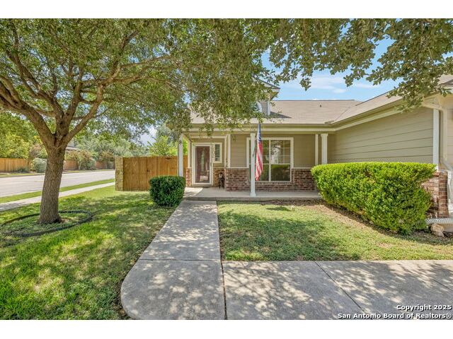 Tucked on a beautifully landscaped corner lot, this stunning single-story home blends charm, style, and functionality. From its inviting brick and Hardie board facade to the columned front porch, the curb appeal is undeniable. Inside, high ceilings, arched doorways, wainscoting, crown moulding, and extra-wide paneled doors create an elegant atmosphere. The open floor plan flows seamlessly, with a spacious kitchen at its heart-complete with a large island, breakfast bar, stainless steel sink, gas range, and built-in microwave-perfect for easy entertaining and everyday living. The serene primary suite offers a true retreat, featuring a stylish ceiling fan, spa-like bathroom with dual vanities, garden tub, separate shower, and a spacious walk-in closet. Secondary bedrooms are inviting and roomy. One bedroom reinvented into a customized craft room. Step outside to your private backyard oasis, where a generous patio with a Cedar post pergola sets the scene for memorable gatherings. Mature oak, olive, plum and fig trees along with lush foliage, make this garden feel like your own Eden. Washer/dryer combo, refrigerator and freezer convey! Located close to Forester Elementary and the neighborhood recreation center. Residents of Trophy Ridge enjoy incredible amenities: a Jr. Olympic sized pool, playground, basketball courts, BBQ areas, and a peaceful shaded jogging trail. With quick access to shops, HEB, restaurants, medical services, and major highways, this home is ideal for first-time buyers, downsizers, or investors alike. Don't miss your chance to experience this gem-welcome home!