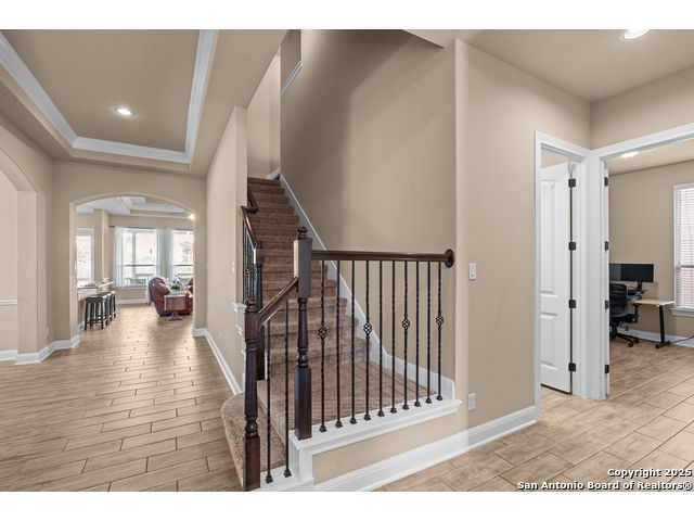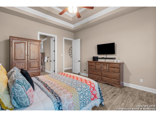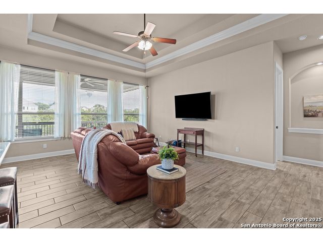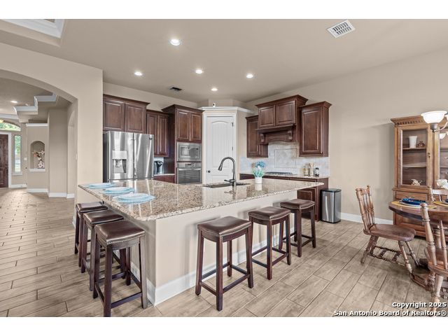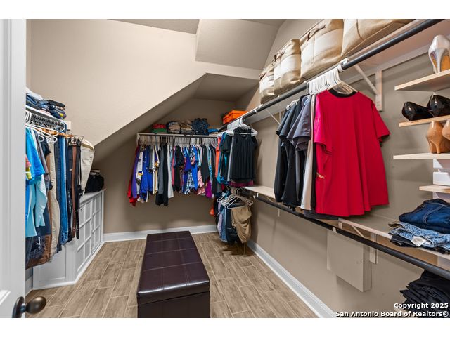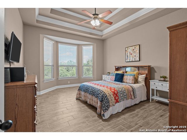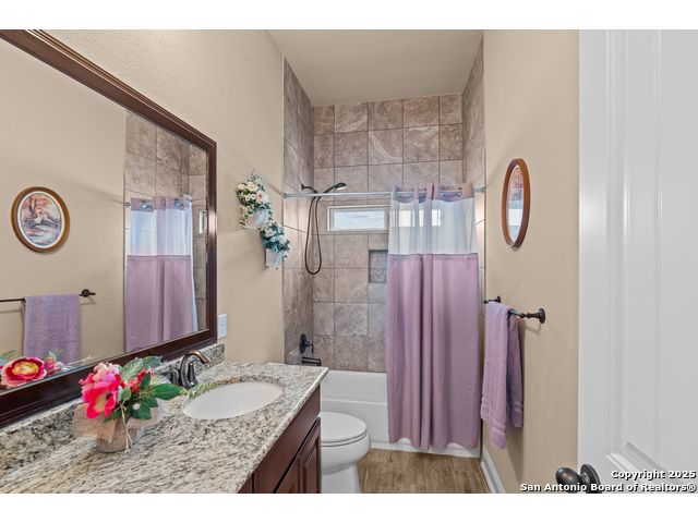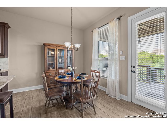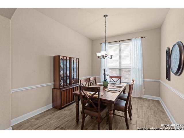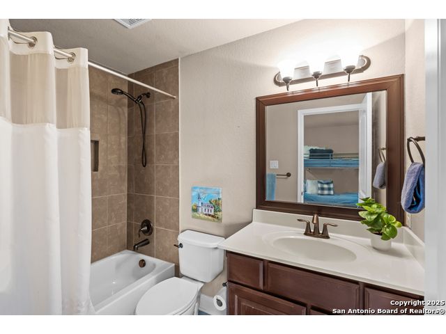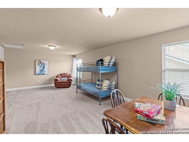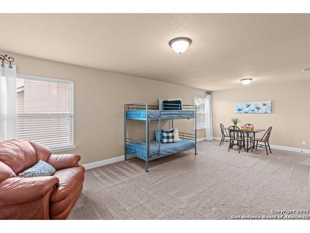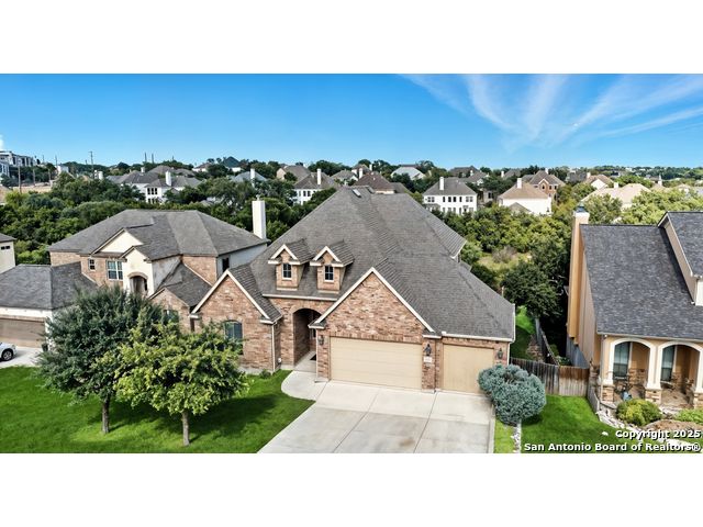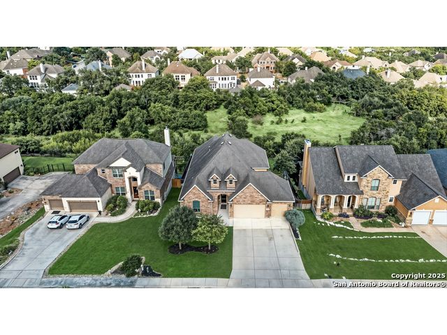 WELCOME HOME to this immaculate 1.5-story home tucked away on a cul-de-sac street and backing to a beautiful greenbelt in highly desirable Mountain Lodge! **VA Assumable for eligible veterans at 2.25%.** Designed for both comfort and flexibility, this open and thoughtfully planned layout features three spacious bedrooms and three full baths, a formal dining room, plus a versatile flex room ideal for a home office, workout space, or fourth bedroom (note: no closet, but not a Texas requirement for a bedroom), all on the main level. Upstairs, a large game room with its own full bath and walk-in closet offers the perfect opportunity for a private guest suite, or even a fifth bedroom, if desired. At the heart of the home is a chef's kitchen featuring stainless steel appliances, gas cooking, granite countertops, a walk-in pantry, and an oversized L-shaped island with counter-height seating that opens to the breakfast area and family room perfect for everyday living or gathering with friends and family. A wall of windows along the back of the home fills the space with natural light and showcases the serene greenbelt views. The primary suite serves as a relaxing retreat with new wood-like tile flooring in the bedroom, a large walk-in shower with full tile surround, a garden tub, and a spacious walk-in closet. Additional highlights include tall and coffered ceilings, wood-look tile throughout the main level, granite counters and framed mirrors in all bathrooms, a three-car garage, a recently replaced water heater, whole-house water filtration system, water softener, gutters, and so much more. Out back, enjoy an extended covered patio with a rich wood ceiling and two ceiling fans perfect for peaceful mornings, outdoor dining, or unwinding in the evening. There's under-deck storage and plenty of space to run, play, or explore the greenbelt. A gas stub on the patio makes outdoor grilling a breeze. This home offers the perfect blend of style, comfort, and relaxed Hill Country living all just a short walk from one of the community pools. Mountain Lodge is a gated community with two entrances, two large pools, baby pools with sunshades, a park, and a basketball court. The home is zoned to award-winning NEISD schools and is within walking distance to Tuscany Heights Elementary. With the completion of highway construction, HWY 281 now provides quick access to 1604 and beyond. This location is convenient to the JW Marriott TPC golf course, Stone Oak shopping and dining, hospitals, and major employers-all with no city taxes. Don't miss out!