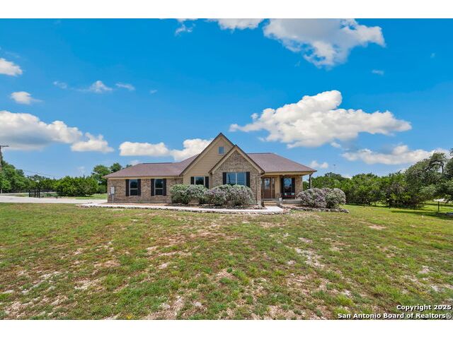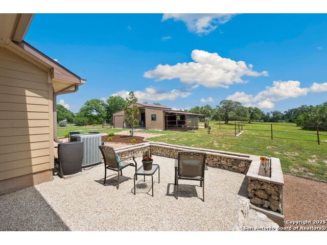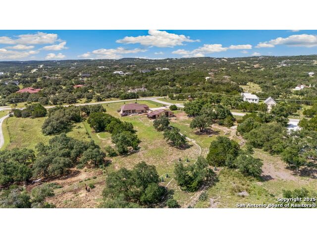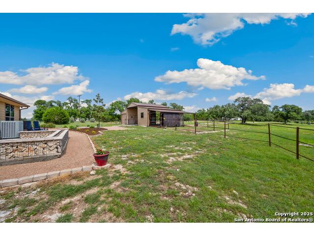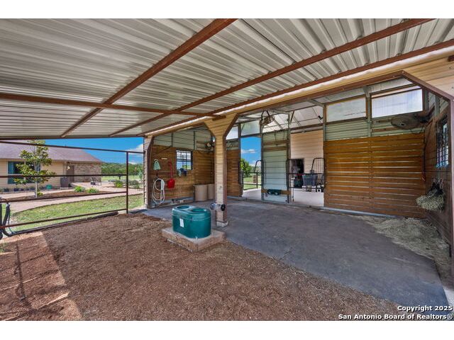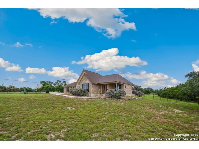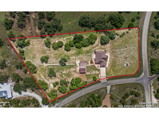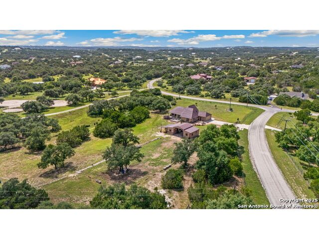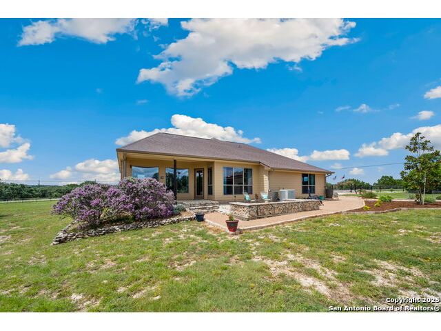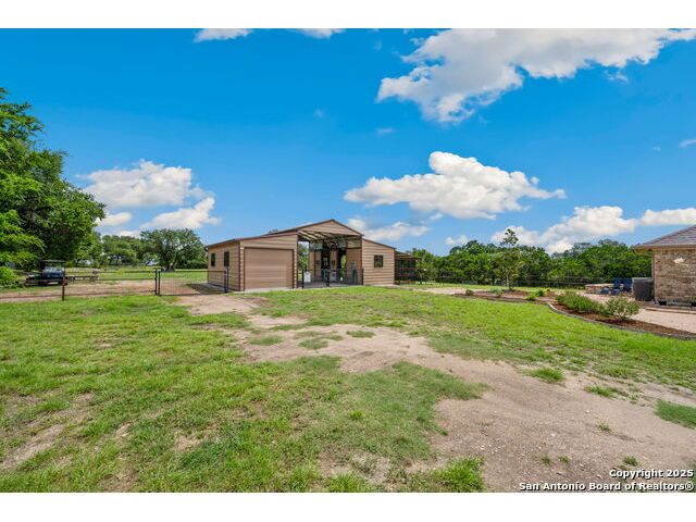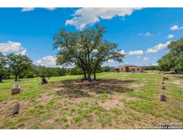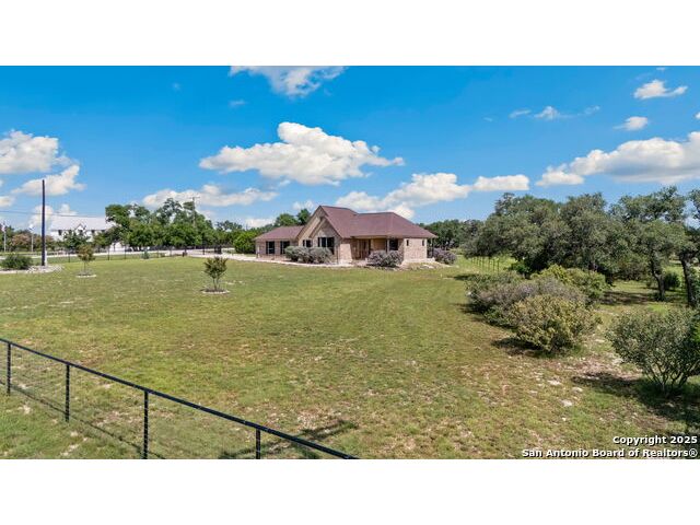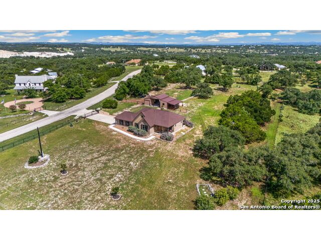 Welcome to your dream retreat in the heart of the Texas Hill Country. Set on 3 fully fenced acres, this turnkey property offers the perfect combination of comfort, functionality, and natural beauty. The 2,010 sq ft home features a well-designed split floor plan with 3 bedrooms and 2 bathrooms, including walk-in showers in both baths and a spacious primary suite with dual sinks. Large windows throughout the home provide stunning views of the surrounding acreage and mature trees, filling the space with natural light and a sense of tranquility. The property features a 42x26 metal building currently used for 2 horses, with attached 12x26 run-in stall (convertible to two 12x13's), separate enclosed hay storage area, large tack room, water and electric. This building can also be used for MULTI PURPOSE storage or workspace, as well as for other animals enrolled in 4-H and FFA school sponsored programs.. The land is perimeter fenced with durable pipe rail and woven wire, plus electric tape cross fencing for added safety and flexibility. Equestrians will appreciate the 100' x 200' natural footing riding area, ideal for training or leisurely rides. The level lot is shaded by beautiful, mature trees, offering a peaceful and picturesque setting that's rare to find. Whether you're riding in the pasture, taking in the view from the comfort of your living room, or simply enjoying the quiet, this property has everything you need to live the Hill Country lifestyle. Located in Mystic Shores-one of the Hill Country's premier communities-residents enjoy world-class amenities including two swimming pools, tennis, pickle ball, basketball, and volleyball courts, a community center, two lakeside parks with grilling and picnic areas, and a 200+ acre nature preserve. This is a rare opportunity to own a ready-to-go horse property (only 2 horses allowed for this size lot) in one of Texas's most scenic regions.