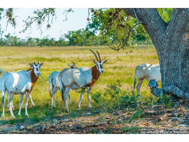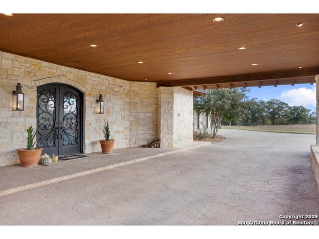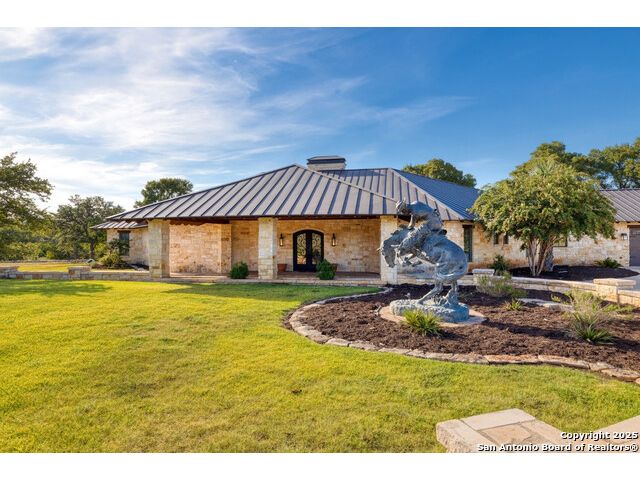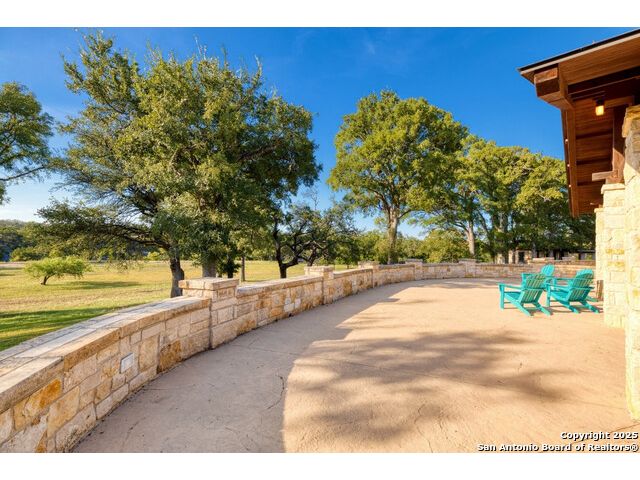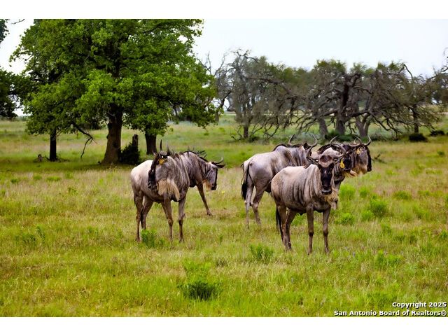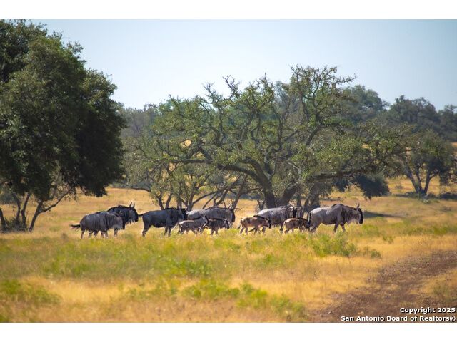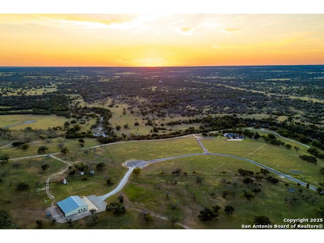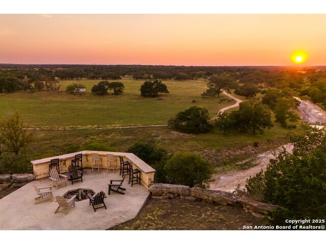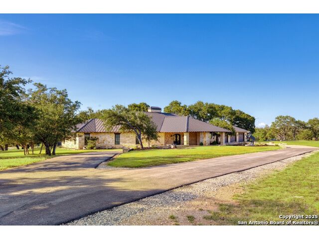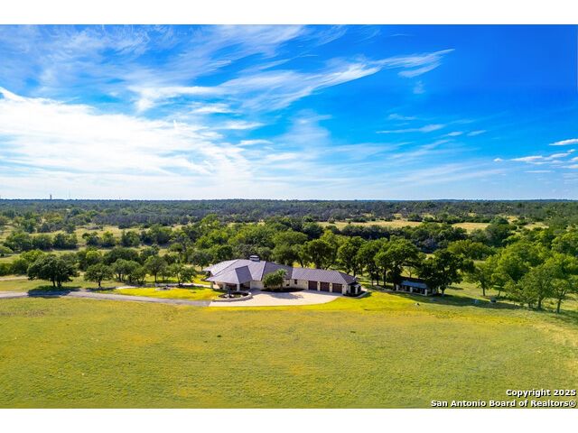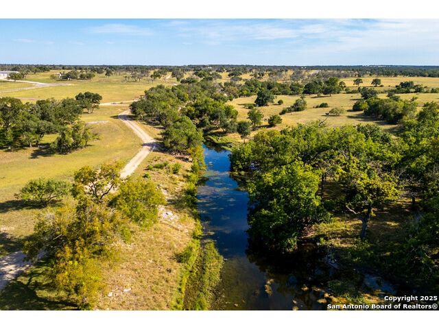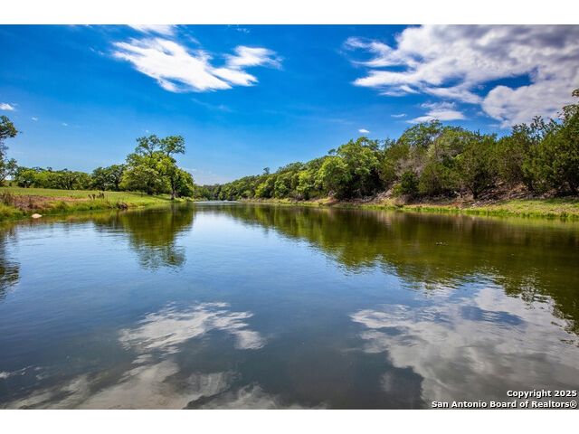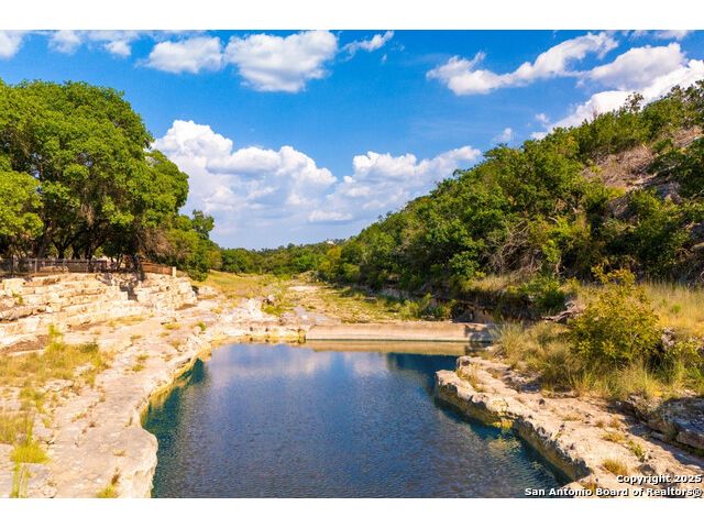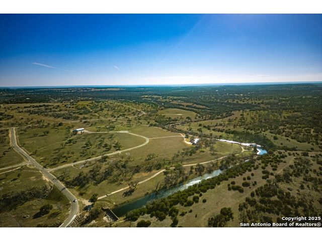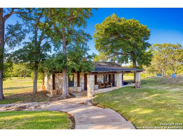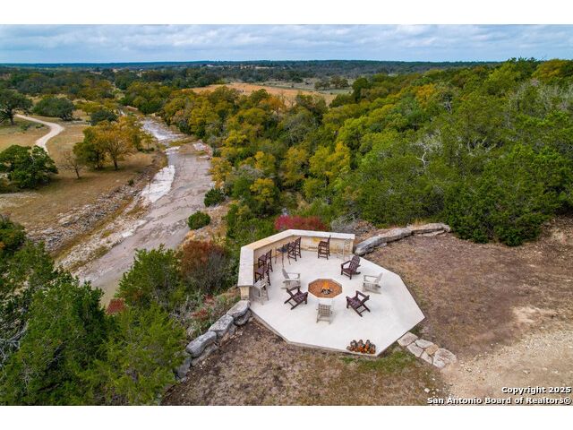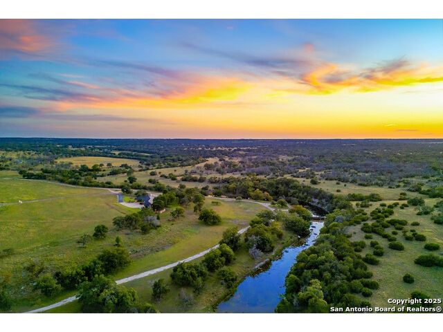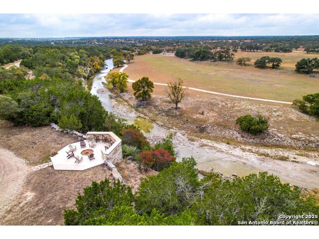 Experience the best of both worlds at this breathtaking 28.15-acre live water ranch, where serene Hill Country landscapes meet refined comfort and modern ease. Nestled in a lush bend of spring-fed Stevens Creek-and secured by a concrete dam that ensures year-round water flow-this turnkey estate invites you to swim, kayak, fish, or simply unwind along your own private stretch of live water. Located within one of the Hill Country's most prestigious and thoughtfully designed communities, it offers an extraordinary blend of elevated rural living, long-term investment appeal, and seamless access to upscale dining, boutique shopping, and everyday essentials. The main residence, a beautifully crafted 2013 White Rock home, is gracefully tucked beneath tall oak canopies, surrounded by native wildlife and dramatic creekside bluffs. From the moment you arrive, the attention to detail is clear-from the expansive paved circle drive and porte-cochere to the grand western statue that welcomes guests at the entrance. Inside, custom finishes abound: heavy wrought iron double doors, hand-hewn cedar beams, vaulted wood ceilings, rich woodwork, and multiple fireplaces set the tone. The open-concept kitchen is both stylish and functional, featuring a large island, high-end appliances, and a walk-through butler's pantry. Step outside to the vaulted, cedar-beamed back patio, where an expansive stone terrace stretches beneath the oaks and overlooks the creek-perfect for quiet mornings or lively outdoor gatherings. One of the home's most impressive and unique features is the indoor/outdoor firepit room, thoughtfully designed for year-round enjoyment. This grand entertaining space includes a floor-to-ceiling gas firepit, recessed rock wet bar with cedar beam accents, wine cooler, mini fridge, and built-in grill with vent hood. With a full wall of sliding glass doors that open to the outdoors and interior doors that close it off from the rest of the house, the space easily transforms for the season, weather, or occasion. Down a stone path from the main home sits the Game House-an inviting space perfect for entertaining and hosting guests. With a cozy living area, a full bath, cedar bar, built-in kegerator, and plenty of room for games and lounging, this space functions beautifully as a second living quarters, private hangout, or creative retreat. At the far end of the property, a 90x74' commercial-grade steel building offers unmatched functionality and space. Fully insulated and equipped with five 12x10 garage doors, it includes a finished HVAC living area with kitchenette and full bath-perfect for guests, caretakers, or added income potential. The barn offers ample storage for RVs, equipment, or even your classic car collection, with 14 covered parking bays and full water and electric hookups. This incredible estate is located within the prestigious Maverick community, a high-end, amenitized development known for its privacy, beauty, and attention to detail. Residents enjoy a high-fenced perimeter with roaming exotic wildlife, a gated entrance, paved roads, underground utilities, on-site groundskeeper, fiber internet, and more. With live water, luxury improvements, and multiple acreage purchase options available, this one-of-a-kind retreat offers the perfect blend of natural serenity, upscale living, and future flexibility-all in the heart of the Texas Hill Country. Smaller Acreage Purchase Options: Lot 22: 10.57+/- Acres | Lot 22+21: 16.20+/- Acres