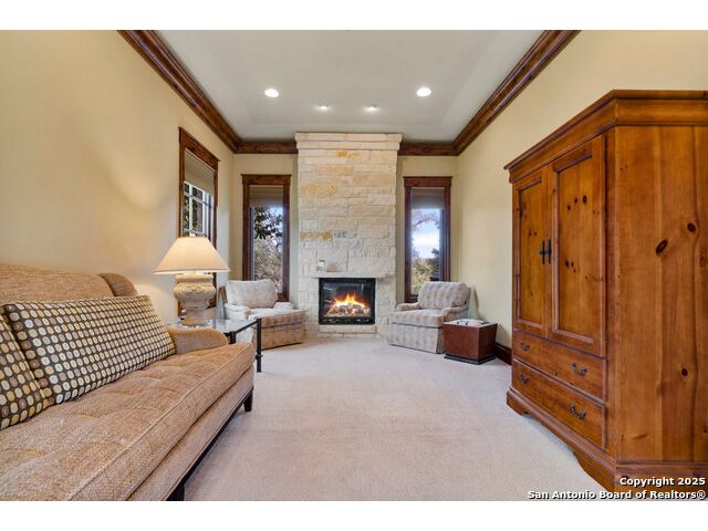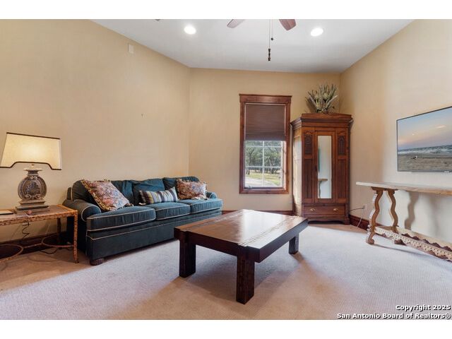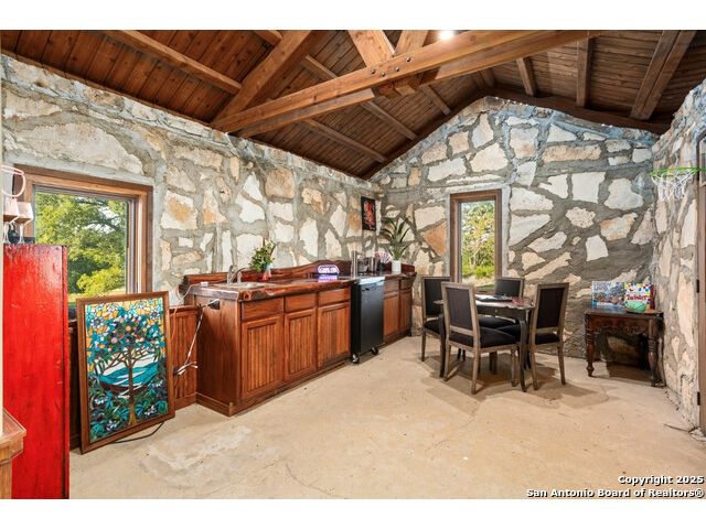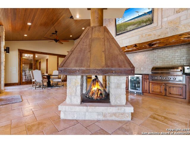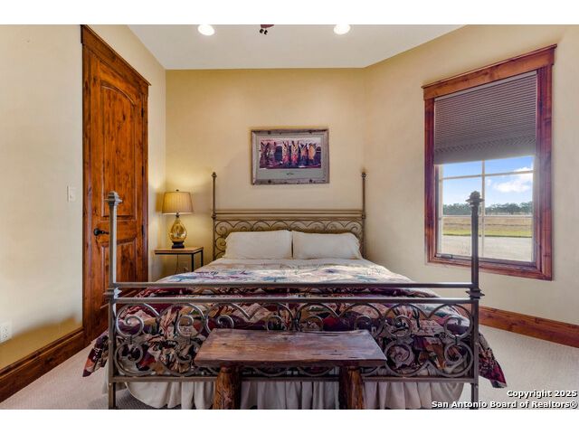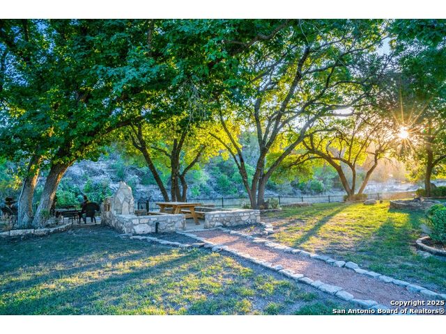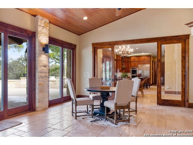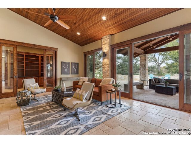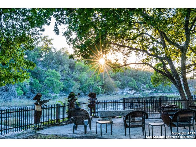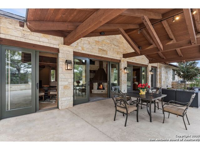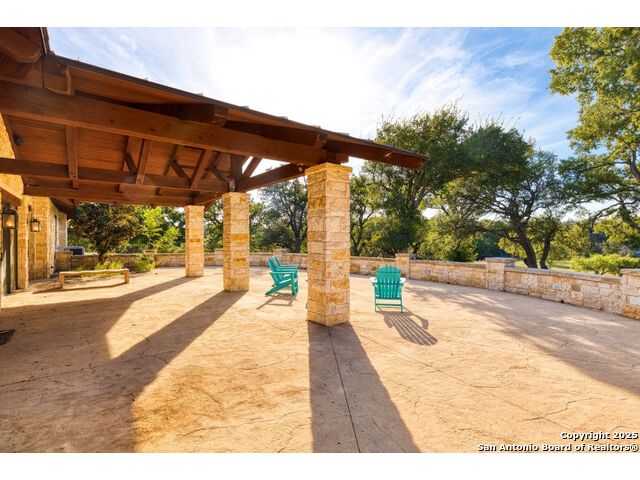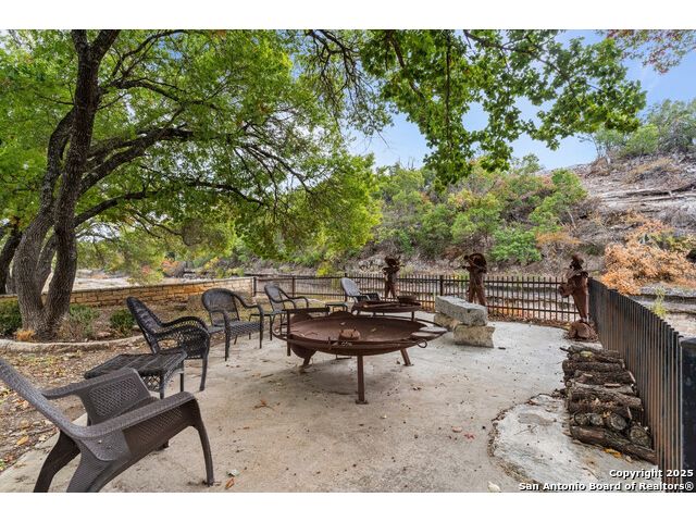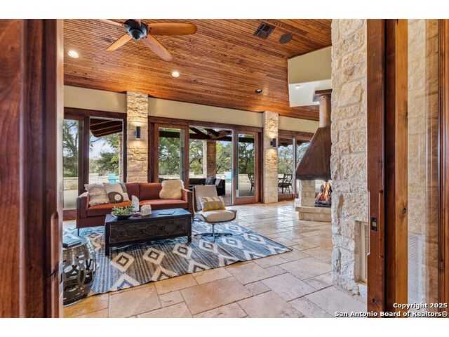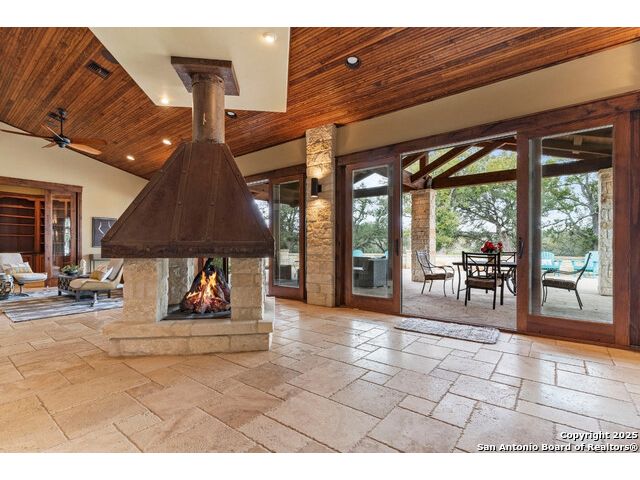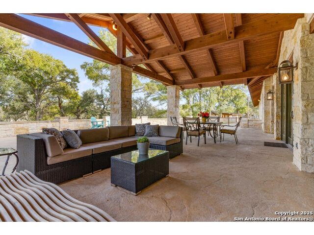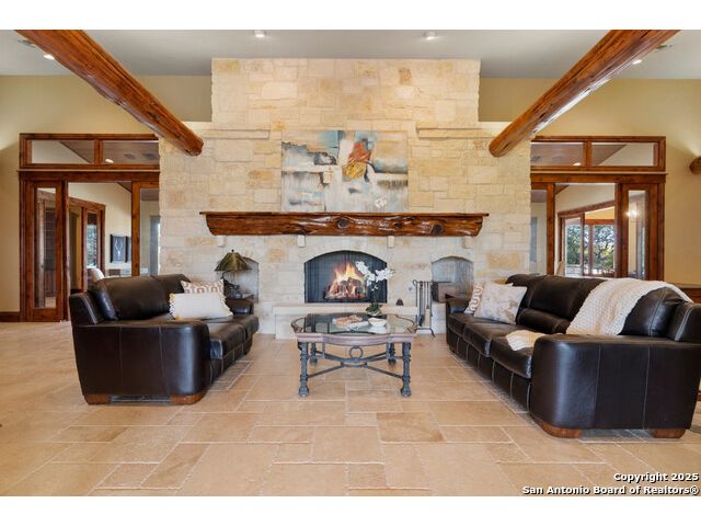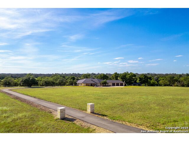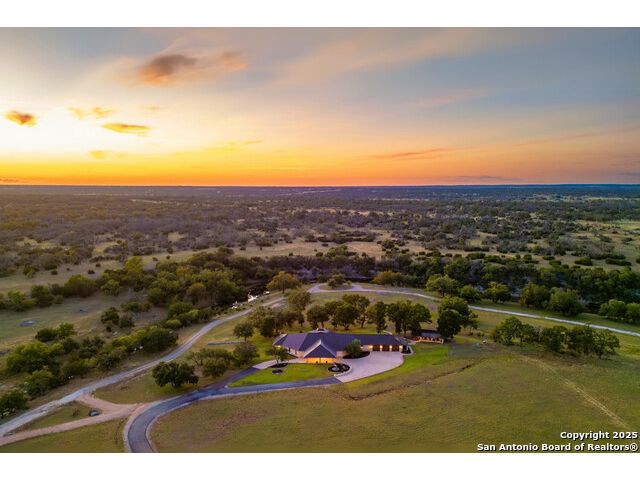 Experience the best of both worlds at this breathtaking 28.15-acre live water ranch, where serene Hill Country landscapes meet refined comfort and modern ease. Nestled in a lush bend of spring-fed Stevens Creek-and secured by a concrete dam that ensures year-round water flow-this turnkey estate invites you to swim, kayak, fish, or simply unwind along your own private stretch of live water. Located within one of the Hill Country's most prestigious and thoughtfully designed communities, it offers an extraordinary blend of elevated rural living, long-term investment appeal, and seamless access to upscale dining, boutique shopping, and everyday essentials. The main residence, a beautifully crafted 2013 White Rock home, is gracefully tucked beneath tall oak canopies, surrounded by native wildlife and dramatic creekside bluffs. From the moment you arrive, the attention to detail is clear-from the expansive paved circle drive and porte-cochere to the grand western statue that welcomes guests at the entrance. Inside, custom finishes abound: heavy wrought iron double doors, hand-hewn cedar beams, vaulted wood ceilings, rich woodwork, and multiple fireplaces set the tone. The open-concept kitchen is both stylish and functional, featuring a large island, high-end appliances, and a walk-through butler's pantry. Step outside to the vaulted, cedar-beamed back patio, where an expansive stone terrace stretches beneath the oaks and overlooks the creek-perfect for quiet mornings or lively outdoor gatherings. One of the home's most impressive and unique features is the indoor/outdoor firepit room, thoughtfully designed for year-round enjoyment. This grand entertaining space includes a floor-to-ceiling gas firepit, recessed rock wet bar with cedar beam accents, wine cooler, mini fridge, and built-in grill with vent hood. With a full wall of sliding glass doors that open to the outdoors and interior doors that close it off from the rest of the house, the space easily transforms for the season, weather, or occasion. Down a stone path from the main home sits the Game House-an inviting space perfect for entertaining and hosting guests. With a cozy living area, a full bath, cedar bar, built-in kegerator, and plenty of room for games and lounging, this space functions beautifully as a second living quarters, private hangout, or creative retreat. At the far end of the property, a 90x74' commercial-grade steel building offers unmatched functionality and space. Fully insulated and equipped with five 12x10 garage doors, it includes a finished HVAC living area with kitchenette and full bath-perfect for guests, caretakers, or added income potential. The barn offers ample storage for RVs, equipment, or even your classic car collection, with 14 covered parking bays and full water and electric hookups. This incredible estate is located within the prestigious Maverick community, a high-end, amenitized development known for its privacy, beauty, and attention to detail. Residents enjoy a high-fenced perimeter with roaming exotic wildlife, a gated entrance, paved roads, underground utilities, on-site groundskeeper, fiber internet, and more. With live water, luxury improvements, and multiple acreage purchase options available, this one-of-a-kind retreat offers the perfect blend of natural serenity, upscale living, and future flexibility-all in the heart of the Texas Hill Country. Smaller Acreage Purchase Options: Lot 22: 10.57+/- Acres | Lot 22+21: 16.20+/- Acres