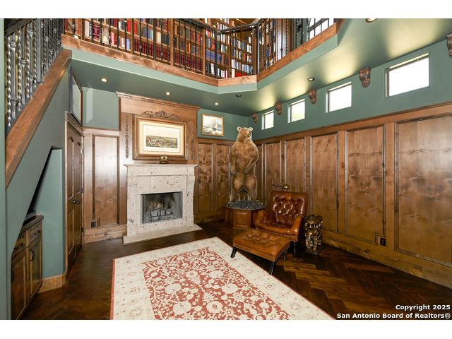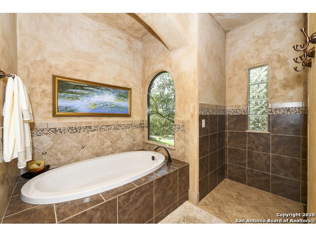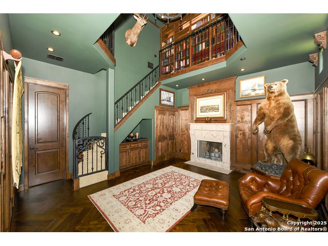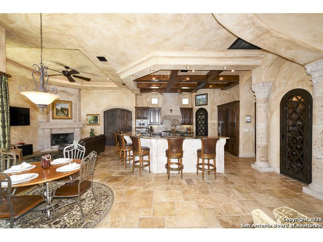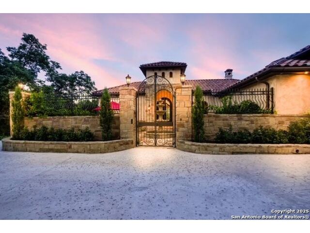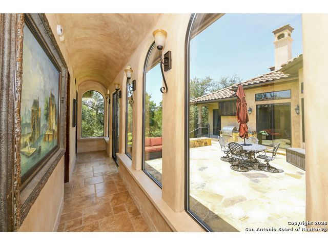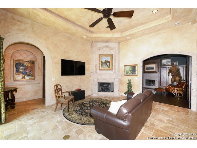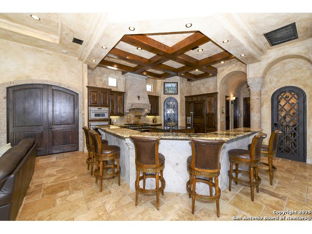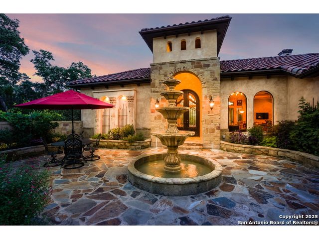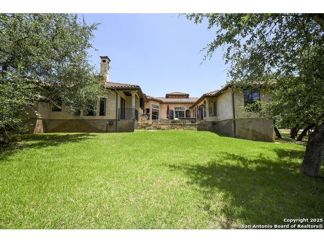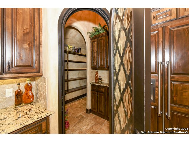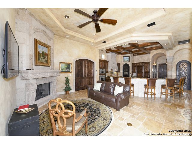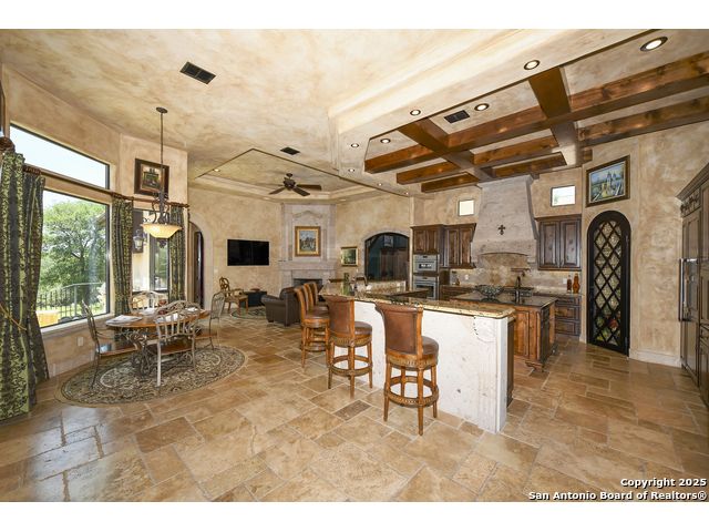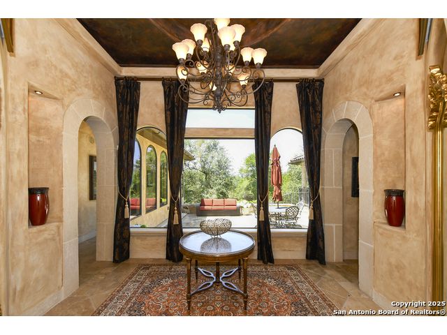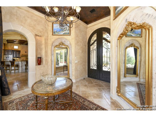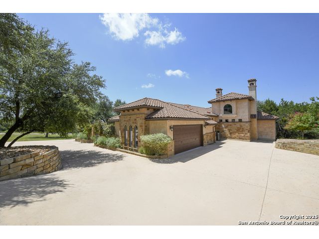 Amazing one of a kind custom built home on an acre in the hill country community of River Chase. True craftsmanship and premium materials, creating stunning living spaces. The sprawling modern floor plan features high ceilings, floor-to-ceiling windows, and stained wood T&G ceilings, flooding the interiors with abundant natural light. Custom ceiling and architectural details, upgraded light fixtures, a Cantera stone fireplace surround, and Versailles-pattern travertine flooring elevate the home's elegance. The chef's kitchen boasts Thermador stainless steel appliances, including a built-in refrigerator, dual dishwashers, a dual oven range, and an additional wall oven. The oversized master retreat offers herringbone-pattern wood floors, patio access, a spa-like bath with an oversized shower featuring three shower heads and a rain head, an expansive walk-in closet, and direct access to the study. Spacious guest suites come with large walk-in closets and built-in Murphy beds. Interior upgrades include an underground wine cellar, a two-story library with wood paneling on walls and ceilings, a temperature-controlled wine room, a central vacuum system, chiseled travertine, and herringbone wood flooring. Additional features are a slide-out coffee station in both the kitchen and master, old world stucco interior walls, powder bath, and guest room, and high-level granite and marble surfaces throughout. The serene outdoor space includes a large flagstone patio with a summer kitchen, an outdoor TV enclosure, and an expansive 1-acre lot within River Chase, offering endless possibilities for customization and expansion. Exterior highlights include a tile roof, front and rear courtyards with flagstone floors and flower beds with drip irrigation, iron and glass doors, Cantera stone columns and fountain, and a circular driveway. This home is prewired for a pool, equipped with whole-house surge protection, a new HVAC system in the main house (less than one year old), a hide-a-hose vacuum system, a water softener, and whole-house audio. Additional features include an expansive 7000 sq. ft. driveway with enlarged parking and dyed concrete, a fully landscaped yard front and back, and irrigation and drip lines throughout the landscape. Over 100 square feet of front gated flagstone patio with water fountain area. Adjacent acre parcel is available as well. Community has swimming pool, work out facility & gated river park.