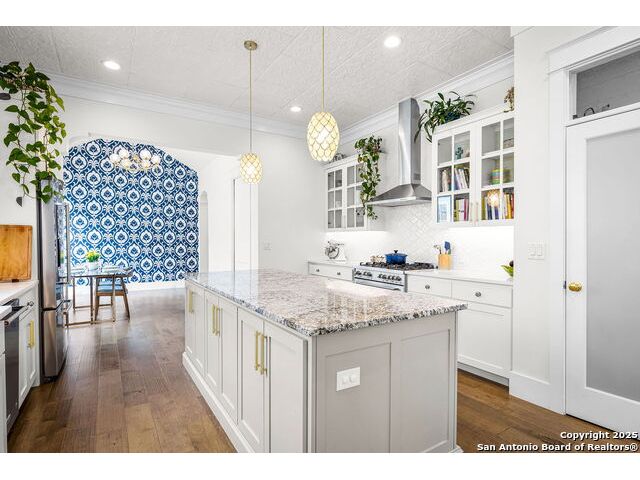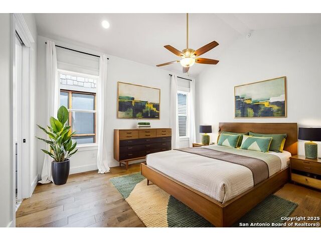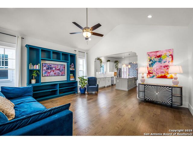 Experience the ultimate blend of luxury and small-town charm in this exquisite, single-story Williams-Hirsch custom home nestled in the coveted Town Creek neighborhood of New Braunfels. Boasting 3 bedrooms and 2 bathrooms, this custom-built retreat is just a leisurely stroll-or a quick golf-cart ride-to scenic Landa Park, the vibrant downtown square, and the community favorite, Das Rec. Step inside to soaring vaulted ceilings (17') gracing the living, dining, and master suite, all accentuated by elegant craftsman-style trim and thoughtful ceiling details. The heart of the home shines with a stunning stone island crowned by ample storage, perfectly framed by designer accents and open sight-lines. Every corner reflects impeccable craftsmanship-from the 10-foot ceilings in the secondary rooms to the air-conditioned garage that ensures year-round comfort. The versatile guest suite transforms effortlessly into a private office, featuring a floor-to-ceiling custom bookcase and a Murphy bed that tucks away neatly when not in use. And don't overlook the expansive, full-height attic that spans from the garage to the front facade-ideal for all your storage needs or ripe for finishing into an additional bedroom and bath. The plush green lawn features a white picket fence with flower boxes and vincas lining the entire front yard, all on automated drip lines and sprinkler systems for a hassle free beautifully landscaped low-maintenance yard. Don't miss your chance to own a contemporary gem in a walkable, amenity-rich setting-where every detail invites you home.