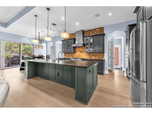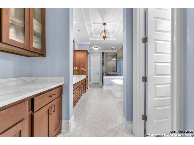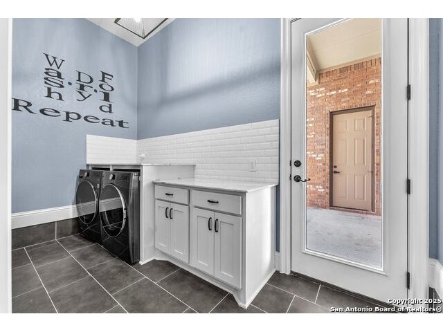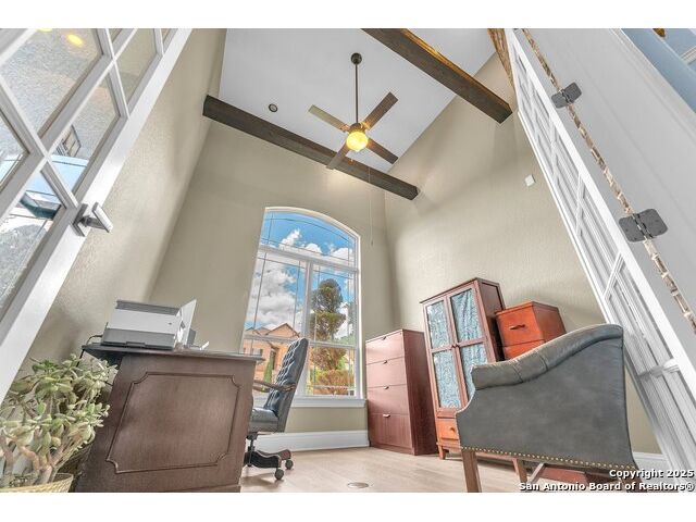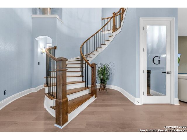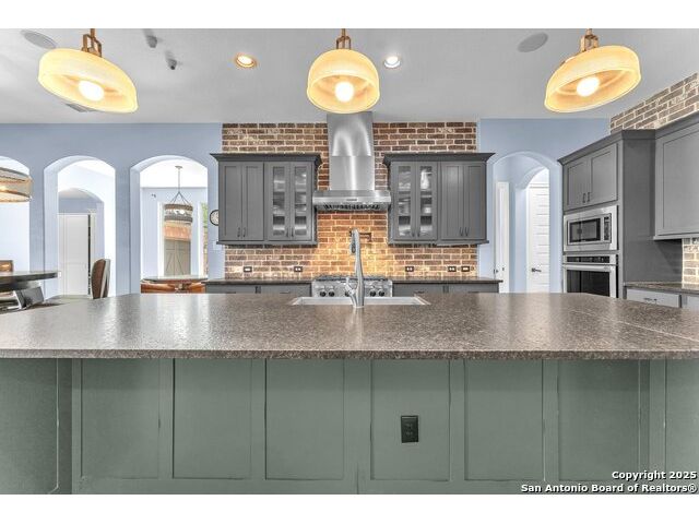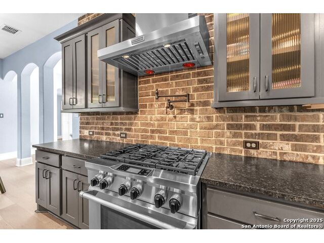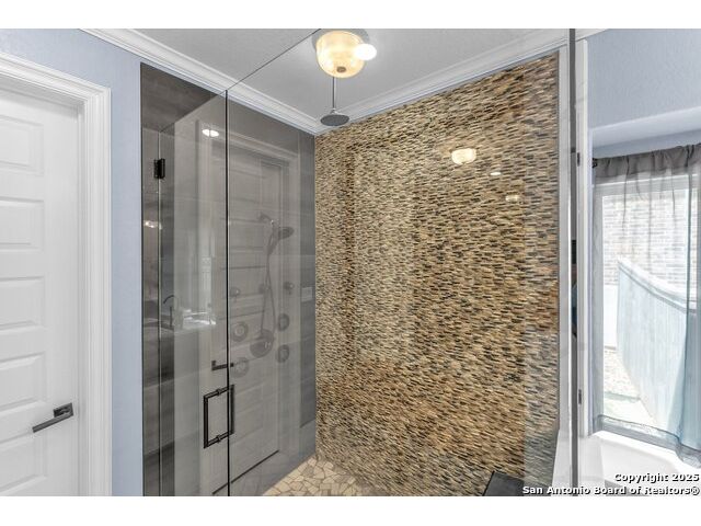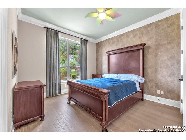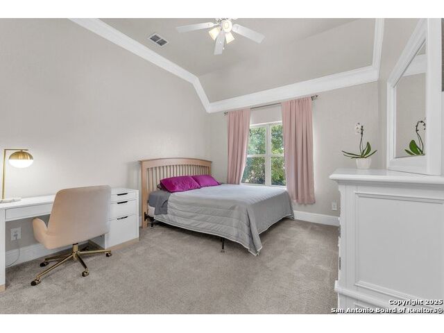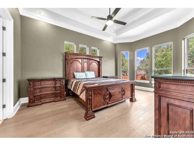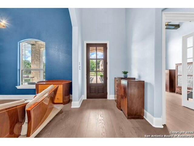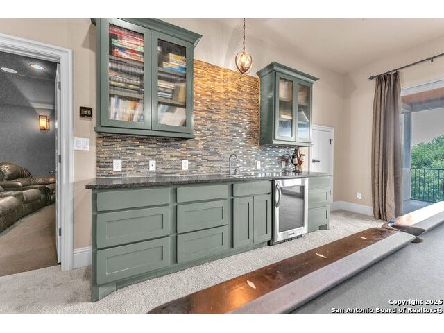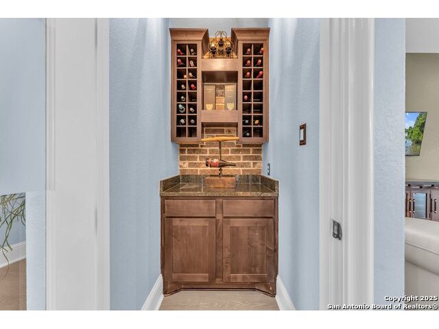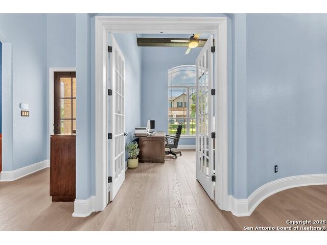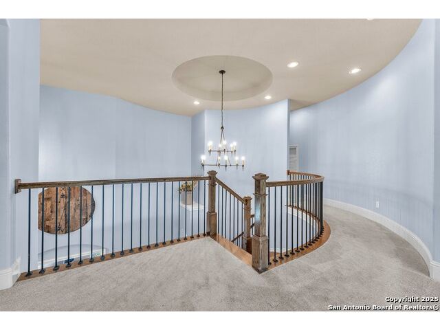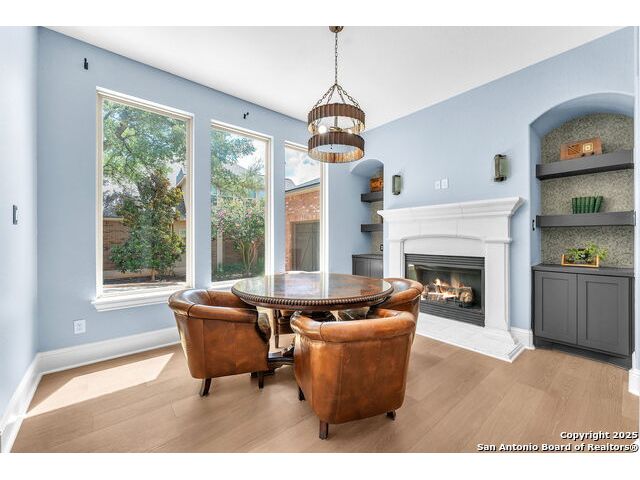 PRICE IMPROVEMENT + VA ASSUMPTION OPTION AVAILABLE! This stunning 5-bedroom, 5.5-bath former model home sits on a .45-acre lot in a gated community and offers a perfect blend of luxury, comfort, and functionality. Thoughtfully refreshed, the home features a brand-new roof, fresh interior paint, remodeled primary bathroom, new main-level flooring, and new carpet upstairs. The open-concept layout is ideal for entertaining, with a spacious family room and stone fireplace that opens to the gourmet kitchen featuring granite countertops, a 6-burner gas cooktop with pot filler, double ovens, two dishwashers, an oversized island, and a walk-in pantry. Additional main level spaces include a morning room with a second fireplace, formal dining room, wine and bar area, dedicated office, mudroom with built-in storage, and utility room with carport access. The main level also includes a private guest suite and a luxurious primary suite with serene views of mature oak trees, coffee bar, dual vanities, walk-in shower, garden tub, and a large walk-in closet. Upstairs, an elegant spiral staircase leads to a large game room with wet bar and access to a covered balcony, a media room with accent brick wall, and three generously sized secondary bedrooms, each with its own private bath and walk-in closet. Outdoor living is equally impressive with a covered patio, outdoor kitchen, and a spacious, fully fenced backyard shaded by mature oak trees, including one estimated to be over 100 years old. Parking is abundant with a two-car attached garage, one-car detached garage, carport, and extended driveway accommodating up to 12 cars. Located in a private gated community with neighborhood pool, park, and sports court, this home offers convenience with easy access to I-10, downtown Boerne, La Cantera, The Rim, and North San Antonio amenities. A rare opportunity, this property also offers a possible VA assumable loan subject to qualification and lender approval. Schedule your private showing today.
