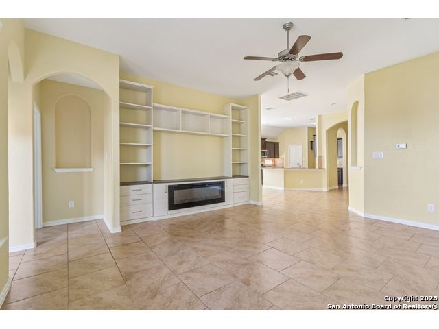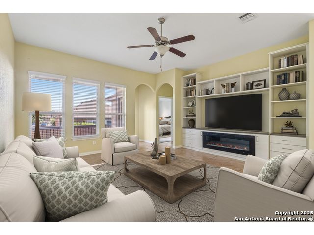 Located in the gated section of Johnson Ranch, this home offers added privacy and a sense of security. Inside, you'll find a spacious living room with a built-in bookcase and electric fireplace installed in 2024, creating a cozy and functional gathering space. A private study offers a quiet spot for work or reading. The kitchen is designed for everyday use with gas cooking, stainless steel appliances, stone countertops, and a large island with breakfast bar seating. The primary bedroom was fully remodeled in 2023 and features a walk-in closet with an organization system, along with a spa-like bath that includes a spacious shower and garden tub. Additional updates include new carpet throughout the home (2023), a storage cabinet in the laundry room (2023), and garage floor epoxy (2022). Johnson Ranch offers a 5-acre amenity park with a walking trail, swimming pool, sports court, and playground, ideal for outdoor enjoyment. Conveniently located off the 281 corridor and close to Hwy 46, this home puts you within easy reach of shopping, schools and more, including popular destinations such as Canyon Lake, New Braunfels, Boerne, Fredericksburg. Book your personal tour today!