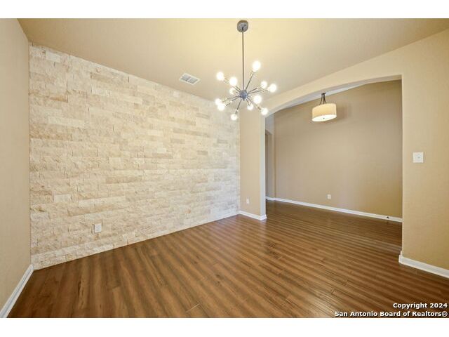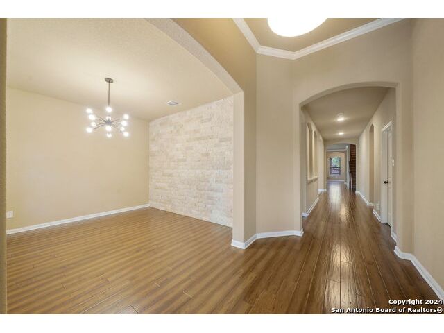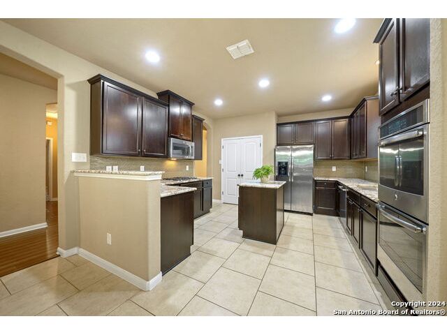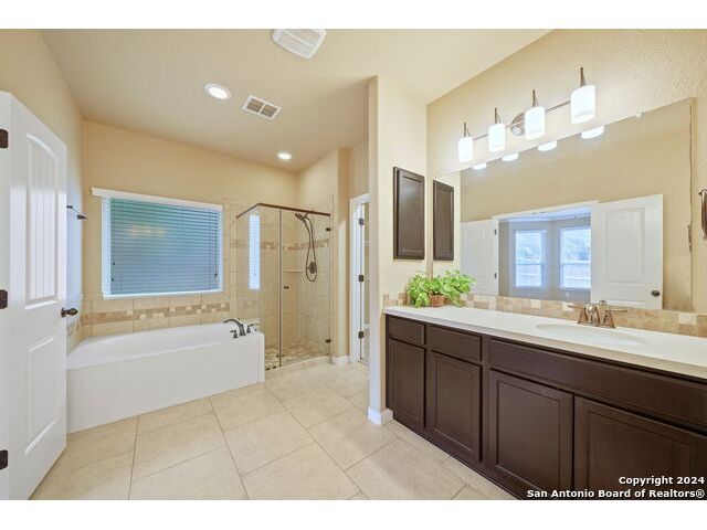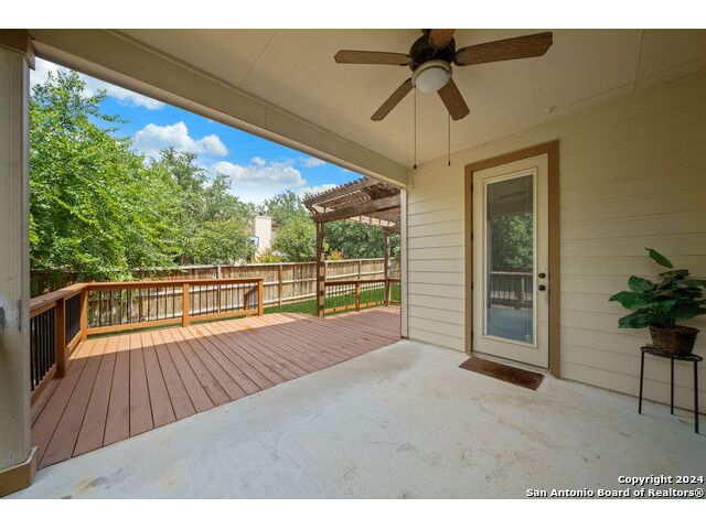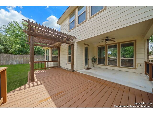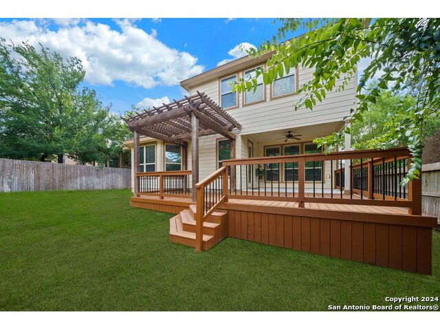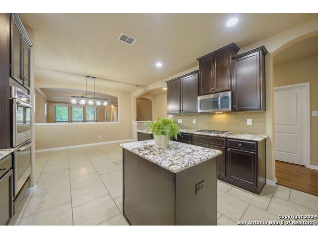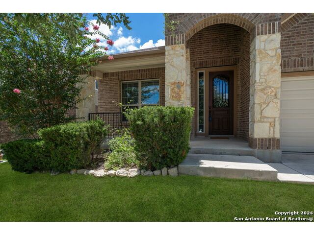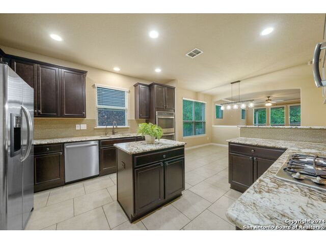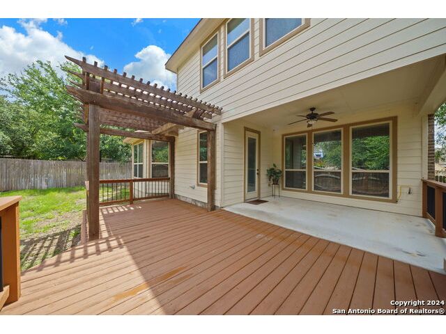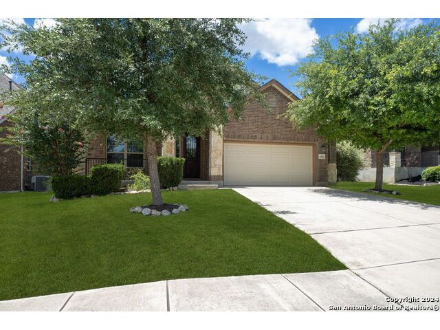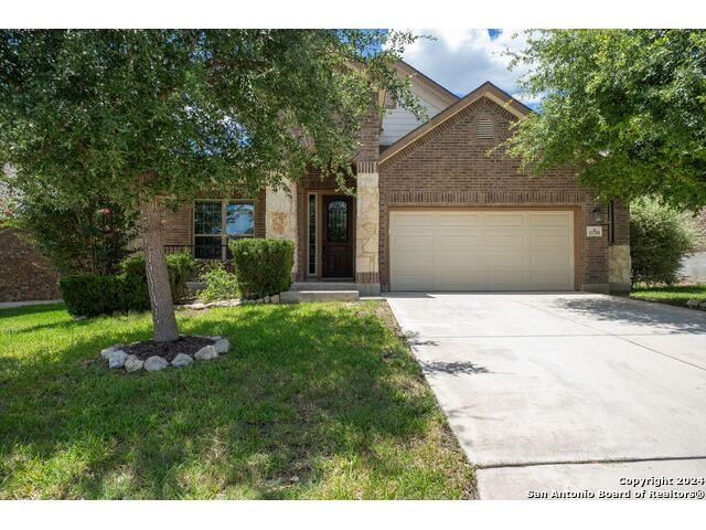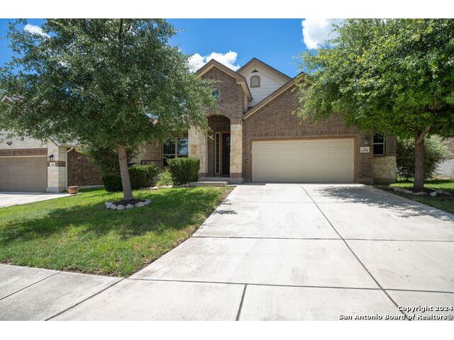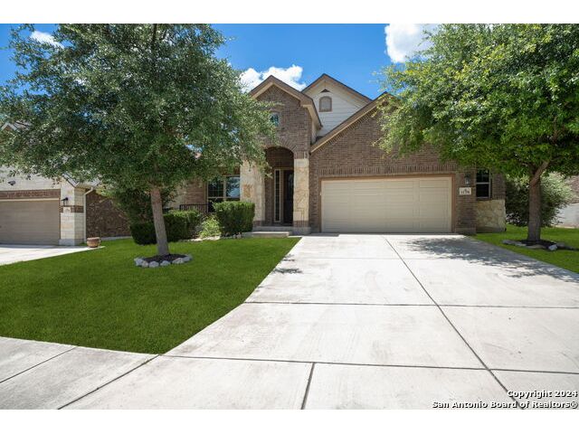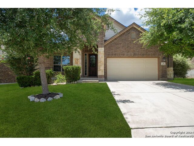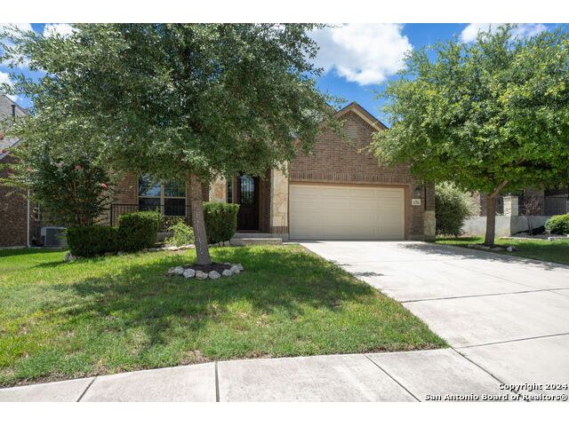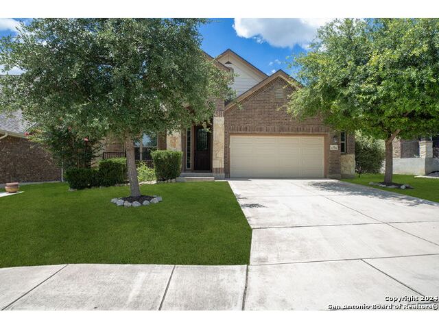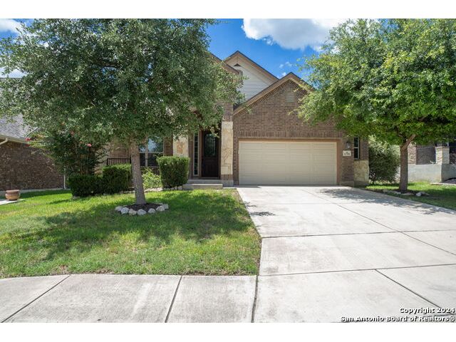 Discover an executive-style home now available in the highly sought-after Alamo Ranch subdivision in San Antonio, TX. As you enter the expansive foyer, you are greeted by a formal dining area featuring a modern chandelier and a stylish masonry accent wall. The chef's kitchen, located just past the main entry, is a culinary dream with its granite countertops, tiled backsplash, gas cooktop, double ovens, upgraded cabinetry, large island, and matching stainless steel appliances. An eat-in breakfast area adds to the kitchen's appeal. The spacious family room boasts hardwood floors that flow throughout the downstairs common areas. The master bedroom, conveniently located on the main floor, includes a full en-suite bathroom with separate vanities, a garden tub, a separate shower, and a large walk-in closet. Two additional bedrooms, also on the main floor, are equipped with ceiling fans for added comfort. Upstairs, you'll find an expansive game room and an additional bathroom, making this home perfect for all your needs. The large covered patio and extended deck with a pergola in the backyard provide an ideal space for enjoying your morning coffee or hosting weekend BBQs. Alamo Ranch offers top-quality amenities, including a large pool with a lap section, a children's splash pool, playgrounds, a basketball court, and much more. This home is a pleasure to show and will impress any potential buyer.