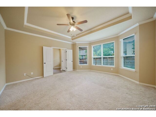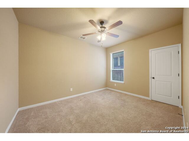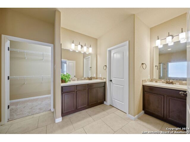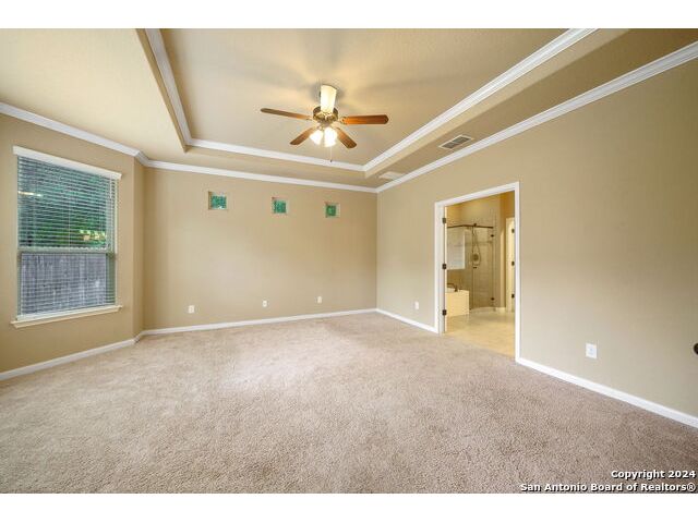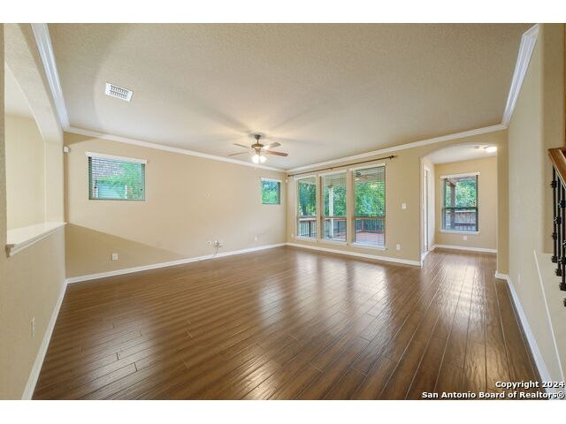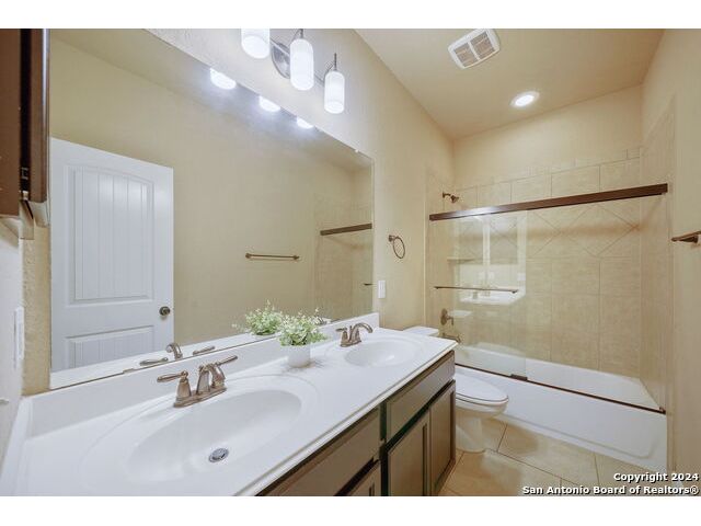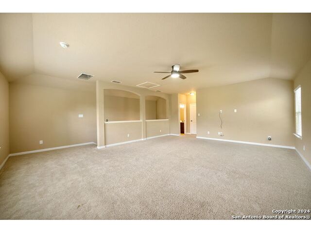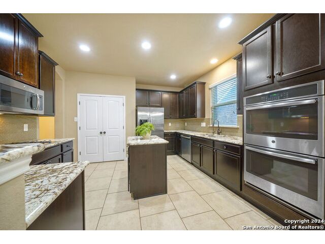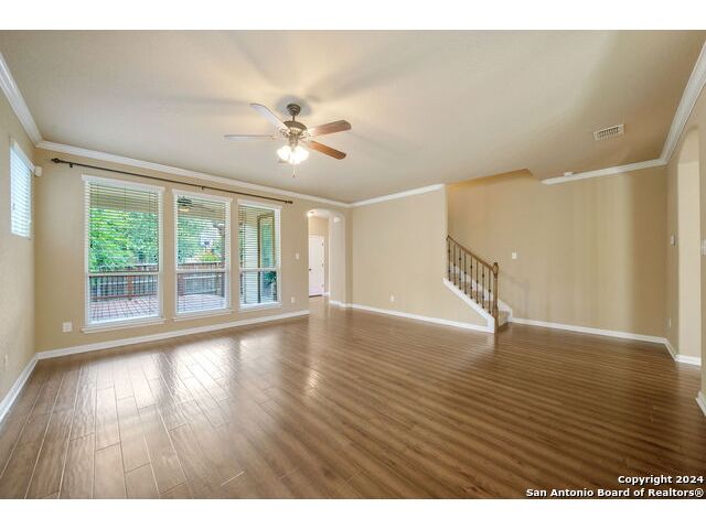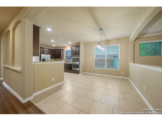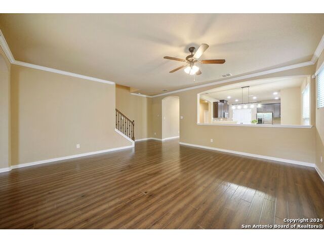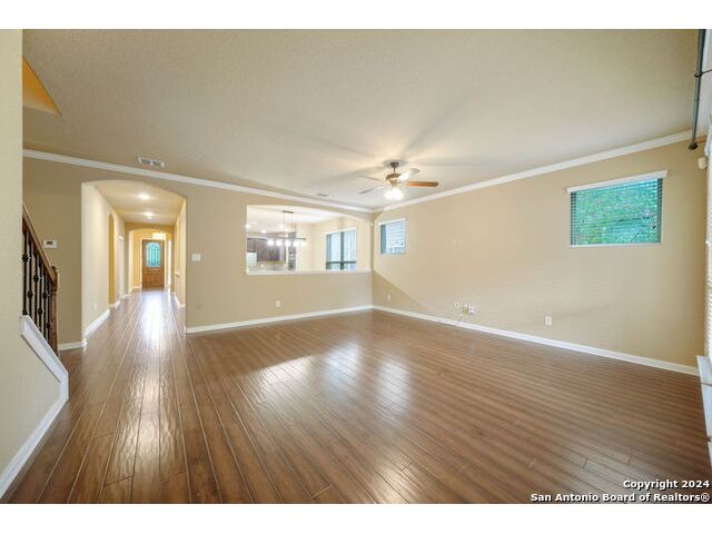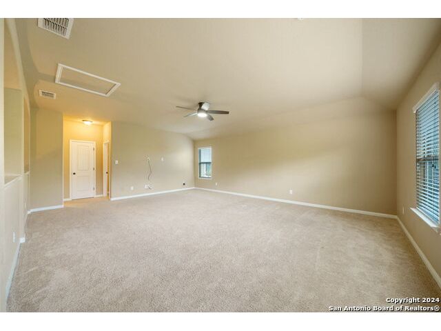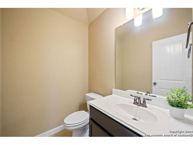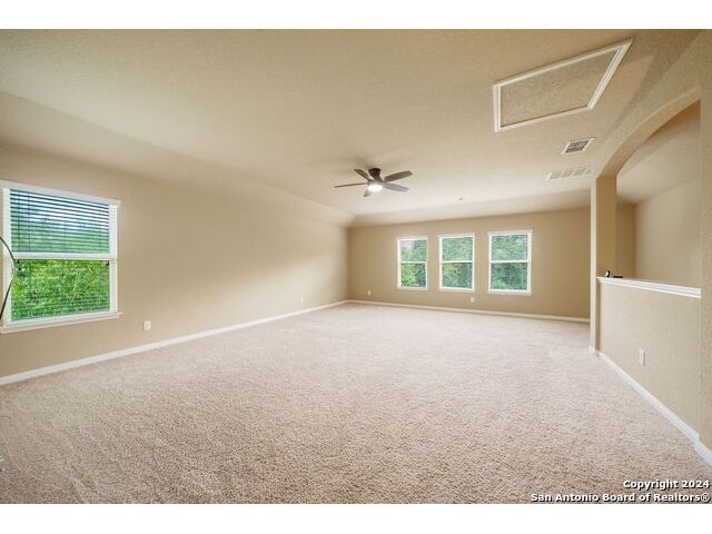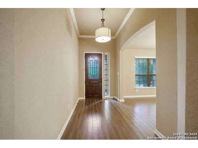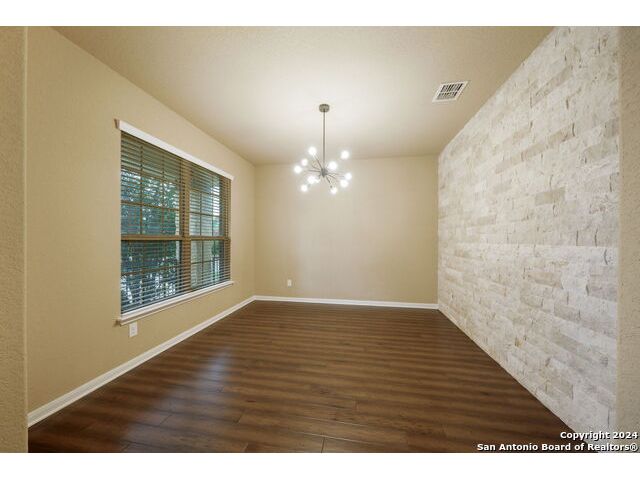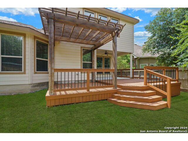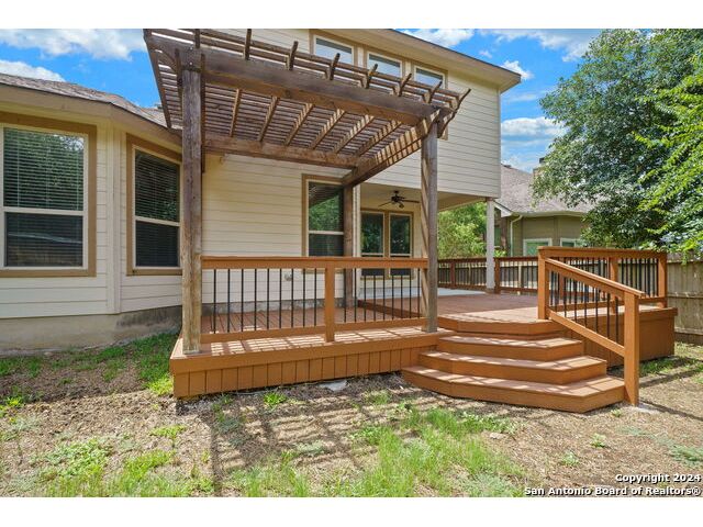 Discover an executive-style home now available in the highly sought-after Alamo Ranch subdivision in San Antonio, TX. As you enter the expansive foyer, you are greeted by a formal dining area featuring a modern chandelier and a stylish masonry accent wall. The chef's kitchen, located just past the main entry, is a culinary dream with its granite countertops, tiled backsplash, gas cooktop, double ovens, upgraded cabinetry, large island, and matching stainless steel appliances. An eat-in breakfast area adds to the kitchen's appeal. The spacious family room boasts hardwood floors that flow throughout the downstairs common areas. The master bedroom, conveniently located on the main floor, includes a full en-suite bathroom with separate vanities, a garden tub, a separate shower, and a large walk-in closet. Two additional bedrooms, also on the main floor, are equipped with ceiling fans for added comfort. Upstairs, you'll find an expansive game room and an additional bathroom, making this home perfect for all your needs. The large covered patio and extended deck with a pergola in the backyard provide an ideal space for enjoying your morning coffee or hosting weekend BBQs. Alamo Ranch offers top-quality amenities, including a large pool with a lap section, a children's splash pool, playgrounds, a basketball court, and much more. This home is a pleasure to show and will impress any potential buyer.