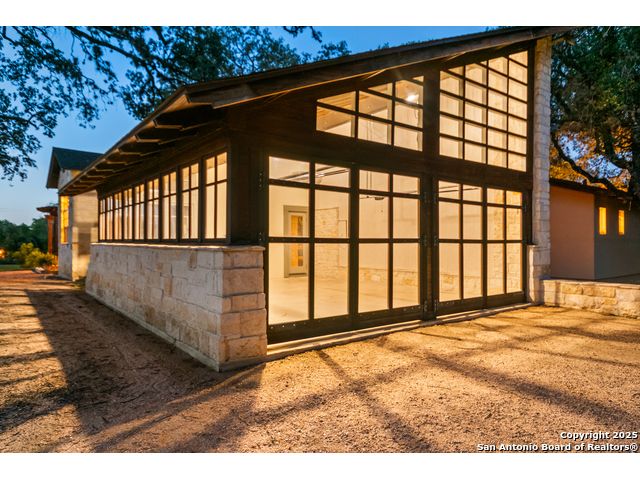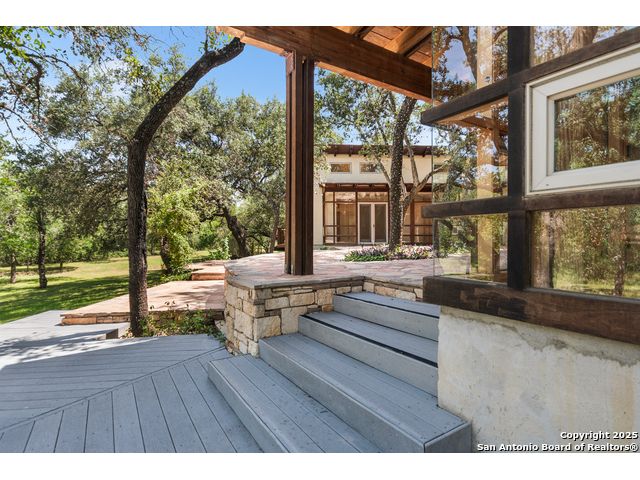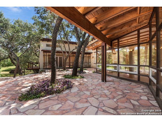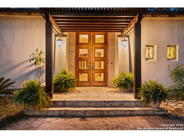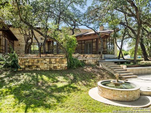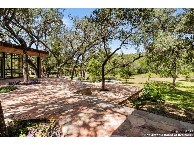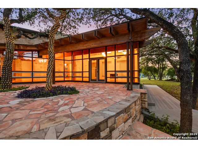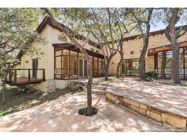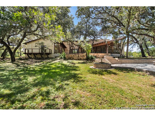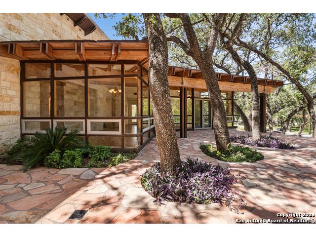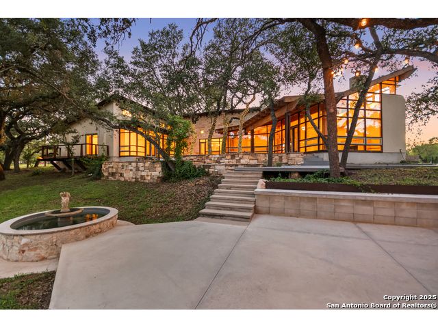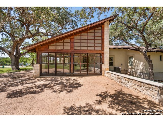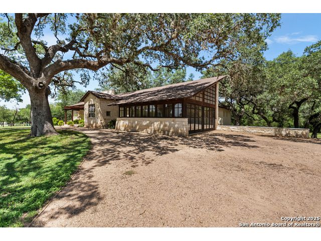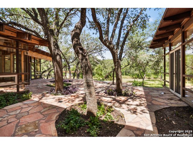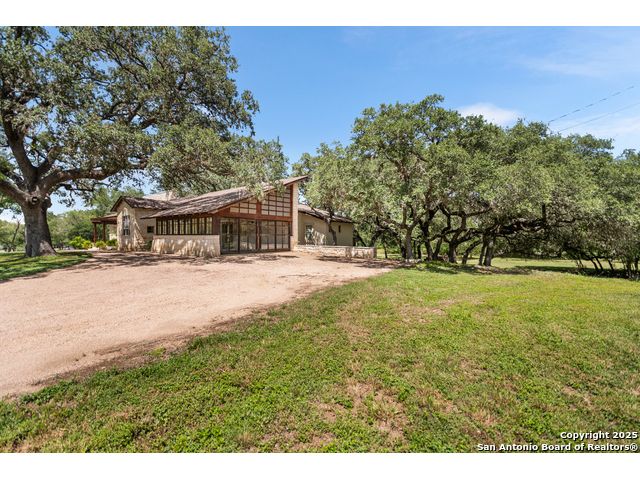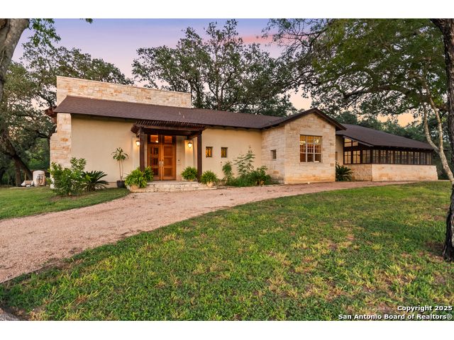 This exquisite home on the edge of San Antonio is One of One. Take refuge on an otherworldly site located on 2.5 acres of ranch-style land with unobstructed views of the hundreds of mature oaks, cypress, pecans and elms. This private ideal has a panoramic view of the landscape far and wide. Artisans built the house over years doing one-of-a-kind, hand-made projects. The exterior walls are limestone or stucco with ipe cladding. Every room, every angle, everywhere you look, there is a unique, handmade piece that adds to the home's character. Designed by architect Steve Stumpff, the 2424 square foot, one level home is an architectural masterpiece. The home's focus is to the east, the views, the privacy, the trees, the flagstone patio and the entertainment space under the tree's canopies. It is a delight to sit out on the patio in the evening to enjoy the stunning sky or fireflies' light show. This stunning home is a gorgeous light-filled structure of exposed rafters, steel connectors, and structural insulated panels. Every room has Texas limestone walls for structure, ambiance and texture. You are greeted with repurposed dual front doors that were one time used on the University of Texas at Austin campus. The living room has vaulted ceilings and a wood burning fireplace surrounded by lueders limestone. Functional kitchen with center island facing your patio for the perfect view. Primary bedroom also has a vaulted ceiling with patio access and a deck made from cumaru and ipe. For guests, there are two secondary bedrooms and a full bath. The two-car garage is a showpiece with custom-made carriage doors and a myriad of windows. The grounds have all native plantings and a landscape of native prairie grasses and trees. This solid, well-built home is turn-key and awaits your curation of art and furniture, suitable for an Architectural Digest feature.