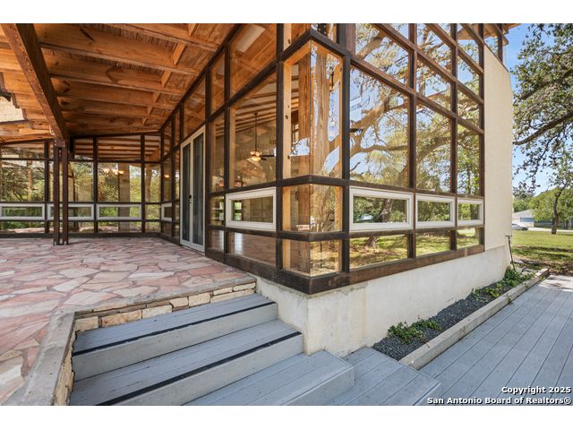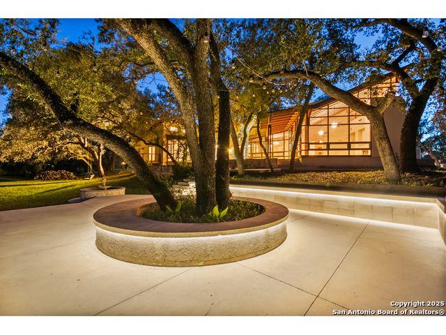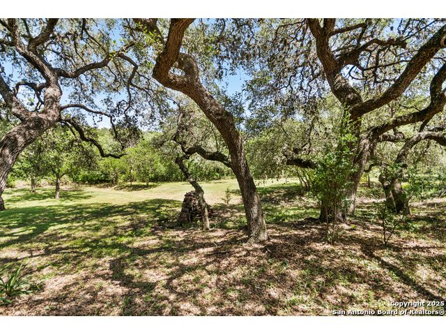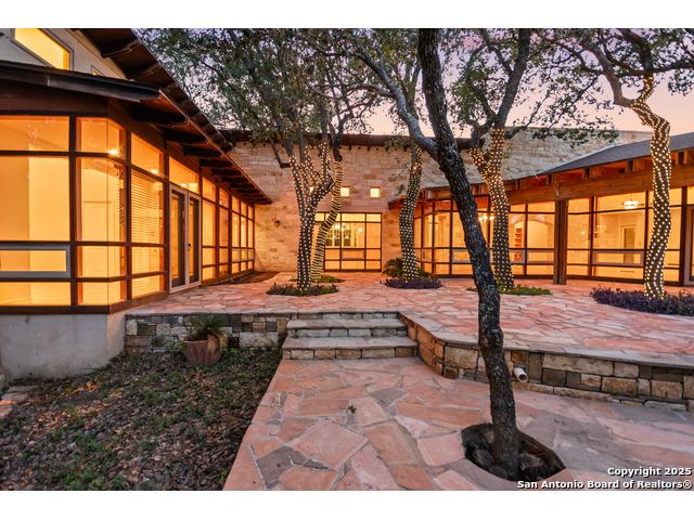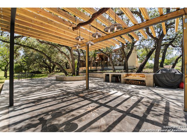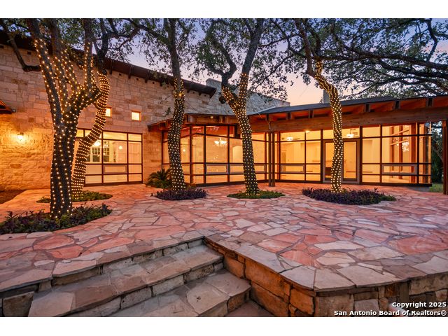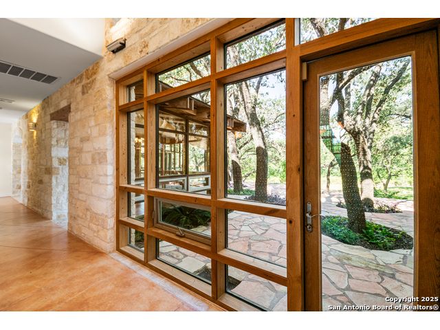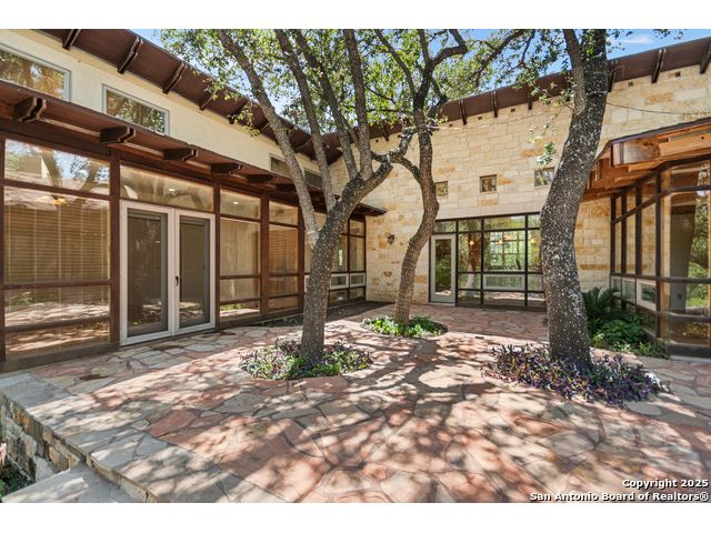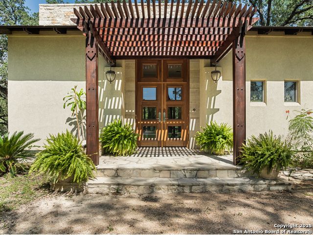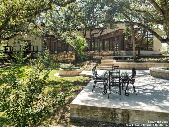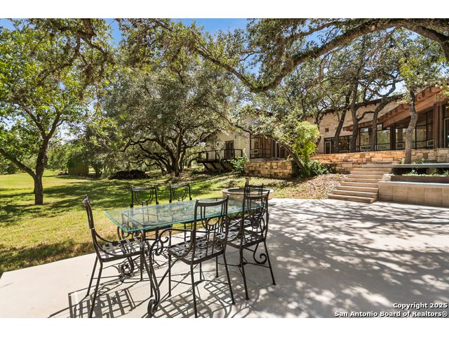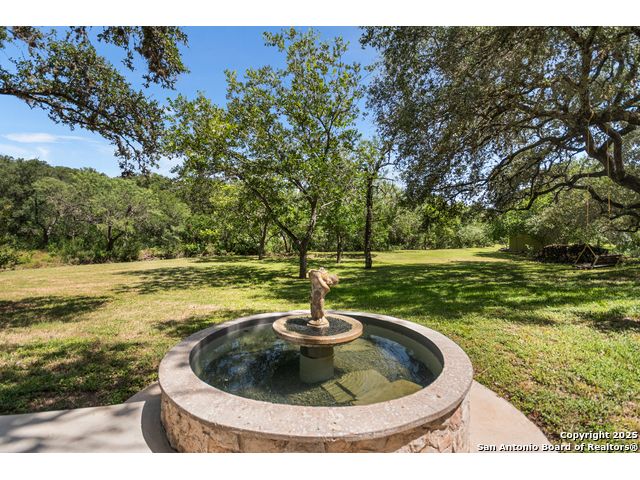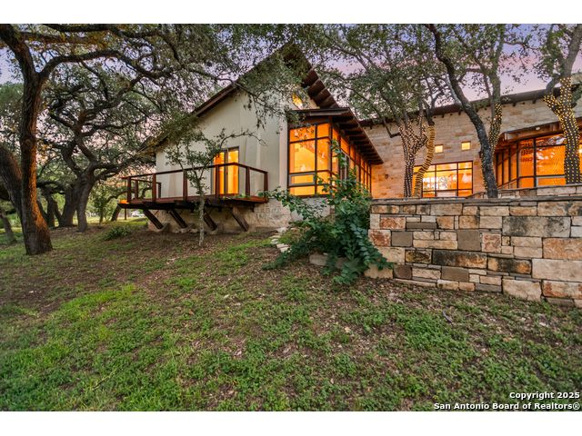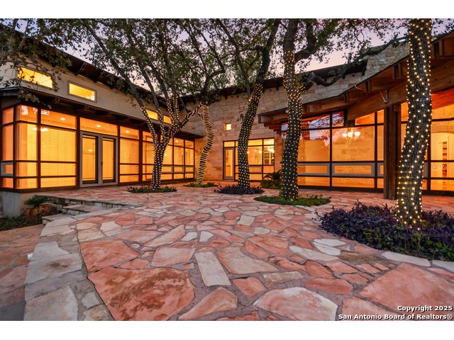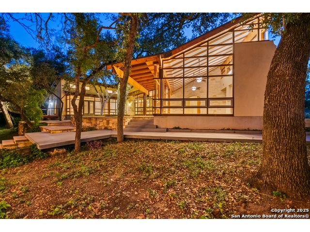 This exquisite home on the edge of San Antonio is One of One. Take refuge on an otherworldly site located on 2.5 acres of ranch-style land with unobstructed views of the hundreds of mature oaks, cypress, pecans and elms. This private ideal has a panoramic view of the landscape far and wide. Artisans built the house over years doing one-of-a-kind, hand-made projects. The exterior walls are limestone or stucco with ipe cladding. Every room, every angle, everywhere you look, there is a unique, handmade piece that adds to the home's character. Designed by architect Steve Stumpff, the 2424 square foot, one level home is an architectural masterpiece. The home's focus is to the east, the views, the privacy, the trees, the flagstone patio and the entertainment space under the tree's canopies. It is a delight to sit out on the patio in the evening to enjoy the stunning sky or fireflies' light show. This stunning home is a gorgeous light-filled structure of exposed rafters, steel connectors, and structural insulated panels. Every room has Texas limestone walls for structure, ambiance and texture. You are greeted with repurposed dual front doors that were one time used on the University of Texas at Austin campus. The living room has vaulted ceilings and a wood burning fireplace surrounded by lueders limestone. Functional kitchen with center island facing your patio for the perfect view. Primary bedroom also has a vaulted ceiling with patio access and a deck made from cumaru and ipe. For guests, there are two secondary bedrooms and a full bath. The two-car garage is a showpiece with custom-made carriage doors and a myriad of windows. The grounds have all native plantings and a landscape of native prairie grasses and trees. This solid, well-built home is turn-key and awaits your curation of art and furniture, suitable for an Architectural Digest feature.