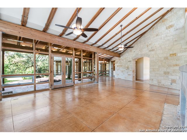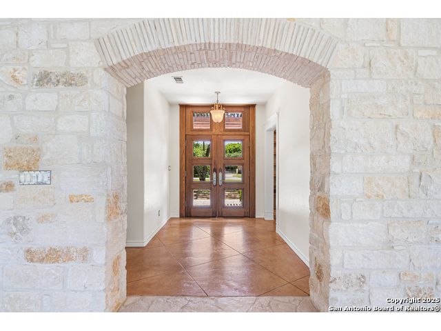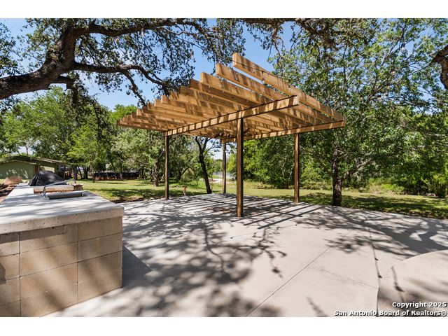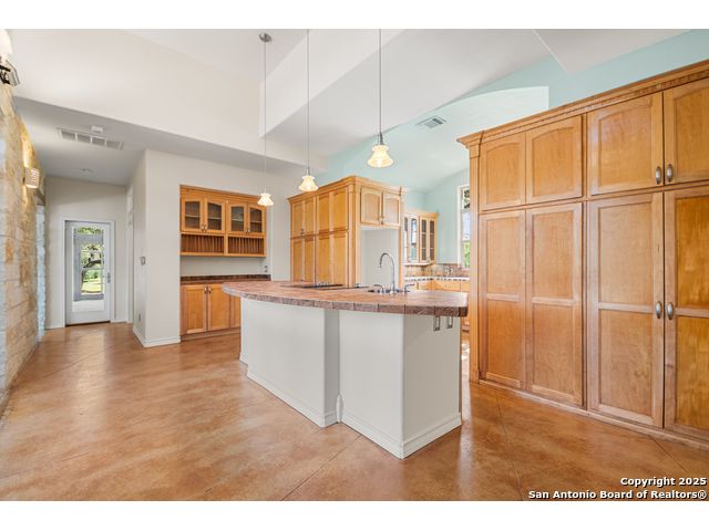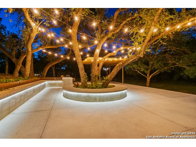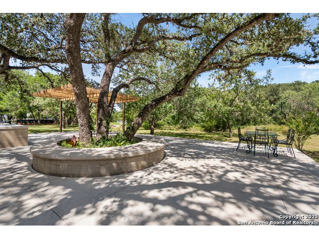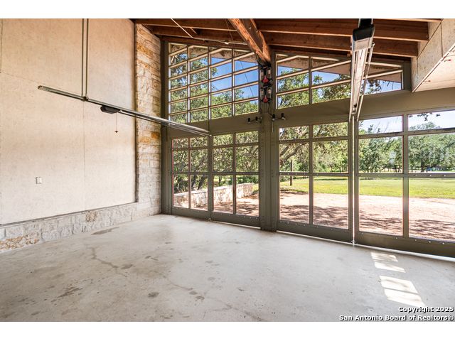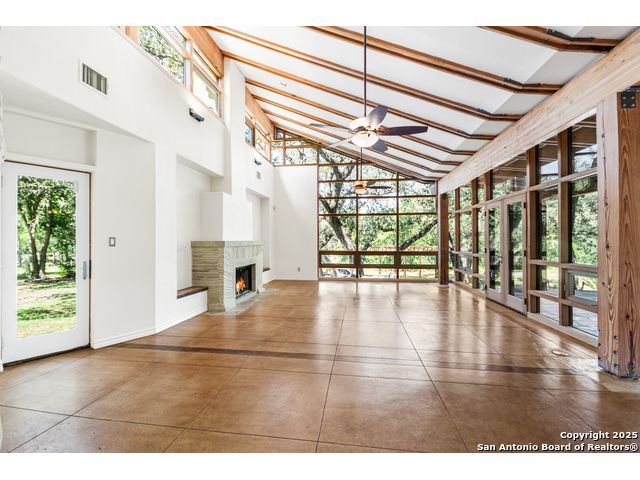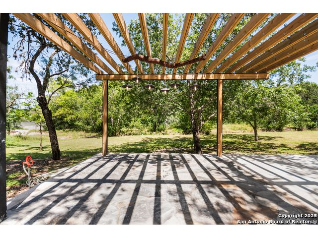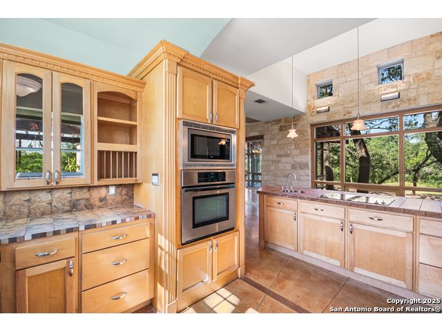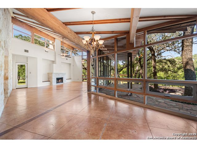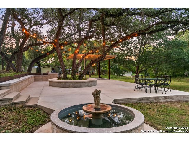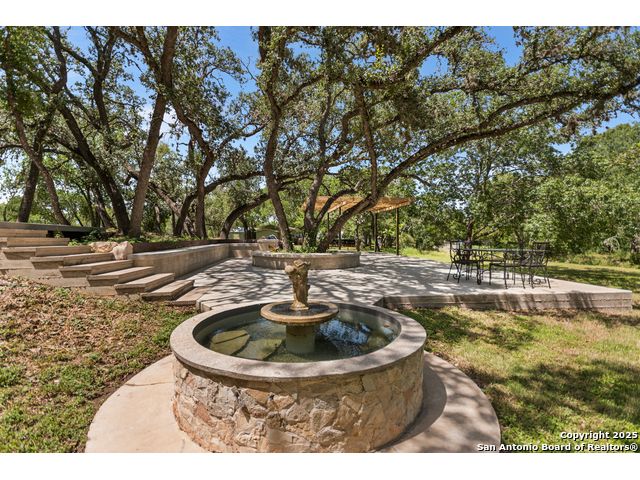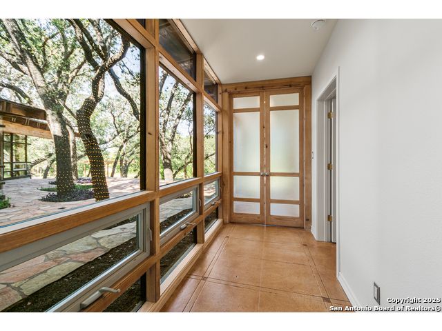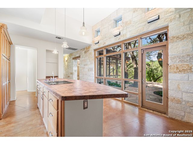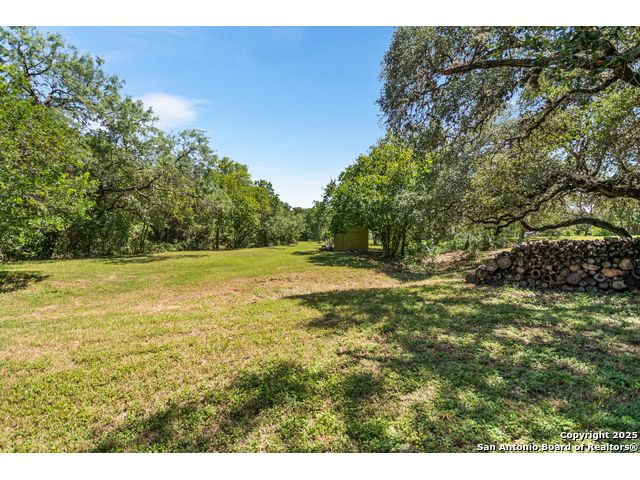 This exquisite home on the edge of San Antonio is One of One. Take refuge on an otherworldly site located on 2.5 acres of ranch-style land with unobstructed views of the hundreds of mature oaks, cypress, pecans and elms. This private ideal has a panoramic view of the landscape far and wide. Artisans built the house over years doing one-of-a-kind, hand-made projects. The exterior walls are limestone or stucco with ipe cladding. Every room, every angle, everywhere you look, there is a unique, handmade piece that adds to the home's character. Designed by architect Steve Stumpff, the 2424 square foot, one level home is an architectural masterpiece. The home's focus is to the east, the views, the privacy, the trees, the flagstone patio and the entertainment space under the tree's canopies. It is a delight to sit out on the patio in the evening to enjoy the stunning sky or fireflies' light show. This stunning home is a gorgeous light-filled structure of exposed rafters, steel connectors, and structural insulated panels. Every room has Texas limestone walls for structure, ambiance and texture. You are greeted with repurposed dual front doors that were one time used on the University of Texas at Austin campus. The living room has vaulted ceilings and a wood burning fireplace surrounded by lueders limestone. Functional kitchen with center island facing your patio for the perfect view. Primary bedroom also has a vaulted ceiling with patio access and a deck made from cumaru and ipe. For guests, there are two secondary bedrooms and a full bath. The two-car garage is a showpiece with custom-made carriage doors and a myriad of windows. The grounds have all native plantings and a landscape of native prairie grasses and trees. This solid, well-built home is turn-key and awaits your curation of art and furniture, suitable for an Architectural Digest feature.