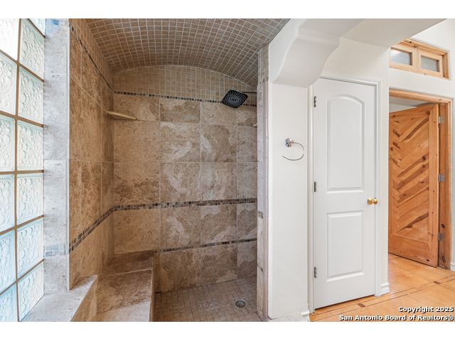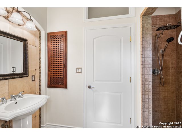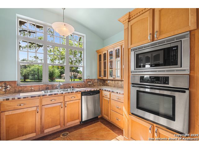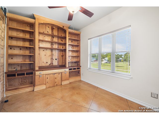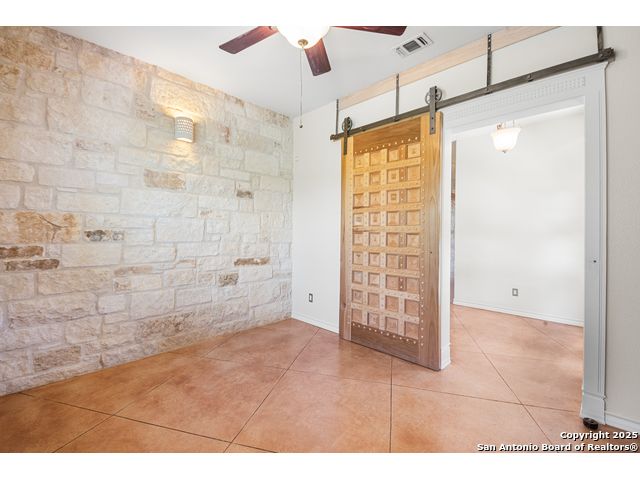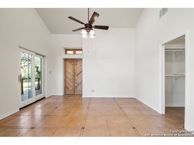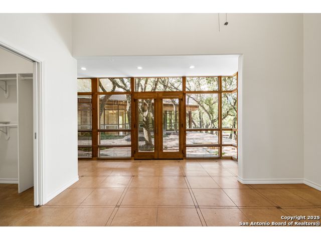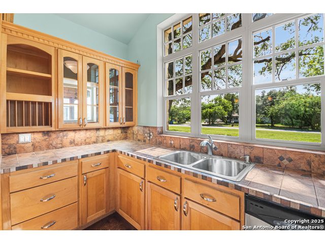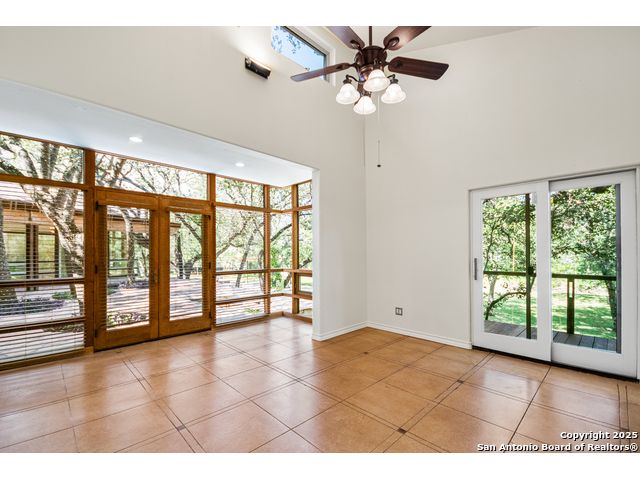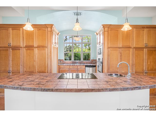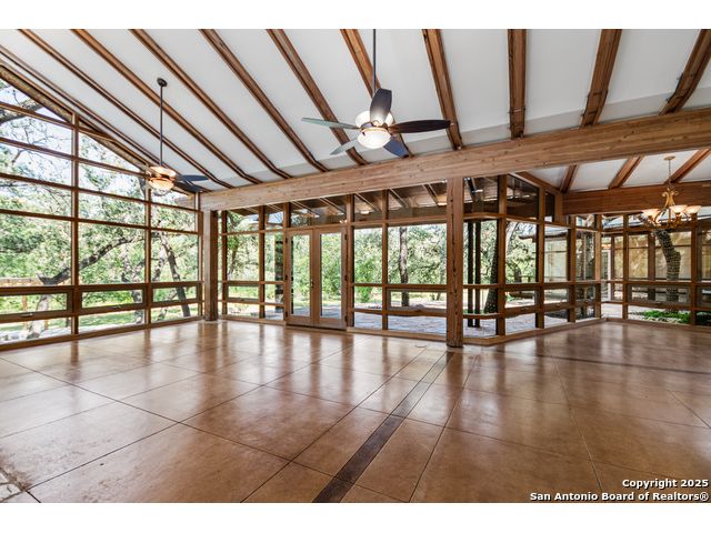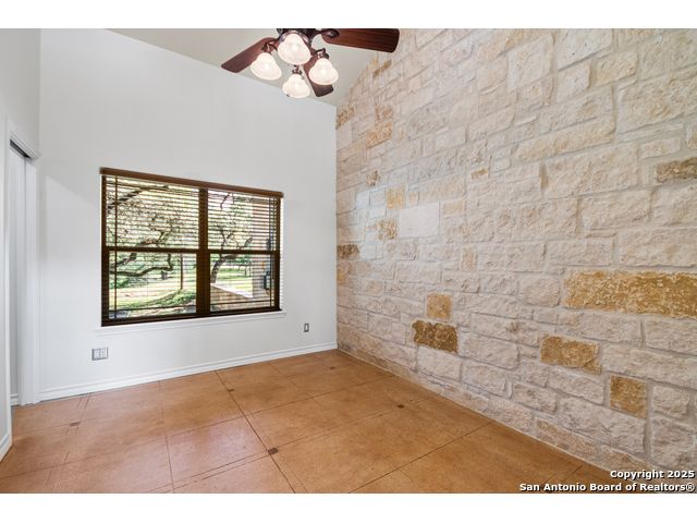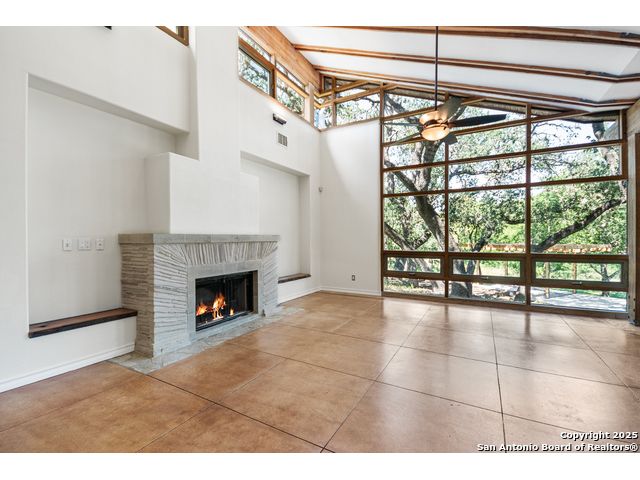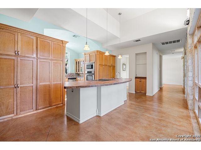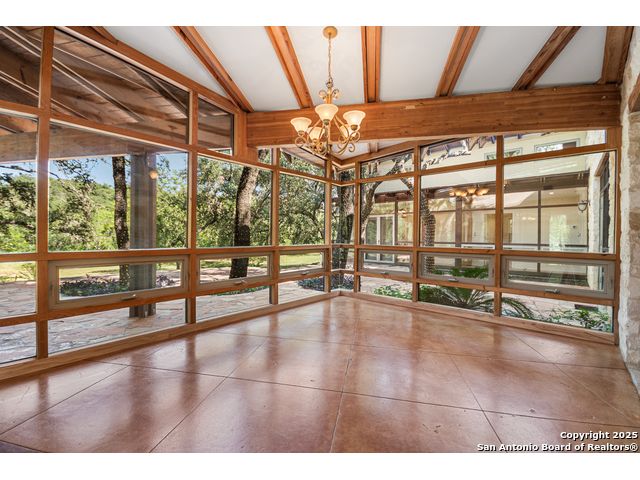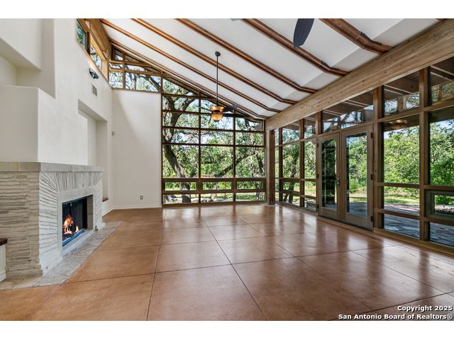 This exquisite home on the edge of San Antonio is One of One. Take refuge on an otherworldly site located on 2.5 acres of ranch-style land with unobstructed views of the hundreds of mature oaks, cypress, pecans and elms. This private ideal has a panoramic view of the landscape far and wide. Artisans built the house over years doing one-of-a-kind, hand-made projects. The exterior walls are limestone or stucco with ipe cladding. Every room, every angle, everywhere you look, there is a unique, handmade piece that adds to the home's character. Designed by architect Steve Stumpff, the 2424 square foot, one level home is an architectural masterpiece. The home's focus is to the east, the views, the privacy, the trees, the flagstone patio and the entertainment space under the tree's canopies. It is a delight to sit out on the patio in the evening to enjoy the stunning sky or fireflies' light show. This stunning home is a gorgeous light-filled structure of exposed rafters, steel connectors, and structural insulated panels. Every room has Texas limestone walls for structure, ambiance and texture. You are greeted with repurposed dual front doors that were one time used on the University of Texas at Austin campus. The living room has vaulted ceilings and a wood burning fireplace surrounded by lueders limestone. Functional kitchen with center island facing your patio for the perfect view. Primary bedroom also has a vaulted ceiling with patio access and a deck made from cumaru and ipe. For guests, there are two secondary bedrooms and a full bath. The two-car garage is a showpiece with custom-made carriage doors and a myriad of windows. The grounds have all native plantings and a landscape of native prairie grasses and trees. This solid, well-built home is turn-key and awaits your curation of art and furniture, suitable for an Architectural Digest feature.