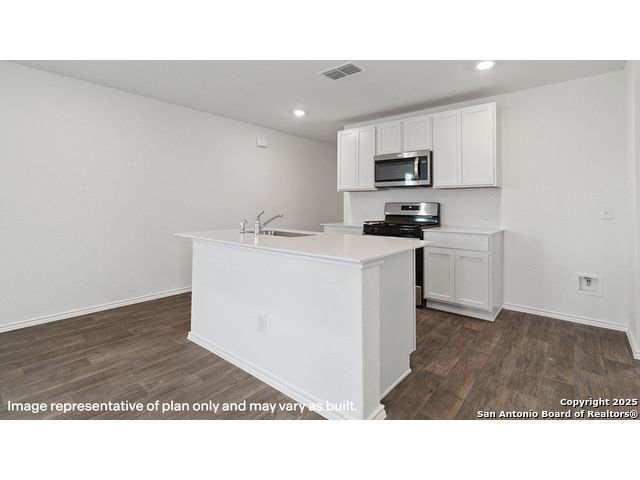 The Estero is a charming one-story home featured in Lucero in San Antonio, TX. Featuring 2 classic front exteriors, this 4 bedroom, 2 bathroom home also offers 1586 square feet of living space and a 2-car garage. A front porch (per plan) welcomes you into the home and opens to the gourmet kitchen which includes quartz counter tops, shaker style cabinets, stainless steel appliances and an open concept floorplan with the kitchen flowing seamlessly into the dining room and living room. The main bedroom has an attractive ensuite bathroom that features a quartz vanity countertop, shaker style cabinetry and a spacious tiled walk-in shower. Enjoy additional storage with a large walk-in closet in the primary bedroom. Your secondary bedrooms all feature quality carpet flooring and a closet, and can be used as bedrooms, offices, work out spaces or other bonus rooms. The possibilities are endless with The Estero floor plan. Additional features include sheet vinyl flooring in entry, living room, and all wet areas, quartz counter tops in all bathrooms and HOME IS CONNECTED base package. Using one central hub that talks to all the devices in your home, you can control the lights, thermostat and locks, all from your cellular device.