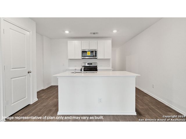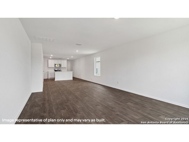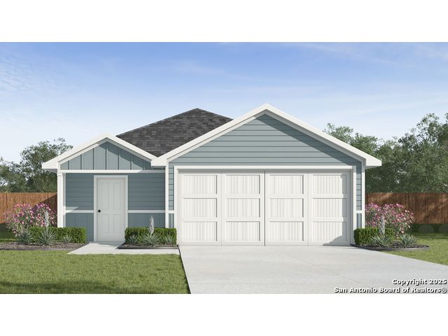 The Caprock is a charming one-story home featured at Lucero in San Antonio, TX. Featuring 2 classic front exteriors, this 3 bedroom, 2 bathroom home also offers 1435 square feet of living space and a 2-car garage. A front porch (per plan) welcomes you into the home and opens to the gourmet kitchen which includes quartz counter tops, quality cabinets, stainless steel appliances and an open concept floorplan with the kitchen flowing seamlessly into the dining room and living room. The main bedroom has an attractive ensuite bathroom that features a quartz vanity countertop and quality cabinetry. Enjoy additional storage with a spacious walk-in closet located off of the primary bathroom. Your secondary bedrooms all feature quality carpet flooring and a closet, and can be used as bedrooms, offices, work out spaces or other bonus rooms. The possibilities are endless with The Caprock floor plan. Additional features include sheet vinyl flooring in entry, living room, and all wet areas, quartz counter tops in all bathrooms and HOME IS CONNECTED base package. Using one central hub that talks to all the devices in your home, you can control the lights, thermostat and locks, all from your cellular device.